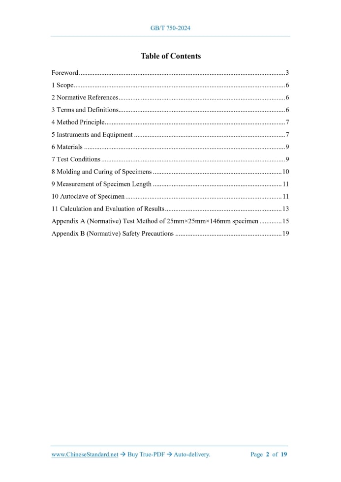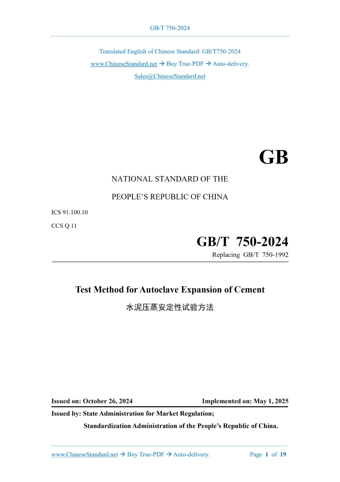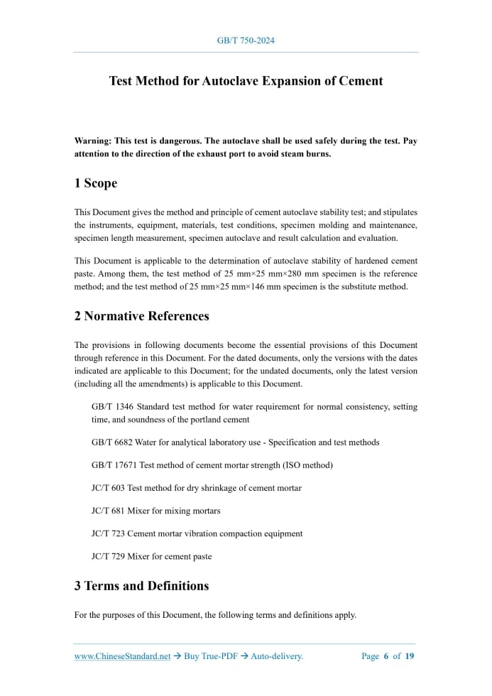 GB/T 750-2024: Test method for autoclave expansion of cement---This is an excerpt. Full copy of true-PDF in English version (including equations, symbols, images, flow-chart, tables, and figures etc.), auto-downloaded/delivered in 9 seconds, can be purchased online: https://www.ChineseStandard.net/PDF.aspx/GBT750-2024GB NATIONAL STANDARD OF THE PEOPLE’S REPUBLIC OF CHINA ICS 91.100.10 CCS Q 11 Replacing GB/T 750-1992 Test Method for Autoclave Expansion of Cement Issued on. OCTOBER 26, 2024 Implemented on. MAY 1, 2025 Issued by. State Administration for Market Regulation; Standardization Administration of the People’s Republic of China. Table of ContentsForeword... 3 1 Scope... 6 2 Normative References... 6 3 Terms and Definitions... 6 4 Method Principle... 7 5 Instruments and Equipment... 7 6 Materials... 9 7 Test Conditions... 9 8 Molding and Curing of Specimens... 10 9 Measurement of Specimen Length... 11 10 Autoclave of Specimen... 11 11 Calculation and Evaluation of Results... 13 Appendix A (Normative) Test Method of 25mm×25mm×146mm specimen... 15 Appendix B (Normative) Safety Precautions... 19ForewordThis Document was drafted as per the rules specified in GB/T 1.1-2020 Directives for Standardization – Part 1.Rules for the Structure and Drafting of Standardizing Documents. This Document replaced GB/T 750-1992 Method for Soundness of Portland Cement. Compared with GB/T 750-1992, the major technical changes of this Document are as follows besides structural adjustments and editorial modifications. a) Change the requirements for mixers (see 5.1 of this Edition; 5.2 of the 1992 Edition); b) Change the requirements for test molds (see 5.2 of this Edition; 5.1 of the 1992 Edition); c) Change the requirements for autoclaves (see 5.5 of this Edition; 5.4 of the 1992 Edition); d) Add the requirements for temperature measuring devices (see 5.6 of this Edition); e) Change the requirements for comparators (see 5.8 of this Edition; 5.1 of the 1992 Edition); f) Delete the requirements for the boiling stability of the specimen (see 6.2 of the 1992 Edition); g) Change the molding operation steps for the specimen (see 8.3 of this Edition; 8.3 of the 1992 Edition); h) Delete the boiling steps for the specimen (see Clause 9, A.4 of the 1992 Edition); i) Add the operating steps for sealing the autoclave (see 10.1 of this Edition); j) Change the autoclave operation procedure for the specimen (see Clause 10 of this Edition; Clause 10 of the 1992 Edition); k) Change the conformity assessment (see 11.3 of this Edition; 11.2 of the 1992 Edition). Please note some contents of this Document may involve patents. The issuing agency of this Document shall not assume the responsibility to identify these patents. This Document was proposed by China Building Materials Federation. This Document shall be under the jurisdiction of National Technical Committee on Cement of Standardization Administration of China (SAC/TC 184). Drafting organizations of this Document. China Building Materials Academy Co., Ltd.; Nanping Wusha Expressway Co., Ltd.; Anhui Conch Cement Company Limited; China Railway Construction Group East China Engineering Co., Ltd.; China Three Gorges Construction Engineering Corporation; Wafangdian Jianke Experimental Instrument Manufacturing Co., Ltd.; Yunnan Building Materials Product Quality Inspection Institute; Ningxia Zhongce Metrology Testing and Inspection Institute (Co., Ltd.); Xinjiang Hengtai Zhuyuan New Building Materials Co., Ltd.; Hubei Water Resources Research Institute; JSTI Group Co., Ltd.; Alaer Zhejian New Building Materials Group Co., Ltd.; China Railway Construction Group Co., Ltd.; Jiangshan Hejiashan Cement Co., Ltd.; Jiangsu Hengshan Southern Cement Co., Ltd.; Gezhouba Yicheng Cement Co., Ltd.; Fuzhou University; Chendu Institute of product Quality Inspection Co., Ltd.; China Communications (Guangzhou) Construction Co., Ltd.; Shandong Junhong Environmental Protection Technology Co., Ltd.; Jiangxi Building Materials Research and Design Institute Co., Ltd.; Inner Mongolia Jidong Cement Co., Ltd.; Yinan Zhonglian Cement Co., Ltd.; Rizhao Urban Investment Group Construction Development Co., Ltd.; Shanghai Research Institute of Building Sciences Co., Ltd.; Shaanxi Zhengchuang Engineering Testing Co., Ltd.; Anhui Kaiyuan Road and Bridge Co., Ltd.; CCCC Road Construction Transportation Technology Co., Ltd.; Ningxia Shizuishan Saima Cement Co., Ltd.; China Construction Third Bureau First Engineering (Sichuan) Co., Ltd.; Poly Changda Engineering Co., Ltd.; Guangzhou First Municipal Engineering Co., Ltd.; Beijing Lujianhongxing Construction Quality inspection & Testing Co., Ltd.; Xi’an Tieyiyuan Engineering Test and Inspection Co., Ltd.; Gansu Transportation Planning, Survey and Design Institute Co., Ltd.; Fujian Water Conservancy and Hydropower Survey and Design Institute Co., Ltd.; Changzhou Architectural Research Institute Group Co., Ltd.; Beijing Municipal Construction Engineering Quality the First Detection Co., Ltd.; China Railway 11th Bureau Goup Bridge Co., Ltd.; Huahai Engineering Co., Ltd. Of CREC Shanghai; China Railway 15th Bureau Group Third Engineering Co., Ltd.; Tangshan Jidong Qixin Cement Co., Ltd.; Guangdong Zhongyuelian Construction Co., Ltd.; Jinzhongtian Construction Group Co., Ltd.; Shanxi Transportation Technology Research & Development Co., Ltd.; Hunan Hydro & Power Design Institute Co., Ltd.; Shandong Hi-Speed Engineering Consulting Group Co., Ltd.; Xiyuefa International Environmental Protection New Materials Co., Ltd.; China Railway 22nd Bureau Group Frist Engineering Co., Ltd.; Gezhouba Songzi Cement Co., Ltd.; Shanxi Yijian Group Co., Ltd.; China Railway 15th Bureau Group Fifth Engineering Co., Ltd.; CCCC Second Harbor Engineering Company Ltd.; China Railway 6th Bureau Group Fengqiao Bridge Co., Ltd.; CSCEC Xinjiang Construction Engineering Group the 3rd Construction Engineering Co., Ltd.; Tangxian Jidong Cement Co., Ltd.; Anhui Provincial Construction En