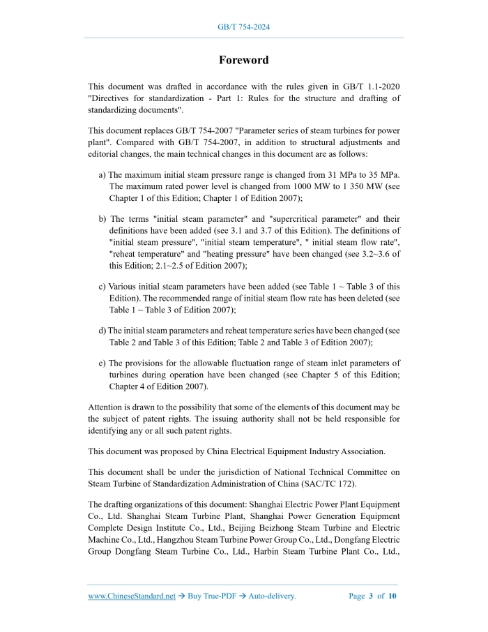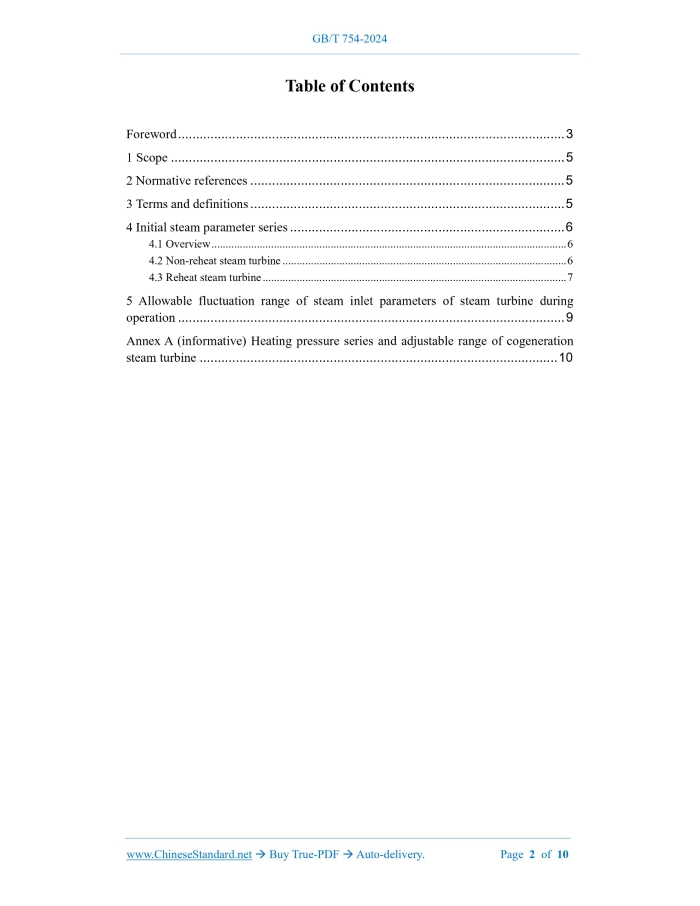 Similar standardsGB/T 754-2024: Parameter series of steam turbines for power plant---This is an excerpt. Full copy of true-PDF in English version (including equations, symbols, images, flow-chart, tables, and figures etc.), auto-downloaded/delivered in 9 seconds, can be purchased online: https://www.ChineseStandard.net/PDF.aspx/GBT754-2024GB NATIONAL STANDARD OF THE PEOPLE’S REPUBLIC OF CHINA ICS 27.040 CCS K 54 Replacing GB/T 754-2007 Parameter series of steam turbines for power plant ISSUED ON: APRIL 25, 2024 IMPLEMENTED ON: NOVEMBER 01, 2024 Issued by: State Administration for Market Regulation; Standardization Administration of the People's Republic of China. Table of ContentsForeword ... 3 1 Scope ... 5 2 Normative references ... 5 3 Terms and definitions ... 5 4 Initial steam parameter series ... 6 4.1 Overview ... 6 4.2 Non-reheat steam turbine ... 6 4.3 Reheat steam turbine ... 7 5 Allowable fluctuation range of steam inlet parameters of steam turbine during operation ... 9 Annex A (informative) Heating pressure series and adjustable range of cogeneration steam turbine ... 10ForewordThis document was drafted in accordance with the rules given in GB/T 1.1-2020 "Directives for standardization - Part 1: Rules for the structure and drafting of standardizing documents". This document replaces GB/T 754-2007 "Parameter series of steam turbines for power plant". Compared with GB/T 754-2007, in addition to structural adjustments and editorial changes, the main technical changes in this document are as follows: a) The maximum initial steam pressure range is changed from 31 MPa to 35 MPa. The maximum rated power level is changed from 1000 MW to 1 350 MW (see Chapter 1 of this Edition; Chapter 1 of Edition 2007); b) The terms "initial steam parameter" and "supercritical parameter" and their definitions have been added (see 3.1 and 3.7 of this Edition). The definitions of "initial steam pressure", "initial steam temperature", " initial steam flow rate", "reheat temperature" and "heating pressure" have been changed (see 3.2~3.6 of this Edition; 2.1~2.5 of Edition 2007); c) Various initial steam parameters have been added (see Table 1 ~ Table 3 of this Edition). The recommended range of initial steam flow rate has been deleted (see Table 1 ~ Table 3 of Edition 2007); d) The initial steam parameters and reheat temperature series have been changed (see Table 2 and Table 3 of this Edition; Table 2 and Table 3 of Edition 2007); e) The provisions for the allowable fluctuation range of steam inlet parameters of turbines during operation have been changed (see Chapter 5 of this Edition; Chapter 4 of Edition 2007). Attention is drawn to the possibility that some of the elements of this document may be the subject of patent rights. The issuing authority shall not be held responsible for identifying any or all such patent rights. This document was proposed by China Electrical Equipment Industry Association. This document shall be under the jurisdiction of National Technical Committee on Steam Turbine of Standardization Administration of China (SAC/TC 172). The drafting organizations of this document: Shanghai Electric Power Plant Equipment Co., Ltd. Shanghai Steam Turbine Plant, Shanghai Power Generation Equipment Complete Design Institute Co., Ltd., Beijing Beizhong Steam Turbine and Electric Machine Co., Ltd., Hangzhou Steam Turbine Power Group Co., Ltd., Dongfang Electric Group Dongfang Steam Turbine Co., Ltd., Harbin Steam Turbine Plant Co., Ltd., Parameter series of steam turbines for power plant1 ScopeThis document gives initial steam parameter series of steam turbines for power plant and the allowable fluctuation range of steam inlet parameters during operation. This document is applicable to steam turbines for stationary power generation or cogeneration with rated power levels of 0.75 MW~1350 MW and initial steam pressures of 1.28 MPa~35 MPa. NOTE: Steam turbines for stationary power plant are of the condensing type. Steam turbines for cogeneration are of the back-pressure type, extraction back-pressure type, and extraction condensing type. This document does not apply to nuclear power turbines, steam-gas combined cycle turbines, solar thermal power generation turbines, waste power generation and biomass power generation turbines, and waste heat power generation turbines.2 Normative referencesThe following referenced documents are indispensable for the application of this document. For dated references, only the edition cited applies. For undated references, the latest edition of the referenced document (including any amendments) applies. GB/T 5578, Fixed power plant steam turbine specifications3 Terms and definitionsFor the purposes of this document, the terms and definitions defined in GB/T 5578 as well as the followings apply. 3.1 initial steam parameter Steam parameters at the main steam valve inlet. 3.2 initial steam pressure Steam pressure at the inlet of the main steam valve of the turbine. NOTE: All steam pressure values in this document unless otherwise specified are absolute pressures. 3.3 initial steam temperature The steam temperature at the inlet of the turbine main steam valve. 3.4 initial steam flow rate The mass flow rate of new steam flowing into the main steam valve inlet of the turbine. 3.5 reheat temperature The reheat steam temperature at the inlet of the reheat main steam valve (or reheat main steam and regulating combined valve) of the reheat steam turbine. 3.6 heating pressure The heating steam pressure at the exhaust port of a back-pressure steam turbine, the extraction port of an extraction steam turbine, or the outlet of the pressure regulating valve installed on the heating extraction pipe. NOTE: The heating pressure series and adjustable range of the cogeneration steam turbine are shown in Annex A. 3.7 supercritical parameter Steam parameters are turbine inlet steam parameters with pressure and temperature higher than the critical point of water. 3.8 ultra-supercrit