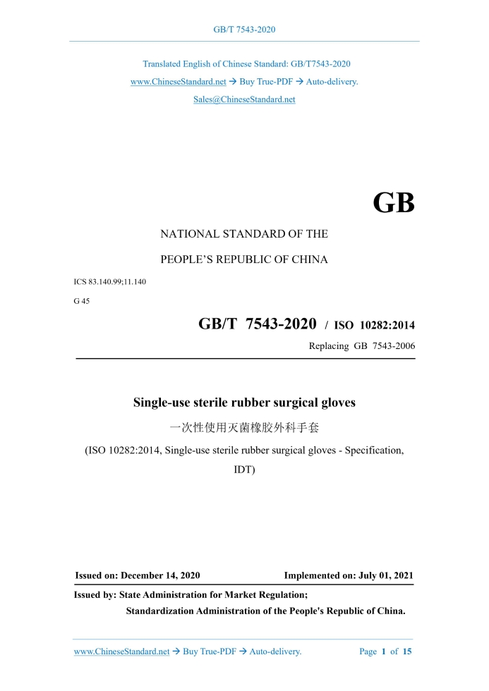 GB/T 7543-2020: Single-use sterile rubber surgical gloves Delivery: 9 seconds. True-PDF full-copy in English & invoice will be downloaded + auto-delivered via email. See step-by-step procedure Status: Valid GB/T 7543: Historical versions