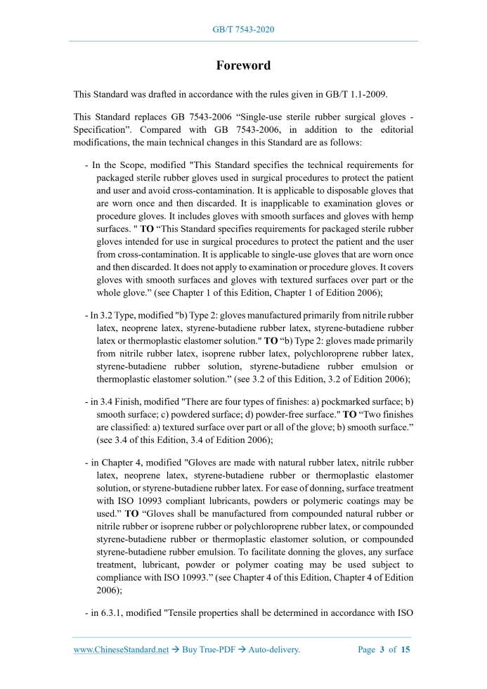 Similar standardsGB/T 7543-2020: Single-use sterile rubber surgical gloves---This is an excerpt. Full copy of true-PDF in English version (including equations, symbols, images, flow-chart, tables, and figures etc.), auto-downloaded/delivered in 9 seconds, can be purchased online: https://www.ChineseStandard.net/PDF.aspx/GBT7543-2020NATIONAL STANDARD OF THE PEOPLE’S REPUBLIC OF CHINA ICS 83.140.99;11.140 G 45 GB/T 7543-2020 / ISO 10282.2014 Replacing GB 7543-2006 Single-use sterile rubber surgical gloves (ISO 10282.2014, Single-use sterile rubber surgical gloves - Specification, IDT) Issued on. DECEMBER 14, 2020 Implemented on. JULY 01, 2021 Issued by. State Administration for Market Regulation; Standardization Administration of the People's Republic of China. Table of ContentsForeword... 3 1 Scope... 6 2 Normative references... 6 3 Classification... 6 4 Materials... 7 5 Sampling and selection of test pieces... 8 6 Requirements... 8 7 Packaging... 12 8 Marking... 12 Annex A (normative) Test for watertightness... 14ForewordThis Standard was drafted in accordance with the rules given in GB/T 1.1-2009. This Standard replaces GB 7543-2006 “Single-use sterile rubber surgical gloves - Specification”. Compared with GB 7543-2006, in addition to the editorial modifications, the main technical changes in this Standard are as follows. - In the Scope, modified "This Standard specifies the technical requirements for packaged sterile rubber gloves used in surgical procedures to protect the patient and user and avoid cross-contamination. It is applicable to disposable gloves that are worn once and then discarded. It is inapplicable to examination gloves or procedure gloves. It includes gloves with smooth surfaces and gloves with hemp surfaces. " TO “This Standard specifies requirements for packaged sterile rubber gloves intended for use in surgical procedures to protect the patient and the user from cross-contamination. It is applicable to single-use gloves that are worn once and then discarded. It does not apply to examination or procedure gloves. It covers gloves with smooth surfaces and gloves with textured surfaces over part or the whole glove.” (see Chapter 1 of this Edition, Chapter 1 of Edition 2006); - In 3.2 Type, modified "b) Type 2.gloves manufactured primarily from nitrile rubber latex, neoprene latex, styrene-butadiene rubber latex, styrene-butadiene rubber latex or thermoplastic elastomer solution." TO “b) Type 2.gloves made primarily from nitrile rubber latex, isoprene rubber latex, polychloroprene rubber latex, styrene-butadiene rubber solution, styrene-butadiene rubber emulsion or thermoplastic elastomer solution.” (see 3.2 of this Edition, 3.2 of Edition 2006); - in 3.4 Finish, modified "There are four types of finishes. a) pockmarked surface; b) smooth surface; c) powdered surface; d) powder-free surface." TO “Two finishes are classified. a) textured surface over part or all of the glove; b) smooth surface.” (see 3.4 of this Edition, 3.4 of Edition 2006); - in Chapter 4, modified "Gloves are made with natural rubber latex, nitrile rubber latex, neoprene latex, styrene-butadiene rubber or thermoplastic elastomer solution, or styrene-butadiene rubber latex. For ease of donning, surface treatment with ISO 10993 compliant lubricants, powders or polymeric coatings may be used.” TO “Gloves shall be manufactured from compounded natural rubber or nitrile rubber or isoprene rubber or polychloroprene rubber latex, or compounded styrene-butadiene rubber or thermoplastic elastomer solution, or compounded styrene-butadiene rubber emulsion. To facilitate donning the gloves, any surface treatment, lubricant, powder or polymer coating may be used subject to compliance with ISO 10993.” (see Chapter 4 of this Edition, Chapter 4 of Edition 2006); - in 6.3.1, modified "Tensile properties shall be determined in accordance with ISO 37.Cut 3 test pieces from each glove. The result is the median value. The test piece should be taken from the palm or back of the glove.” TO “Tensile properties shall be measured in accordance with ISO 37, taking three type 2 dumb-bell test pieces from each glove and using the median value as the test result. Test pieces shall be taken from the palm or back of gloves.” (see 6.3.1 of this Edition, 6.3.1 of Edition 2006). This Standard uses translation method to identically adopt ISO 10282.2014 “Single-use sterile rubber surgical gloves - Specification”. The Chinese documents which have consistency with the international normative references in this Standard are as follows. - GB/T 528-2009, Rubber, vulcanized or thermoplastic - Determination of tensile stress-strain properties (ISO 37.2005, IDT) - GB/T 2828.1-2012, Sampling procedures for inspection by attributea-Part1. Sampling schemes indexed by acceptance quality limit (AQL) for lot-by-lot inspection (ISO 2859-1.1999, IDT) - GB/T 2941-2006, Rubber - General procedures for preparing and conditioning test pieces for physical test methods (ISO 23529.2004, IDT) - GB/T 3512-2014, Rubber, vulcanized or thermoplastic - Accelerated ageing and heat resistance tests (ISO 188.2011, IDT) - GB/T 16886 (all parts), Biological evaluation of medical devices [ISO 10993(all parts)] - YY/T 0466.1-2016, Medical devices - Symbols to be used with medical device labels, labelling and information to be supplied - Part 1.General requirements (ISO 15223.2012, IDT) This Standard was proposed by China Petroleum and Chemical Industry Federation. This Standard shall be under the jurisdiction of National Technical Committee on Rubber and Rubber Products of Standardization Administration of China (SAC/TC 35). The drafting organizations of this Standard. Shanghai Kebang Medical Latex Equipment Co., Ltd., Medikang Medical Products Trading (Shanghai) Co., Ltd., Anhui Hejia Medical Products Technology Co., Ltd., Guilin Zizhu Latex Products Co., Ltd., Xishuangbanna Yunmeng Xinxing Natural Rubber Co., Ltd., Shanghai Zhimei Rubber C
