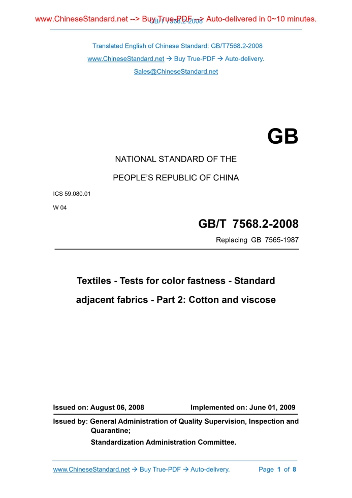 GB/T 7568.2-2008: Textiles -- Tests for colour fastness -- Standard adjacent fabrics -- Part 2: Cotton and viscose Delivery: 9 seconds. True-PDF full-copy in English & invoice will be downloaded + auto-delivered via email. See step-by-step procedure Status: Valid