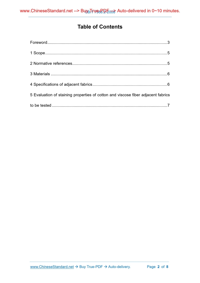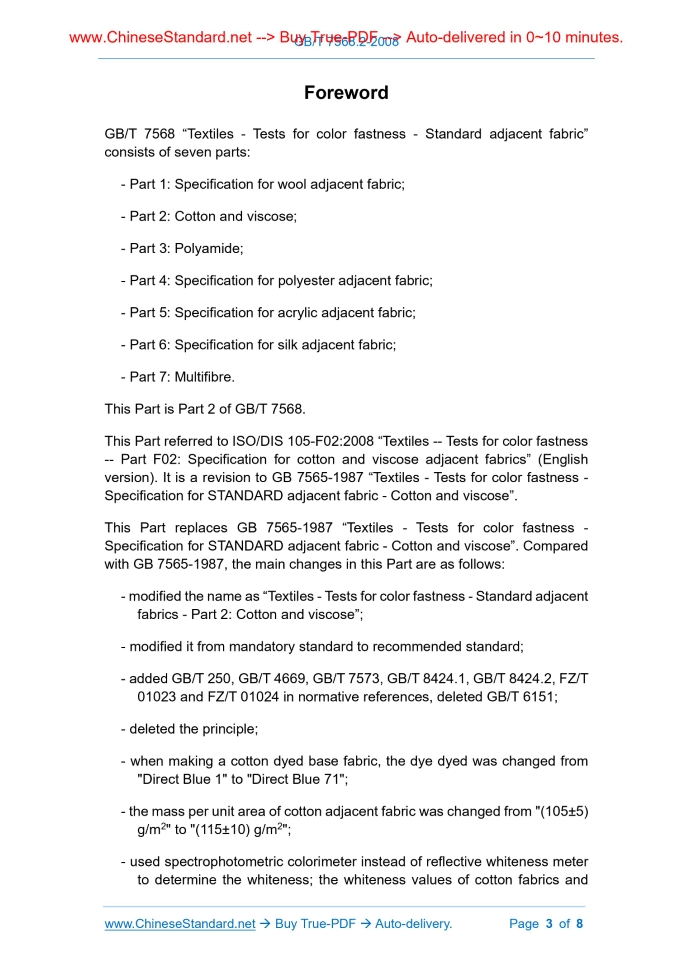 Similar standardsGB/T 7568.2-2008: Textiles -- Tests for colour fastness -- Standard adjacent fabrics -- Part 2: Cotton and viscose---This is an excerpt. Full copy of true-PDF in English version (including equations, symbols, images, flow-chart, tables, and figures etc.), auto-downloaded/delivered in 9 seconds, can be purchased online: https://www.ChineseStandard.net/PDF.aspx/GBT7568.2-2008 GB NATIONAL STANDARD OF THE PEOPLE’S REPUBLIC OF CHINA ICS 59.080.01 W 04 Replacing GB 7565-1987 Textiles - Tests for color fastness - Standard adjacent fabrics - Part 2.Cotton and viscose Issued on. AUGUST 06, 2008 Implemented on. JUNE 01, 2009 Issued by. General Administration of Quality Supervision, Inspection and Quarantine; Standardization Administration Committee. Table of ContentsForeword... 3 1 Scope... 5 2 Normative references... 5 3 Materials... 6 4 Specifications of adjacent fabrics... 6 5 Evaluation of staining properties of cotton and viscose fiber adjacent fabrics to be tested... 7ForewordGB/T 7568 “Textiles - Tests for color fastness - Standard adjacent fabric” consists of seven parts. - Part 1.Specification for wool adjacent fabric; - Part 2.Cotton and viscose; - Part 3.Polyamide; - Part 4.Specification for polyester adjacent fabric; - Part 5.Specification for acrylic adjacent fabric; - Part 6.Specification for silk adjacent fabric; - Part 7.Multifibre. This Part is Part 2 of GB/T 7568. This Part referred to ISO/DIS 105-F02.2008 “Textiles -- Tests for color fastness -- Part F02.Specification for cotton and viscose adjacent fabrics” (English version). It is a revision to GB 7565-1987 “Textiles - Tests for color fastness - Specification for STANDARD adjacent fabric - Cotton and viscose”. This Part replaces GB 7565-1987 “Textiles - Tests for color fastness - Specification for STANDARD adjacent fabric - Cotton and viscose”. Compared with GB 7565-1987, the main changes in this Part are as follows. - modified the name as “Textiles - Tests for color fastness - Standard adjacent fabrics - Part 2.Cotton and viscose”; - modified it from mandatory standard to recommended standard; - added GB/T 250, GB/T 4669, GB/T 7573, GB/T 8424.1, GB/T 8424.2, FZ/T 01023 and FZ/T 01024 in normative references, deleted GB/T 6151; - deleted the principle; - when making a cotton dyed base fabric, the dye dyed was changed from "Direct Blue 1" to "Direct Blue 71"; - the mass per unit area of cotton adjacent fabric was changed from "(105±5) g/m2" to "(115±10) g/m2"; - used spectrophotometric colorimeter instead of reflective whiteness meter to determine the whiteness; the whiteness values of cotton fabrics and viscose fabrics were changed from "70±5" to "Y10=89±2; W10=80±3; Tw,10=-1±1" and "Y10=85±5.0; W10=75±6.0; Tw,10=-1±1.2”, and added requirements for the number of folded layers in the fabric; - the staining performance index of the adjacent fabrics was changed from “the stain of the base adjacent fabric and the testing adjacent fabric, the difference of the number of stages shall be no more than half level” to “the color difference shall be no less than level 4~5”; and added that using the instrumental rating method to perform the evaluation of stained adjacent fabric and base adjacent fabric after staining; - deleted the content of production of cotton, viscose adjacent fabrics and dyed base fabrics. This Part was proposed by China Textile Industry Association. This Part shall be under the jurisdiction of Subcommittee on Base of National Technical Committee on Textiles of Standardization Administration of China (SAC/TC 209/SC 1). The drafting organization of this Part. Shanghai Textile Industry Technical Supervision Office. Main drafters of this Part. Chen Xiaocheng, Zhang Zhifeng. Version of standard substituted by this Part is. - GB 7565-1987. Textiles - Tests for color fastness – Standard adjacent fabrics - Part 2.Cotton and viscose1 ScopeThis Part of GB/T 7568 specifies the specification and requirements for the evaluation of stained undyed cotton and viscose standard adjacent fabrics in textile color fastness tests. The staining properties of the cotton and viscose fiber adjacent fabrics are determined by comparison with cotton and viscose fiber adjacent fabrics with cotton dyed base fabrics.2 Normative referencesThe following standards contain the provisions which, through reference in this Part of GB/T 7568, constitute the provisions of this Part. For dated references, subsequent amendments (excluding corrections) or revisions do not apply to this Part. However, the parties who enter into agreement based on this Part are encouraged to investigate whether the latest versions of these documents are applicable. For undated reference documents, the latest versions apply to this Part. GB/T 250, Gray scale for assessing change in color (GB/T 250-2008, ISO 105-A02.1993, IDT) GB/T 251, Gray scale for assessing staining (GB/T 251-2008, ISO 105- A03.1993, IDT) GB/T 3921-2008, Textiles - Tests for color fastness - Color fastness to washing with soap or soap and soda (ISO 105-C10.2006, MOD) GB/T 4669, Textiles - Woven fabrics - Determination of mass per unit length and mass per unit area (GB/T 4669-2008, ISO 3801.1977, MOD) GB/T 7573, Textiles - Determination of pH of aqueous extract (GB/T 7573- 2002, ISO 3071.1980, MOD)3 Materials3.1 Cotton testing adjacent fabric, meeting the requirements of 4.1. 3.2 Cotton base adjacent fabric, meeting the requirements of 4.1. 3.3 Cotton dyed base fabric, meeting the requirements of 4.1 and using C.I. Direct Blue 71 to dye.4 Specifications of adjacent fabrics4.1 Specifications of cotton adjacent fabrics 4.1.1 Mass per unit area. (115±10) g/m2, measured according to GB/T 4669. 4.2 Specifications of viscose fiber adjacent fabric 4.2.1 Mass per unit area. (140±5) g/m2, determined according to GB/T 4669. 4.2.2 Whiteness values. 4.1.3 Water extract pH. 7.0±0.5, determined according to GB/T 7573.5 Evaluation of staining properties of cotton