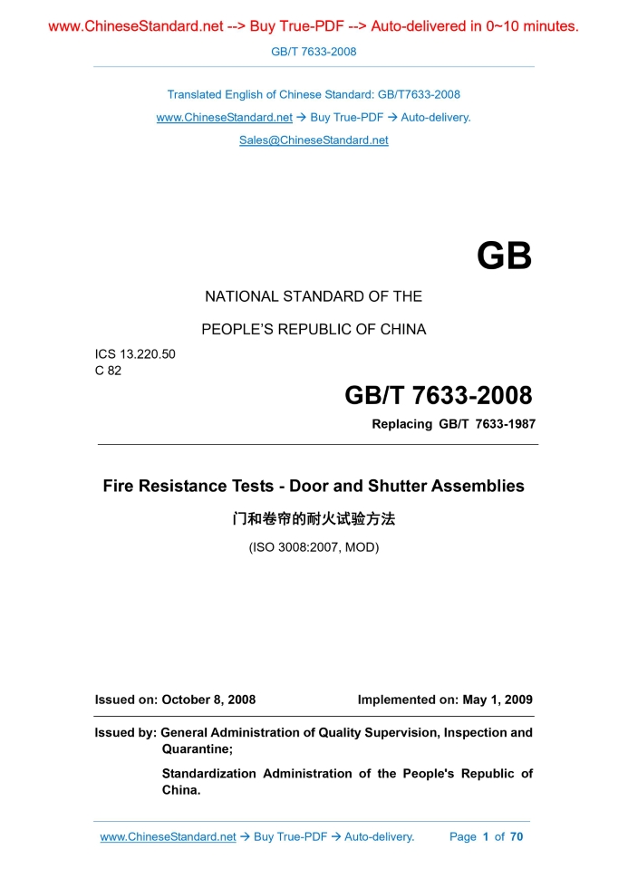 GB/T 7633-2008: Fire resistance tests -- Door and shutter assemblies Delivery: 9 seconds. True-PDF full-copy in English & invoice will be downloaded + auto-delivered via email. See step-by-step procedure Status: Valid GB/T 7633: Historical versions