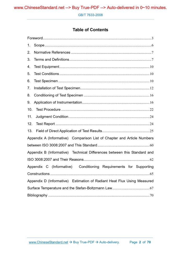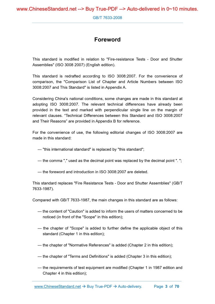 Similar standardsGB/T 7633-2008: Fire resistance tests -- Door and shutter assemblies---This is an excerpt. Full copy of true-PDF in English version (including equations, symbols, images, flow-chart, tables, and figures etc.), auto-downloaded/delivered in 9 seconds, can be purchased online: https://www.ChineseStandard.net/PDF.aspx/GBT7633-2008GB NATIONAL STANDARD OF THE PEOPLE’S REPUBLIC OF CHINA ICS 13.220.50 C 82 Replacing GB/T 7633-1987 Fire Resistance Tests - Door and Shutter Assemblies (ISO 3008.2007, MOD) Issued on. OCTOBER 8, 2008 Implemented on. MAY 1, 2009 Issued by. General Administration of Quality Supervision, Inspection and Quarantine; Standardization Administration of the People's Republic of China. Table of ContentsForeword... 3 1.Scope... 6 2.Normative References... 7 3.Terms and Definitions... 7 4.Test Equipment... 10 5.Test Conditions... 10 6.Test Specimen... 10 7.Installation of Test Specimen... 12 8.Conditioning of Test Specimen... 16 9.Application of Instrumentation... 16 10.Test Procedure... 22 11.Judgment Condition... 24 12.Test Report... 24 13.Field of Direct Application of Test Results... 25 Appendix A (Informative) Comparison List of Chapter and Article Numbers between ISO 3008.2007 and This Standard... 60 Appendix B (Informative) Technical Differences between this Standard and ISO 3008.2007 and Their Reasons... 62 Appendix C (Informative) Conditioning Requirements for Supporting Constructions... 65 Appendix D (Informative) Estimation of Radiant Heat Flux Using Measured Surface Temperature and the Stefan-Boltzmann Law... 67 Bibliography... 70ForewordThis standard is modified in relation to "Fire-resistance Tests - Door and Shutter Assemblies" (ISO 3008 2007) (English edition). This standard is redrafted according to ISO 3008.2007.For the convenience of comparison, the "Comparison List of Chapter and Article Numbers between ISO 3008.2007 and This Standard" is listed in Appendix A. Considering China's national conditions, some changes are made in this standard at adopting ISO 3008.2007.The relevant technical differences have already been provided in the text and marked with perpendicular single line on the margin of relevant clauses. “Technical Differences between this Standard and ISO 3008.2007 and Their Reasons” are provided in Appendix B for reference. For the convenience of use, the following editorial changes of ISO 3008.2007 are made in this standard. --- "this international standard" is replaced by "this standard"; --- the comma "," used as the decimal point was replaced by the decimal point ". "; --- the foreword and introduction in ISO 3008.2007 are deleted. This standard replaces "Fire Resistance Tests - Door and Shutter Assemblies" (GB/T 7633-1987). Compared with GB/T 7633-1987, the main changes in this standard are as follows. --- the content of "Caution" is added to inform the users of matters concerned to be noticed (in front of the "Scope" in this edition); --- the chapter of "Scope" is added to further define the applicable object of this standard (Chapter 1 in this edition); --- the chapter of "Normative References" is added (Chapter 2 in this edition); --- the chapter of "Terms and Definitions" is added (Chapter 3 in this edition); --- the requirements of test equipment are modified (Chapter 1 in 1987 edition and Chapter 4 in this edition); --- test conditions are modified (Chapter 2 & Chapter 3 in 1987 edition and Chapter 5 in this edition); --- the requirements of test specimen are modified, and the relevant clauses are rearranged (Chapter 4 in 1987 edition and Chapter 6 in this edition); --- "design of test specimen" is added (see Section 6.3); --- "verification" is added (see Section 6.5); --- the installation requirements of test specimen are modified and arranged as an independent chapter (Section 4.4 in 1987 edition and Chapter 7 in this edition); --- the conditioning requirements are changed to adjustment and arranged as an independent chapter (Section 4.5 in 1987 edition and Chapter 8 in this edition); --- "Application of Instrumentation" is added (the Chapter 6 in 1987 edition is modified and changed to Chapter 9 in this edition); --- the test procedures are modified (Chapter 5 in 1987 edition and Chapter 10 in this edition); --- the judgment conditions are modified (Chapter 7 in 1987 edition and Chapter 11 in this edition); --- the requirements of test report content are modified (Chapter 8 in 1987 edition and Chapter 12 in this edition); --- "Field of Direct Application of Test Results" is added (see Chapter 13); --- "Comparison List of Chapter and Article Numbers between ISO 3008.2007 and This Standard" is added (see Appendix A); --- "Technical Differences between this Standard and ISO 3008.2007 and Their Reasons" is added (see Appendix B); --- normative appendix "Conditioning Requirements for Supporting Constructions" is added (see Appendix C); --- informative appendix "Estimation of Radiant Heat Flux Using Measured Surface Temperature and the Stefan-Boltzmann Law" is added (see Appendix D). In this standard, Appendix C is normative while Appendixes A, B and D are informative. This standard was proposed by the Ministry of Public Security of the People's Republic of China. This standard is under the jurisdiction of The Eighth Subcommittee of National Technical Committee on Fire Protection of Standardization Administration of China (SAC/TC 113/SC 8). Drafting organization of this standard. Tianjin Fire Control Institute of Ministry of Public Security. Participating drafting organization of this standard. Shenzhen Peng Ji-Security Inc. Chief drafting staff of this standard. Zhang Xianghui, Bai Shuying, Zhao Huali, Han Weiping, Cao Wenhong, Huang Wei, Qian Tao, Xie Fenglan, Liu Xiaohui, Yu Zuofu. The previous edition of the standard replaced by this standard is as follows. --- GB/T 7633 1987. Fire Resistance Tests - Door and Shutter Assemblies Caution. the attention of all persons concerned with managing and carrying out this fire