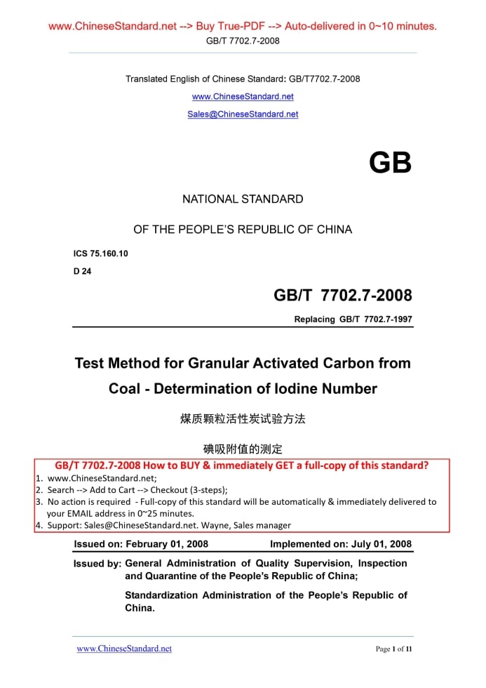 GB/T 7702.7-2008: Test method for granular activated carbon from coal -- Determination of iodine number Delivery: 9 seconds. True-PDF full-copy in English & invoice will be downloaded + auto-delivered via email. See step-by-step procedure Status: Obsolete GB/T 7702.7: Historical versions