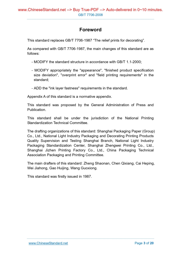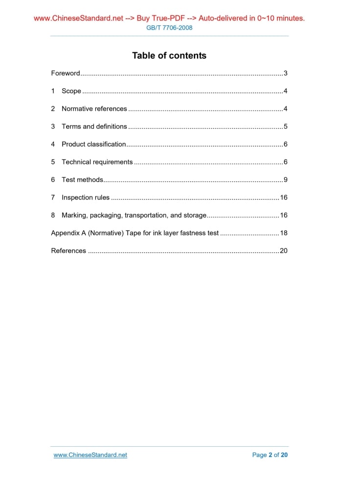 Similar standardsGB/T 7706-2008: The relief prints for decorating---This is an excerpt. Full copy of true-PDF in English version (including equations, symbols, images, flow-chart, tables, and figures etc.), auto-downloaded/delivered in 9 seconds, can be purchased online: https://www.ChineseStandard.net/PDF.aspx/GBT7706-2008GB NATIONAL STANDARD ICS 37.100.01 A 17 Replacing GB/T 7706-1987 The relief prints for decorating Issued on. JULY 2, 2008 Implemented on. DECEMBER 01, 2008 Issued by. General Administration of Quality Supervision, Inspection and Quarantine of the People's Republic of China; Standardization Administration of the PRC. Table of ContentsForeword... 3 1 Scope... 4 2 Normative references... 4 3 Terms and definitions... 5 4 Product classification... 6 5 Technical requirements... 6 6 Test methods... 9 7 Inspection rules... 16 8 Marking, packaging, transportation, and storage... 16 Appendix A (Normative) Tape for ink layer fastness test... 18 References... 20ForewordThis standard replaces GB/T 7706-1987 “The relief prints for decorating”. As compared with GB/T 7706-1987, the main changes of this standard are as follows. - MODIFY the standard structure in accordance with GB/T 1.1-2000; - MODIFY appropriately the "appearance", "finished product specification size deviation", "overprint error" and "field printing requirements" in the standard; - ADD the "ink layer fastness" requirements in the standard. Appendix A of this standard is a normative appendix. This standard was proposed by the General Administration of Press and Publication. This standard shall be under the jurisdiction of the National Printing Standardization Technical Committee. The drafting organizations of this standard. Shanghai Packaging Paper (Group) Co., Ltd., National Light Industry Packaging and Decorating Printing Products Quality Supervision and Testing Shanghai Branch, National Light Industry Packaging Standardization Center, Shanghai Zhengwei Printing Co., Ltd., Shanghai Jizhen Printing Factory Co., Ltd., China Packaging Technical Association Packaging and Printing Committee. The main drafters of this standard. Zheng Shaonan, Chen Qixiang, Cai Heping, Wei Jiahong, Gao Huijing, Wang Guoxiong. This standard was firstly issued in 1987. The relief prints for decorating1 ScopeThis standard specifies the classification, requirements, inspection methods, inspection rules, marking, packaging, transportation, storage, and so on, of the relief prints for decorating. This standard applies to the paper and plastic film decoration printed products as produced through relief prints (except for flexo printing) technology.2 Normative referencesThe provisions in following documents become the provisions of this Standard through reference in this Standard. For the dated references, the subsequent amendments (excluding corrections) or revisions do not apply to this Standard; however, parties who reach an agreement based on this Standard are encouraged to study if the latest versions of these documents are applicable. For undated references, the latest edition of the referenced document applies. GB/T 2792-1998 Test method for peel strength of pressure-sensitive tape at 180° angle (eqv JISZ 0237.1991) GB/T 2828.1 Sampling procedures for inspection by attributes - Part 1. Sampling scheme indexed by acceptance quality limit (AQL) for lot-by-lot inspection (GB/T 2828.1-2003, ISO 2859-1.1999, IDT) GB/T 17934.1-1999 Graphic technology - Process control for manufacture of half-tone color separations, proof production prints - Part 1.Parameters and measurement methods (eqv ISO 12647-1.1996) GB/T 18722 Graphic technology - Application of reflection densitometry and colorimetry to process control in graphic arts (GB/T 18722-2002, eqv ISO13656.2000)3 Terms and definitionsThe following terms and definitions apply to this standard. 3.1 Relief printing It refers to the method using the printing plate in which the graphic part is higher than the non-graphic part. It is divided into direct relief printing and indirect relief printing. [GB/T 9851.1-2008, 5.7] 3.2 Hot foil-stamping It refers to the process of using the hot die to transfer the hot stamping materials to the stamped product on such items as paper, cardboard, paper products, coating and so on. [GB/T 9851.7-2008, 4.6] 3.3 Film laminating It refers to the process of laminating a plastic film on the surface of a printed product. [GB/T 9851.7-2008, 4.5] 3.4 Coating It refers to the process of coating transparent and bright materials over a printed product. [GB/T 9851.7-2008, 4.4]4 Product classification4.1 Fine products It refers to the high-grade printed decorating which uses high quality printing main and auxiliary materials through fine plate-making technology AND reaches to each quality indicator of the fine product. 4.2 Ordinary products5 Technical requirements5.1 Dimension deviation of finished product specification 5.2 Overprint error shall comply with the provisions of Table 4. Table 4 Overprint error in millimeters Overprint section Allowable deviation of overprint Fine product Ordinary product 5.3 Field printing requirements shall be in accordance with Table 5. 5.4 Printing surface appearance 5.4.1 Fine product 5.4.1.1 The finished product shall be clean and free of scratches, stains and defects. 5.4.1.2 Text printing shall be clear and complete, and free from incompleteness or distortion, AND the letter less than 5.5P (No. 7) shall not affect the word reading. 5.4.2 Ordinary products 5.4.2.1 The finished product shall be clean AND free from obvious scratches, stains, or incompleteness. 5.4.2.2 The text printing shall be clear and complete AND free from obvious incompleteness or deformation; AND the letter less than 5.5 P (Number 7) shall not affect word reading. 5.4.2.4 The printing prime section shall be free from streaks or ghosting. 5.4.2.5 The prime section of each finished product shall not have stain spot of diameter > 0.4 mm OR more than 3 stains of diameter 