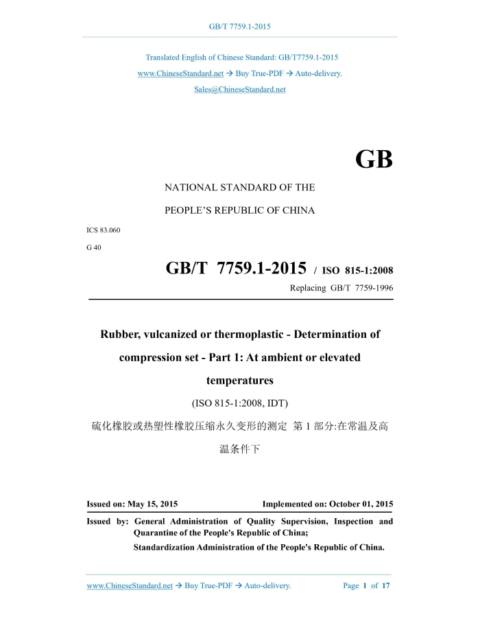 GB/T 7759.1-2015: Rubber, vulcanized or thermoplastic -- Determination of compression set -- Part 1: At ambient or elevated temperatures Delivery: 9 seconds. True-PDF full-copy in English & invoice will be downloaded + auto-delivered via email. See step-by-step procedure Status: Valid GB/T 7759.1: Historical versions