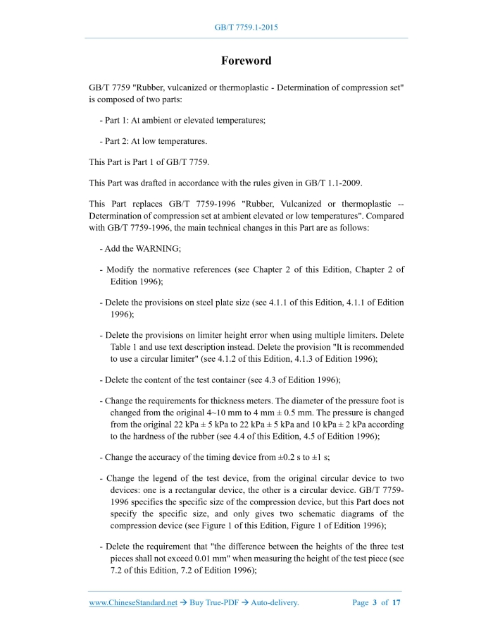 Similar standardsGB/T 7759.1-2015: Rubber, vulcanized or thermoplastic -- Determination of compression set -- Part 1: At ambient or elevated temperatures---This is an excerpt. Full copy of true-PDF in English version (including equations, symbols, images, flow-chart, tables, and figures etc.), auto-downloaded/delivered in 9 seconds, can be purchased online: https://www.ChineseStandard.net/PDF.aspx/GBT7759.1-2015 GB NATIONAL STANDARD OF THE PEOPLE’S REPUBLIC OF CHINA ICS 83.060 G 40 GB/T 7759.1-2015 / ISO 815-1:2008 Replacing GB/T 7759-1996 Rubber, vulcanized or thermoplastic - Determination of compression set - Part 1: At ambient or elevated temperatures (ISO 815-1:2008, IDT) ISSUED ON: MAY 15, 2015 IMPLEMENTED ON: OCTOBER 01, 2015 Issued by: General Administration of Quality Supervision, Inspection and Quarantine of the People's Republic of China; Standardization Administration of the People's Republic of China. Table of ContentsForeword ... 3 1 Scope ... 5 2 Normative references ... 6 3 Principle ... 6 4 Apparatus ... 6 5 Test pieces ... 8 6 Test conditions ... 10 7 Procedure ... 10 8 Expression of results ... 12 9 Precision ... 12 10 Test report ... 13 Annex A (informative) Precision ... 14 Annex B (informative) Guidance for using precision results ... 16ForewordGB/T 7759 "Rubber, vulcanized or thermoplastic - Determination of compression set" is composed of two parts: - Part 1: At ambient or elevated temperatures; - Part 2: At low temperatures. This Part is Part 1 of GB/T 7759. This Part was drafted in accordance with the rules given in GB/T 1.1-2009. This Part replaces GB/T 7759-1996 "Rubber, Vulcanized or thermoplastic -- Determination of compression set at ambient elevated or low temperatures". Compared with GB/T 7759-1996, the main technical changes in this Part are as follows: - Add the WARNING; - Modify the normative references (see Chapter 2 of this Edition, Chapter 2 of Edition 1996); - Delete the provisions on steel plate size (see 4.1.1 of this Edition, 4.1.1 of Edition 1996); - Delete the provisions on limiter height error when using multiple limiters. Delete Table 1 and use text description instead. Delete the provision "It is recommended to use a circular limiter" (see 4.1.2 of this Edition, 4.1.3 of Edition 1996); - Delete the content of the test container (see 4.3 of Edition 1996); - Change the requirements for thickness meters. The diameter of the pressure foot is changed from the original 4~10 mm to 4 mm ± 0.5 mm. The pressure is changed from the original 22 kPa ± 5 kPa to 22 kPa ± 5 kPa and 10 kPa ± 2 kPa according to the hardness of the rubber (see 4.4 of this Edition, 4.5 of Edition 1996); - Change the accuracy of the timing device from ±0.2 s to ±1 s; - Change the legend of the test device, from the original circular device to two devices: one is a rectangular device, the other is a circular device. GB/T 7759- 1996 specifies the specific size of the compression device, but this Part does not specify the specific size, and only gives two schematic diagrams of the compression device (see Figure 1 of this Edition, Figure 1 of Edition 1996); - Delete the requirement that "the difference between the heights of the three test pieces shall not exceed 0.01 mm" when measuring the height of the test piece (see 7.2 of this Edition, 7.2 of Edition 1996); Rubber, vulcanized or thermoplastic - Determination of compression set - Part 1: At ambient or elevated temperatures WARNING: Persons using this Part should be familiar with normal laboratory practice. This Part does not purport to address all of the safety problems, if any, associated with its use. It is the responsibility of the user to establish appropriate safety and health practices and to ensure compliance with any national regulatory conditions. CAUTION: Certain procedures specified in this Part may involve the use or generation of substances, or the generation of waste, that could constitute a local environmental hazard. Reference should be made to appropriate documentation on safe handling and disposal after use.1 ScopeThis Part specifies methods for the determination of the compression set characteristics of vulcanized and thermoplastic rubbers at ambient or elevated temperatures. The methods are intended to measure the ability of rubbers of hardness within the range 10 IRHD to 95 IRHD to retain their elastic properties at specified temperatures after prolonged compression at constant strain (normally 25%) under one of the alternative sets of conditions described. For rubber of nominal hardness 80 IRHD and above, a lower compression strain is used: 15% for a nominal hardness from 80 IRHD to 89 IRHD and 10% for a nominal hardness from 90 IRHD to 95 IRHD. NOTE 1: When rubber is held under compression, physical or chemical changes can occur that prevent the rubber returning to its original dimensions after release of the deforming force. The result is a set, the magnitude of which depends on the time and temperature of compression as well as on the time and temperature of recovery. At elevated temperatures, chemical changes become increasingly more important and lead to a permanent set. NOTE 2: Short-time compression set tests, typically for 22 h, at elevated temperatures are commonly used as a measure of the state of cure, a means of material classification and a specification to ensure the quality of a compound. Longer tests, typically for 1000 h, at elevated temperatures take account of the effect of ageing and are often used to predict service performance, including that of sealing materials. Short-time tests at ambient temperature show mainly the effect of physical changes (re-orientation of the molecular chains and the fillers). Type B test pieces are preferred when it is required to cut test pieces from products. In this case, the test pieces shall be taken as near to the center of the product as possible, unless otherwise specified. When possible, the test piece shall be cut in such a way that its axis