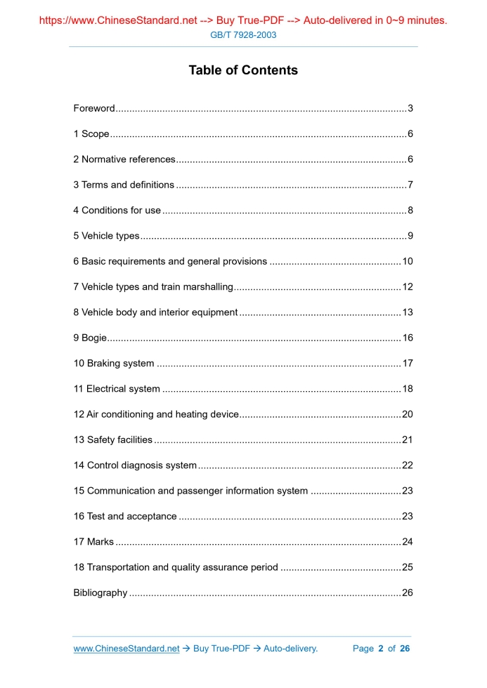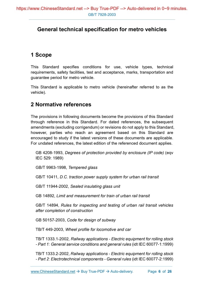 Similar standardsGB/T 7928-2003: General technical specification for metro vehicles---This is an excerpt. Full copy of true-PDF in English version (including equations, symbols, images, flow-chart, tables, and figures etc.), auto-downloaded/delivered in 9 seconds, can be purchased online: https://www.ChineseStandard.net/PDF.aspx/GBT7928-2003GB NATIONAL STANDARD OF THE PEOPLE’S REPUBLIC OF CHINA ICS 45.060.20 S 50 Replacing GB/T 7928-1987 General technical specification for metro vehicles ISSUED ON: DECEMBER 05, 2003 IMPLEMENTED ON: JULY 01, 2004 Issued by: General Administration of Quality Supervision, Inspection and Quarantine Table of ContentsForeword ... 3 1 Scope ... 6 2 Normative references ... 6 3 Terms and definitions ... 7 4 Conditions for use ... 8 5 Vehicle types ... 9 6 Basic requirements and general provisions ... 10 7 Vehicle types and train marshalling ... 12 8 Vehicle body and interior equipment ... 13 9 Bogie ... 16 10 Braking system ... 17 11 Electrical system ... 18 12 Air conditioning and heating device ... 20 13 Safety facilities ... 21 14 Control diagnosis system ... 22 15 Communication and passenger information system ... 23 16 Test and acceptance ... 23 17 Marks ... 24 18 Transportation and quality assurance period ... 25 Bibliography ... 26 General technical specification for metro vehicles1 ScopeThis Standard specifies conditions for use, vehicle types, technical requirements, safety facilities, test and acceptance, marks, transportation and guarantee period for metro vehicle. This Standard is applicable to metro vehicle (hereinafter referred to as the vehicle).2 Normative referencesThe provisions in following documents become the provisions of this Standard through reference in this Standard. For dated references, the subsequent amendments (excluding corrigendum) or revisions do not apply to this Standard, however, parties who reach an agreement based on this Standard are encouraged to study if the latest versions of these documents are applicable. For undated references, the latest edition of the referenced document applies. GB 4208-1993, Degrees of protection provided by enclosure (IP code) (eqv IEC 529: 1989) GB/T 9963-1998, Tempered glass GB/T 10411, D.C. traction power supply system for urban rail transit GB/T 11944-2002, Sealed insulating glass unit GB 14892, Limit and measurement for train of urban rail transit GB/T 14894, Rules for inspecting and testing of urban rail transit vehicles after completion of construction GB 50157-2003, Code for design of subway TB/T 449-2003, Wheel profile for locomotive and car TB/T 1333.1-2002, Railway applications - Electric equipment for rolling stock - Part 1: General service conditions and general rules (idt IEC 60077-1:1999) TB/T 1333.2-2002, Railway applications - Electric equipment for rolling stock - Part 2: Electrotechnical components - General rules (idt IEC 60077-2:1999) a single car that can be incorporated into a train on the subway line; metro vehicle can be powered train and unpowered trailer 3.2 metro train, train a complete combination of several metro vehicles that can carry passengers normally 3.3 deadman switch control button to confirm that the vehicle is under the control of the driver 3.4 train communication network data communication network that connects the on-board programmable electronic equipment of each vehicle4 Conditions for use4.1 Environmental conditions 4.1.1 Normal working altitude does not exceed 1200m. 4.1.2 The ambient temperature is between -25°C and 40°C. 4.1.3 The average maximum relative humidity of the wettest month is not more than 90% (the average minimum temperature of the month is 25°C). 4.1.4 The vehicle shall be able to withstand the attack of wind, sand, rain, and snow and the action of the cleaning agent when the vehicle is washed. 4.1.5 Because there are differences in climatic conditions due to the different regions in which cities are located, user and manufacturer can additionally specify the environmental conditions for use in the contract. 4.2 Line conditions 4.2.1 The track gauge is 1435mm. 4.2.2 The minimum plane curve radius shall meet the relevant regulations of GB 50157. 4.2.3 The minimum vertical curve radius: 2000m. 4.2.4 Maximum slope: if there are no special regulations, the maximum slope of the main line shall not be greater than 30‰. 35‰ can be used in difficult areas. The maximum slope of tie line and access line shall not be greater than6 Basic requirements and general provisions6.1 The vehicle shall comply with the regulations of the relevant subway vehicle boundary. 6.2 The various equipment of the vehicle shall be manufactured in accordance with the drawings and technical documents approved by the prescribed procedures and comply with the provisions of relevant standards. 6.3 The wheel diameter is . The difference between the diameters of the two coaxial wheels of the new vehicle does not exceed 1mm. The wheel diameter difference of the same motor vehicle bogie does not exceed 2mm. 6.4 Wheelset inner distance is 1353mm ± 2mm. 6.5 The weight of the vehicle in the servicing state shall not be 3% greater than the value specified in the contract. 6.6 The difference between the measured axle load on each dynamic axle of the same motor vehicle and the actual average axle load of each dynamic axle of the vehicle shall not exceed 2% of the actual average axle load. 6.7 The difference between the actual wheel weight of each wheel and the average wheel weight of the axle shall not exceed ±4% of the average wheel weight of the axle. 6.8 The height of the floor of the passenger compartment of the vehicle from the track surface shall be coordinated with the station platform. The height adjustment device for empty and heavy vehicles shall be able to effectively keep the height of the vehicle floor surface from being significantly changed due to changes in passenger capacity. The floor height shall not be lower than the platform surface under any use. 6.