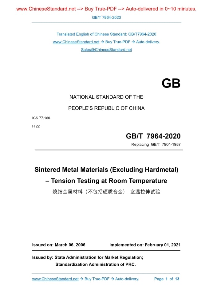 GB/T 7964-2020: Sintered Metal Materials (Excluding Hardmetal) - Tension Testing at Room Temperature Delivery: 9 seconds. True-PDF full-copy in English & invoice will be downloaded + auto-delivered via email. See step-by-step procedure Status: Valid GB/T 7964: Historical versions