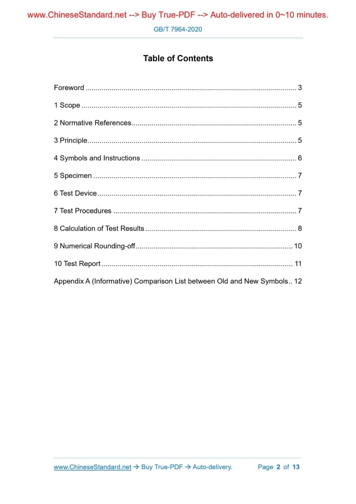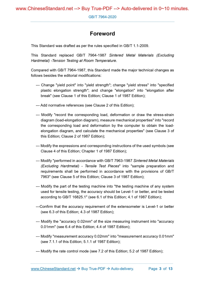 Similar standardsGB/T 7964-2020: Sintered Metal Materials (Excluding Hardmetal) - Tension Testing at Room Temperature---This is an excerpt. Full copy of true-PDF in English version (including equations, symbols, images, flow-chart, tables, and figures etc.), auto-downloaded/delivered in 9 seconds, can be purchased online: https://www.ChineseStandard.net/PDF.aspx/GBT7964-2020 NATIONAL STANDARD OF THE PEOPLE’S REPUBLIC OF CHINA ICS 77.160 H 22 Replacing GB/T 7964-1987 Sintered Metal Materials (Excluding Hardmetal) – Tension Testing at Room Temperature ISSUED ON: MARCH 06, 2006 IMPLEMENTED ON: FEBRUARY 01, 2021 Issued by: State Administration for Market Regulation; Standardization Administration of PRC. Table of ContentsForeword ... 3 1 Scope ... 5 2 Normative References ... 5 3 Principle ... 5 4 Symbols and Instructions ... 6 5 Specimen ... 7 6 Test Device ... 7 7 Test Procedures ... 7 8 Calculation of Test Results ... 8 9 Numerical Rounding-off ... 10 10 Test Report ... 11 Appendix A (Informative) Comparison List between Old and New Symbols .. 12ForewordThis Standard was drafted as per the rules specified in GB/T 1.1-2009. This Standard replaced GB/T 7964-1987 Sintered Metal Materials (Excluding Hardmetal) -Tension Testing at Room Temperature. Compared with GB/T 7964-1987, this Standard made the major technical changes as follows besides the editorial modifications: --- Change "yield point" into "yield strength"; change "yield stress" into "specified plastic elongation strength"; and change "elongation" into "elongation after break" (see Clause 1 of this Edition; Clause 1 of 1987 Edition); --- Add normative references (see Clause 2 of this Edition); --- Modify "record the corresponding load, deformation or draw the stress-strain diagram (load-elongation diagram), measure mechanical properties" into "record the corresponding load and deformation by the computer to obtain the load- elongation diagram, and calculate the mechanical properties" (see Clause 3 of this Edition; Clause 2 of 1987 Edition); --- Modify the expressions and corresponding instructions of the used symbols (see Clause 4 of this Edition; Chapter 1 of 1987 Edition); --- Modify "performed in accordance with GB/T 7963-1987 Sintered Metal Materials (Excluding Hardmetal) - Tensile Test Pieces" into "sample preparation and requirements shall be performed in accordance with the provisions of GB/T 7963" (see Clause 5 of this Edition; Clause 3 of 1987 Edition); --- Modify the part of the testing machine into "the testing machine of any system used for tensile testing, the accuracy should be Level-1 or better, and be tested according to GB/T 16825.1" (see 6.1 of this Edition; 4.1 of 1987 Edition); ---Confirm that the accuracy requirement of the extensometer is Level-1 or better (see 6.3 of this Edition; 4.3 of 1987 Edition); --- Modify the "accuracy 0.02mm" of the size measuring instrument into "accuracy 0.01mm" (see 6.4 of this Edition; 4.4 of 1987 Edition); --- Modify "measurement accuracy 0.02mm" into "measurement accuracy 0.01mm" (see 7.1.1 of this Edition; 5.1.1 of 1987 Edition); --- Modify the rate control mode (see 7.2 of this Edition; 5.2 of 1987 Edition); Sintered Metal Materials (Excluding Hardmetal) – Tension Testing at Room Temperature1 ScopeThis Standard specifies the room temperature tensile test method for sintered metal materials, including principles, symbols and instructions, specimens, test device, test procedures, calculation of test results, numerical rounding-off and test reports. This Standard is applicable to the determination of the yield strength, specified plastic elongation strength, tensile strength, elongation after break, and reduction of area for machined or non-machined sintered metal materials (excluding hardmetal).2 Normative ReferencesThe following documents are essential to the application of this document. For the dated documents, only the versions with the dates indicated are applicable to this document; for the undated documents, only the latest version (including all the amendments) are applicable to this document. GB/T 7963 Sintered Metal Materials, Excluding Hardmetals - Tensile Test Pieces GB/T 16825.1 Verification of Static Uniaxial Testing Machines - Part 1 : Tension/Compression Testing Machines - Verification and Calibration of the Force- Measuring System3 PrinciplePut the specimen in the appropriate position of the fixture; start the testing machine; make the specimen continuously and uniformly bear the tensile stress till break under the specified tensile speed; and record the corresponding load and deformation by the computer to obtain the load-elongation diagram; and calculate the mechanical properties.5 SpecimenThe preparation and requirements of the specimens shall be carried out in accordance with the provisions of GB/T 7963.6 Test Device6.1 Testing machine The testing machine of any system used for tensile testing shall have an accuracy of Level-1 or better; and shall be tested in accordance with GB/T 16825.1. The testing machine shall have sufficient rigidity and shall not cause instability within its tensile load range. 6.2 Fixture Choose a suitable specimen clamping device. The wedge chuck and collar chuck are usually used to transfer the load applied by the testing machine to the specimen. The axis of the specimen shall coincide with the center of the chuck of the testing machine. 6.3 Extensometer The accuracy of the extensometer shall be Level-1 or better. 6.4 Size measuring instrument Use a suitable instrument for measuring the specimen size, with an accuracy of 0.01 mm.7 Test Procedures7.1 Measuring specimen size 7.1.1 Cross-sectional area of the specimen Respectively measure once in two directions perpendicular to the two ends and middle of the specimen gauge length, the measuring accuracy is 0.01mm. Choose the smallest of the three cross-sectional areas. The cross-sectional area is calculated according to Formulas (1) and (2). a) Flat specimen: b) Cylindrical spec