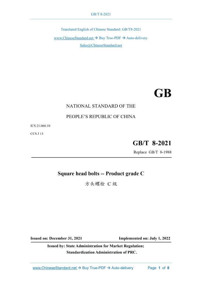 GB/T 8-2021: Square head bolts - Product grade C Delivery: 9 seconds. True-PDF full-copy in English & invoice will be downloaded + auto-delivered via email. See step-by-step procedure Status: Valid GB/T 8: Historical versions