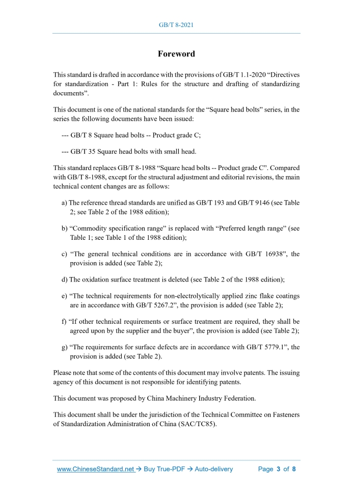 GB/T 8-2021: Square head bolts - Product grade C---This is an excerpt. Full copy of true-PDF in English version (including equations, symbols, images, flow-chart, tables, and figures etc.), auto-downloaded/delivered in 9 seconds, can be purchased online: https://www.ChineseStandard.net/PDF.aspx/GBT8-2021NATIONAL STANDARD OF THE PEOPLE’S REPUBLIC OF CHINA ICS 21.060.10 CCS J 13 Replace GB/T 8-1988 Square head bolts -- Product grade C Issued on: DECEMBER 31, 2021 Implemented on: JULY 1, 2022 Issued by. State Administration for Market Regulation; Standardization Administration of PRC. Table of ContentsForeword... 3 1 Scope... 5 2 Normative references... 5 3 Terms and definitions... 6 4 Type and dimensions... 6 5 Technical conditions and reference standards... 7 6 Marking... 8ForewordThis standard is drafted in accordance with the provisions of GB/T 1.1-2020 “Directives for standardization - Part 1.Rules for the structure and drafting of standardizing documents”. This document is one of the national standards for the “Square head bolts” series, in the series the following documents have been issued. --- GB/T 8 Square head bolts -- Product grade C; --- GB/T 35 Square head bolts with small head. This standard replaces GB/T 8-1988 “Square head bolts -- Product grade C”. Compared with GB/T 8-1988, except for the structural adjustment and editorial revisions, the main technical content changes are as follows. a) The reference thread standards are unified as GB/T 193 and GB/T 9146 (see Table 2; see Table 2 of the 1988 edition); b) “Commodity specification range” is replaced with “Preferred length range” (see Table 1; see Table 1 of the 1988 edition); c) “The general technical conditions are in accordance with GB/T 16938”, the provision is added (see Table 2); d) The oxidation surface treatment is deleted (see Table 2 of the 1988 edition); e) “The technical requirements for non-electrolytically applied zinc flake coatings are in accordance with GB/T 5267.2”, the provision is added (see Table 2); f) “If other technical requirements or surface treatment are required, they shall be agreed upon by the supplier and the buyer”, the provision is added (see Table 2); g) “The requirements for surface defects are in accordance with GB/T 5779.1”, the provision is added (see Table 2). Please note that some of the contents of this document may involve patents. The issuing agency of this document is not responsible for identifying patents. This document was proposed by China Machinery Industry Federation. This document shall be under the jurisdiction of the Technical Committee on Fasteners of Standardization Administration of China (SAC/TC85). Square head bolts -- Product grade C1 ScopeThis document specifies the types, dimensions, technical conditions, and marking of square head bolts. This document is applicable to square head bolts with thread specifications of M10~M48 and product grade C.2 Normative referencesThe following documents contain the provisions which, through normative reference in this document, constitute the essential provisions of this document. For the dated referenced documents, only the versions with the indicated dates are applicable to this document; for the undated referenced documents, only the latest version (including all the amendments) is applicable to this document. GB/T 2 Fasteners -- Ends of parts with external thread GB/T 90.1 Fasteners -- Acceptance inspection GB/T 90.2 Fasteners -- Marking and packaging GB/T 193 General purpose metric screw threads -- General plan GB/T 1237 Designation system for fasteners GB/T 3098.1 Mechanical properties of fasteners -- Bolts, screws and studs GB/T 3103.1 Tolerances for fasteners -- Bolts, screws, studs and nuts GB/T 5267.1 Fasteners -- Electroplated coatings GB/T 5267.2 Fasteners -- Non-electrolytically applied zinc flake coatings GB/T 5276 Fasteners -- Bolts, screws, studs and nuts -- Symbols and descriptions of dimensions GB/T 5779.1 Fasteners -- Surface discontinuities -- Bolts, screws and studs for general requirements GB/T 9146 General purpose metric screw threads -- Limits of sizes for the screw ......Source: Above contents are excerpted from the full-copy PDF -- translated/reviewed by: www.ChineseStandard.net / Wayne Zheng et al. Tips & Frequently Asked Questions:Question 1: How long will the true-PDF of English version of GB/T 8-2021 be delivered?Answer: The full copy PDF of English version of GB/T 8-2021 can be downloaded in 9 seconds, and it will also be emailed to you in 9 seconds (double mechanisms to ensure the delivery reliably), with PDF-invoice.Question 2: Can I share the purchased PDF of GB/T 8-2021_English with my colleagues?Answer: Yes. The purchased PDF of GB/T 8-2021_English will be deemed to be sold to your employer/organization who actually paid for it, including your colleagues and your employer's intranet.Question 3: Does the price include tax/VAT?Answer: Yes. Our tax invoice, downloaded/delivered in 9 seconds, includes all tax/VAT and complies with 100+ countries' tax regulations (tax exempted in 100+ countries) -- See Avoidance of Double Taxation Agreements (DTAs): List of DTAs signed between Singapore and 100+ countriesQuestion 4: Do you accept my currency other than USD?Answer: Yes. www.ChineseStandard.us -- GB/T 8-2021 -- Click this link and select your country/currency to pay, the exact amount in your currency will be printed on the invoice. Full PDF will also be downloaded/emailed in 9 seconds.Question 5: Should I purchase the latest version GB/T 8-2021?Answer: Yes. Unless special scenarios such as technical constraints or academic study, you should always prioritize to purchase the latest version GB/T 8-2021 even if the enforcement date is in future. Complying with the latest version means that, by default, it also complies with all the earlier versions, technically.How to buy and download a true PDF of English version of GB/T 8-2021?A step-by-step guide to download PDF 