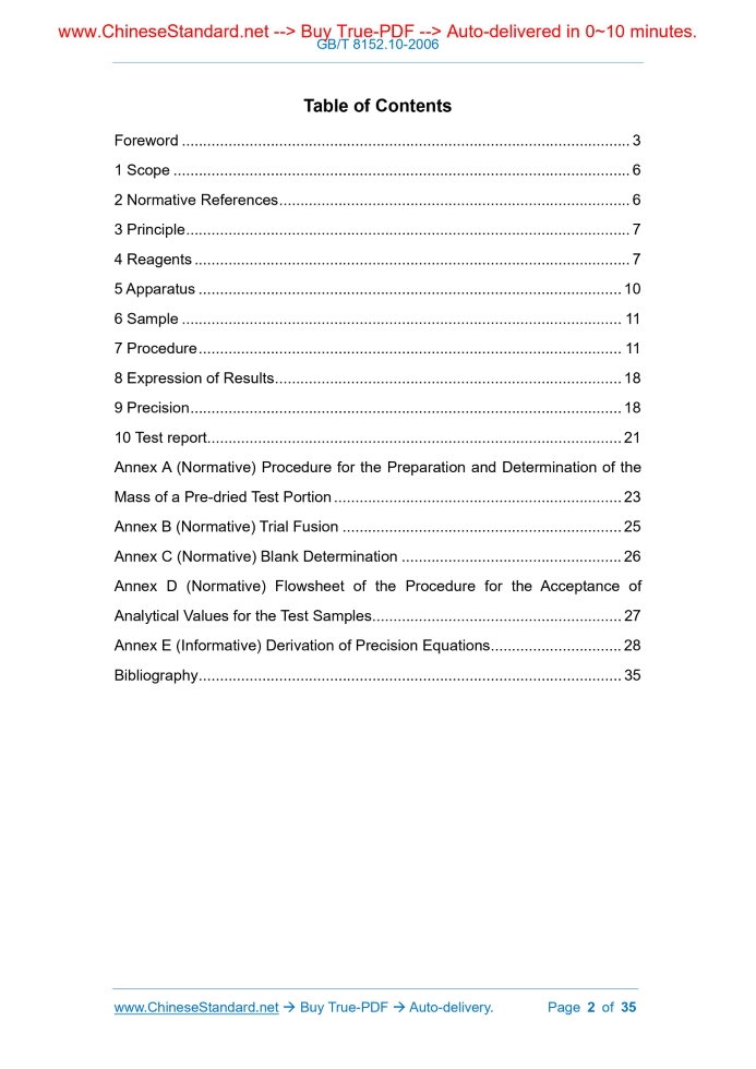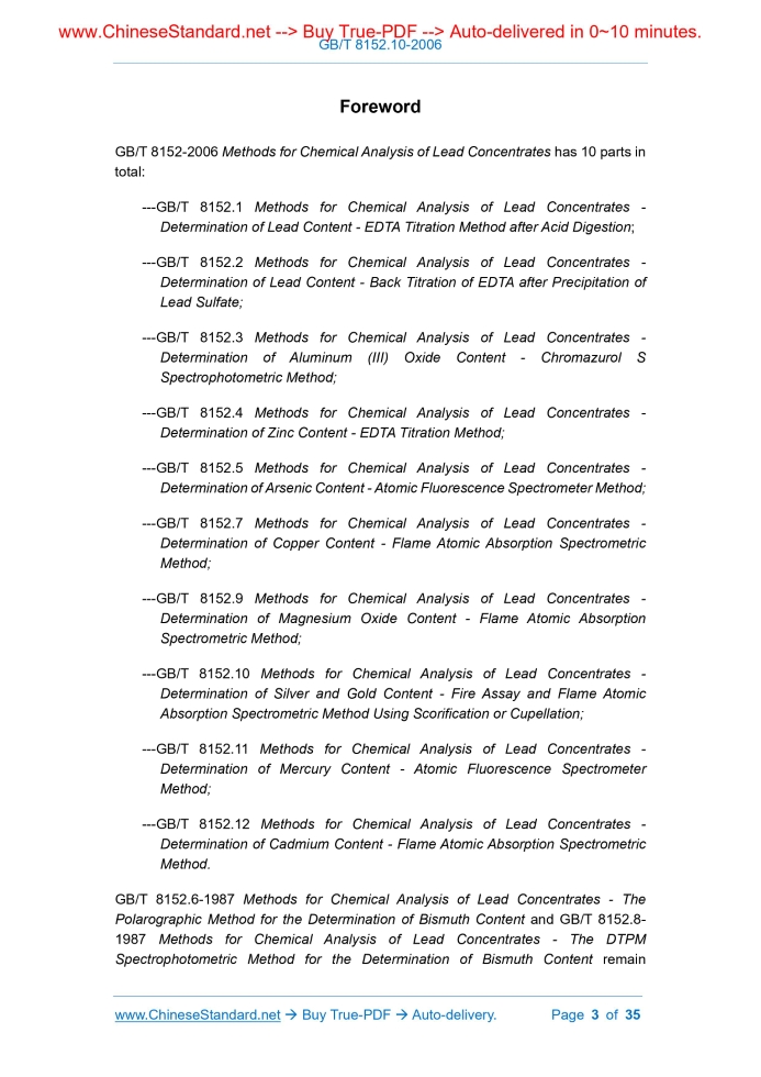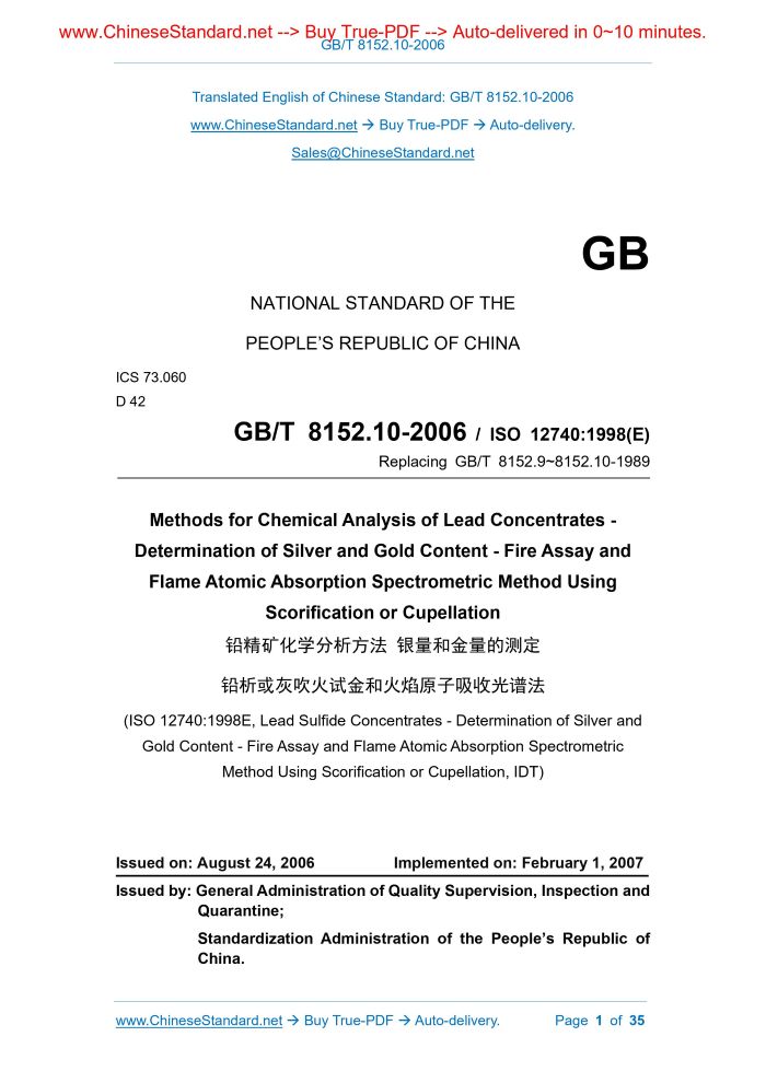 Similar standardsGB/T 8152.10-2006: Methods for chemical analysis of lead concentrates -- Determination of silver and gold content -- Fire assay and flame atomic absorption spectrometric method using scorification or cupellation---This is an excerpt. Full copy of true-PDF in English version (including equations, symbols, images, flow-chart, tables, and figures etc.), auto-downloaded/delivered in 9 seconds, can be purchased online: https://www.ChineseStandard.net/PDF.aspx/GBT8152.10-2006 NATIONAL STANDARD OF THE PEOPLE’S REPUBLIC OF CHINA ICS 73.060 D 42 GB/T 8152.10-2006 / ISO 12740:1998(E) Replacing GB/T 8152.9~8152.10-1989 Methods for Chemical Analysis of Lead Concentrates - Determination of Silver and Gold Content - Fire Assay and Flame Atomic Absorption Spectrometric Method Using Scorification or Cupellation (ISO 12740:1998E, Lead Sulfide Concentrates - Determination of Silver and Gold Content - Fire Assay and Flame Atomic Absorption Spectrometric Method Using Scorification or Cupellation, IDT) ISSUED ON: AUGUST 24, 2006 IMPLEMENTED ON: FEBRUARY 1, 2007 Issued by: General Administration of Quality Supervision, Inspection and Quarantine; Standardization Administration of the People’s Republic of China. Table of ContentsForeword ... 3 1 Scope ... 6 2 Normative References ... 6 3 Principle ... 7 4 Reagents ... 7 5 Apparatus ... 10 6 Sample ... 11 7 Procedure ... 11 8 Expression of Results ... 18 9 Precision ... 18 10 Test report... 21 Annex A (Normative) Procedure for the Preparation and Determination of the Mass of a Pre-dried Test Portion ... 23 Annex B (Normative) Trial Fusion ... 25 Annex C (Normative) Blank Determination ... 26 Annex D (Normative) Flowsheet of the Procedure for the Acceptance of Analytical Values for the Test Samples ... 27 Annex E (Informative) Derivation of Precision Equations ... 28 Bibliography ... 35ForewordGB/T 8152-2006 Methods for Chemical Analysis of Lead Concentrates has 10 parts in total: ---GB/T 8152.1 Methods for Chemical Analysis of Lead Concentrates - Determination of Lead Content - EDTA Titration Method after Acid Digestion; ---GB/T 8152.2 Methods for Chemical Analysis of Lead Concentrates - Determination of Lead Content - Back Titration of EDTA after Precipitation of Lead Sulfate; ---GB/T 8152.3 Methods for Chemical Analysis of Lead Concentrates - Determination of Aluminum (III) Oxide Content - Chromazurol S Spectrophotometric Method; ---GB/T 8152.4 Methods for Chemical Analysis of Lead Concentrates - Determination of Zinc Content - EDTA Titration Method; ---GB/T 8152.5 Methods for Chemical Analysis of Lead Concentrates - Determination of Arsenic Content - Atomic Fluorescence Spectrometer Method; ---GB/T 8152.7 Methods for Chemical Analysis of Lead Concentrates - Determination of Copper Content - Flame Atomic Absorption Spectrometric Method; ---GB/T 8152.9 Methods for Chemical Analysis of Lead Concentrates - Determination of Magnesium Oxide Content - Flame Atomic Absorption Spectrometric Method; ---GB/T 8152.10 Methods for Chemical Analysis of Lead Concentrates - Determination of Silver and Gold Content - Fire Assay and Flame Atomic Absorption Spectrometric Method Using Scorification or Cupellation; ---GB/T 8152.11 Methods for Chemical Analysis of Lead Concentrates - Determination of Mercury Content - Atomic Fluorescence Spectrometer Method; ---GB/T 8152.12 Methods for Chemical Analysis of Lead Concentrates - Determination of Cadmium Content - Flame Atomic Absorption Spectrometric Method. GB/T 8152.6-1987 Methods for Chemical Analysis of Lead Concentrates - The Polarographic Method for the Determination of Bismuth Content and GB/T 8152.8- 1987 Methods for Chemical Analysis of Lead Concentrates - The DTPM Spectrophotometric Method for the Determination of Bismuth Content remain unchanged. This is the 10th part of GB/T 8152. This Part equivalently adopts IEC 12740:1998(E) Lead Sulfide Concentrates - Determination of Silver and Gold Contents - Fire Assay and Flame Atomic Absorption Spectrometric Method Using Scorification or Cupellation. In order to make it convenient for users, this Part makes the following editorial modifications: a) Decimal point “.” is used to replace “,”, which acts as decimal point in the international standard; b) “this Part” is used to replace “this international standard”; c) In accordance with the idiomatic ways in Chinese, the title of the standard is modified; d) The front page, contents, foreword and introduction in the international standard are deleted. This Part serves as a replacement of GB/T 8152.9-1987 Methods for Chemical Analysis of Lead Concentrates - The Fire-assaying Methods for the Determination of Gold and Silver Content and GB/T 8152.10-1987 Methods for Chemical Analysis of Lead Concentrates - Determination of Silver Content - Flame Atomic Absorption Spectrophotometric Method. Due to the development of the international analytical techniques, the previous standards are outdated. In comparison with GB/T 8152.9 ~ GB/T 8152.10-1987, there are several changes as follows: a) This Part combines two methods in the previous national standards into one method, namely, it adopts scorification or cupellation for sample processing, and flame atomic absorption spectrometric method for determination. b) This Part adds normative technical elements, such as “precision” and “test report”, so as to further improve the standard text. c) Annex A “Instrument Working Conditions” in the previous national standard is deleted. d) Annex A “Procedure for the Preparation and Determination of the Mass of a Predried Test Portion”; Annex B “Trial Fusion”; Annex C “Blank Determination”; Annex D “Flowsheet of the Procedure for the Acceptance of Analytical Values for the Test Samples”; Annex E “Derivation of Precision Equations”; Annex F “Bibliography” are added. In this Part, Annex A, Annex B, Annex C and Annex D are normative; Annex E is informative. This Part was proposed by China No