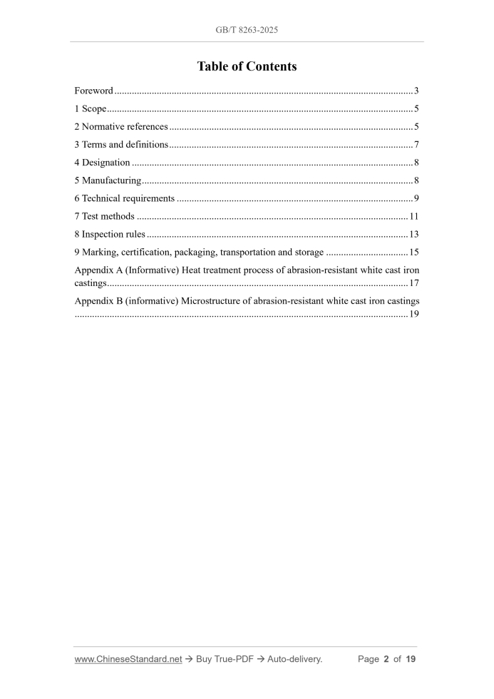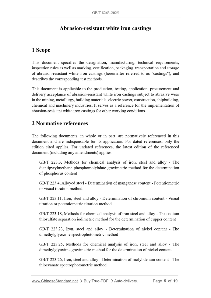 GB/T 8263-2025: Abrasion-resistant white iron castings---This is an excerpt. Full copy of true-PDF in English version (including equations, symbols, images, flow-chart, tables, and figures etc.), auto-downloaded/delivered in 9 seconds, can be purchased online: https://www.ChineseStandard.net/PDF.aspx/GBT8263-2025GB NATIONAL STANDARD OF THE PEOPLE’S REPUBLIC OF CHINA ICS 77.140.80 CCS J 31 Replacing GB/T 8263-2010, GB/T 24597-2009 Abrasion-resistant white iron castings Issued on: MAY 30, 2025 Implemented on: DECEMBER 01, 2025 Issued by. State Administration for Market Regulation; Standardization Administration of the People’s Republic of China. Table of ContentsForeword... 3 1 Scope... 5 2 Normative references... 5 3 Terms and definitions... 7 4 Designation... 8 5 Manufacturing... 8 6 Technical requirements... 9 7 Test methods... 11 8 Inspection rules... 13 9 Marking, certification, packaging, transportation and storage... 15 Appendix A (Informative) Heat treatment process of abrasion-resistant white cast iron castings... 17 Appendix B (informative) Microstructure of abrasion-resistant white cast iron castings ... 19 Abrasion-resistant white iron castings1 ScopeThis document specifies the designation, manufacturing, technical requirements, inspection rules as well as marking, certification, packaging, transportation and storage of abrasion-resistant white iron castings (hereinafter referred to as "castings"), and describes the corresponding test methods. This document is applicable to the production, testing, application, procurement and delivery acceptance of abrasion-resistant white iron castings subject to abrasive wear in the mining, metallurgy, building materials, electric power, construction, shipbuilding, chemical and machinery industries. It serves as a reference for the implementation of abrasion-resistant white iron castings for other working conditions.2 Normative referencesThe following documents, in whole or in part, are normatively referenced in this document and are indispensable for its application. For dated references, only the edition cited applies. For undated references, the latest edition of the referenced document (including any amendments) applies. GB/T 223.3, Methods for chemical analysis of iron, steel and alloy - The diantipyrylmethane phosphomolybdate gravimetric method for the determination of phosphorus content GB/T 223.4, Alloyed steel - Determination of manganese content - Potentiometric or visual titration method GB/T 223.11, Iron, steel and alloy - Determination of chromium content - Visual titration or potentiometric titration method GB/T 223.18, Methods for chemical analysis of iron steel and alloy - The sodium thiosulfate separation iodimetric method for the determination of cupper content GB/T 223.23, Iron, steel and alloy - Determination of nickel content - The dimethylglyoxime spectrophotometric method GB/T 223.25, Methods for chemical analysis of iron, steel and alloy - The dimethylglyoxime gravimetric method for the determination of nickel content GB/T 223.26, Iron, steel and alloy - Determination of molybdenum content - The thiocyanate spectrophotometric method GB/T 11351-2017, Mass tolerances of casting GB/T 13298, Inspection methods of microstructure for metals GB/T 15056, Casting surface roughness - Appraising method GB/T 20066, Steel and iron - Sampling and preparation of samples for the determination of chemical composition GB/T 24234, Cast iron - Determination of multi-element contents - Spark discharge atomic emission spectrometric method (Routine method) GB/T 39428-2020, Steel castings by sand casting - Visual examination method of surface quality GB/T 39638, X-ray digital radiographic testing for casting3 Terms and definitionsFor the purposes of this document, the following terms and definitions, as well as those given in GB/T 5611, apply. 3.1 abrasion-resistant white cast iron White cast iron with good abrasion resistance, whose microstructure consists of a metal matrix and carbides. Note. Abrasion-resistant white cast iron is also called wear-resistant white cast iron. 3.2 nickel-chromium abrasion-resistant white cast iron Abrasion-resistant white cast iron with nickel and chromium as the main alloying elements. Note. Nickel-chromium abrasion-resistant white cast iron is also called nickel-hard cast iron. 3.3 chromium abrasion-resistant white cast iron Abrasion-resistant white cast iron with chromium as the main alloying element. 3.4 chromium-manganese-tungsten abrasion-resistant white cast iron Abrasion-resistant white cast iron with chromium, manganese and tungsten as the main alloying elements.4 DesignationThe designation method of abrasion-resistant white cast iron and its castings shall comply with the provisions of GB/T 5612.Abrasion-resistant white cast iron and its castings shall be divided into 3 categories and 17 designations according to the types and contents of the main alloying elements, as shown in Table 1.5 Manufacturing5.1 Casting Unless otherwise agreed upon by the supplier and the buyer, the smelting method and casting process shall be determined by the supplier. 5.2 Heat treatment 5.2.1 Castings can be supplied in the following conditions. a) As-cast; b) As-cast destressing; c) Hardened state; d) Tempering treatment in hardened state; e) Softened annealed state. 5.2.2 The heat treatment process of castings is shown in Appendix A. 5.2.3 Unless otherwise agreed between the supplier and the buyer, the delivery status shall be determined by the supplier. 5.3 Casting cleaning When cleaning castings and treating casting defects, flame cutting, arc gouging cutting, electric welding cutting and welding repair shall not be used.6 Technical requirements6.1 Chemical composition The chemical composition of abrasion-resistant white cast iron and its castings shall comply with the requirements of Table 1. 6.2 Microstructure Unless otherwise agreed upon by the supplier and the buyer, microstructure shall not be used as the bas