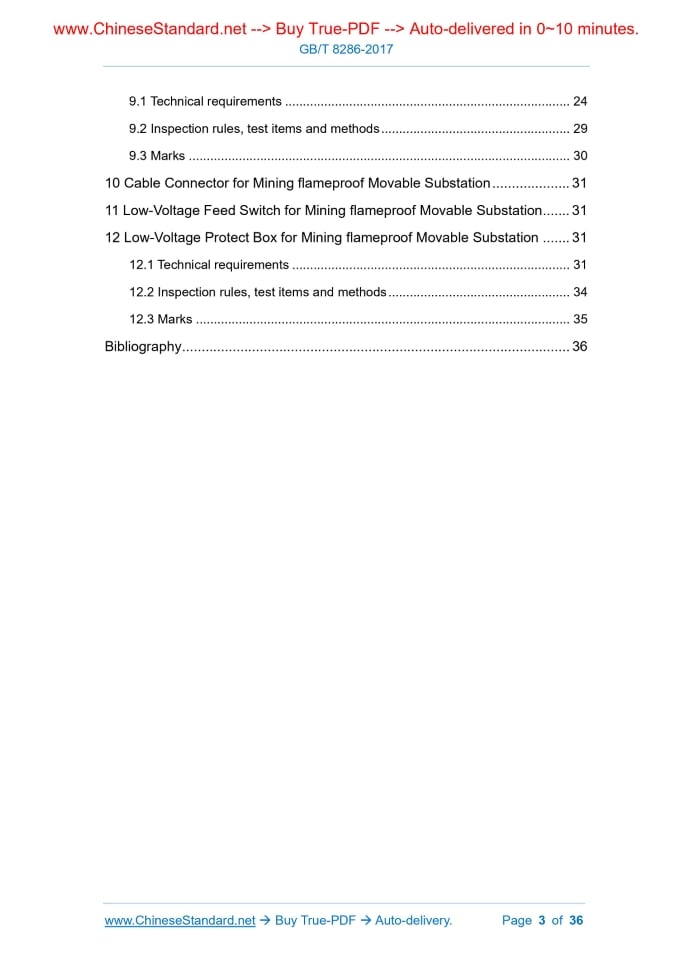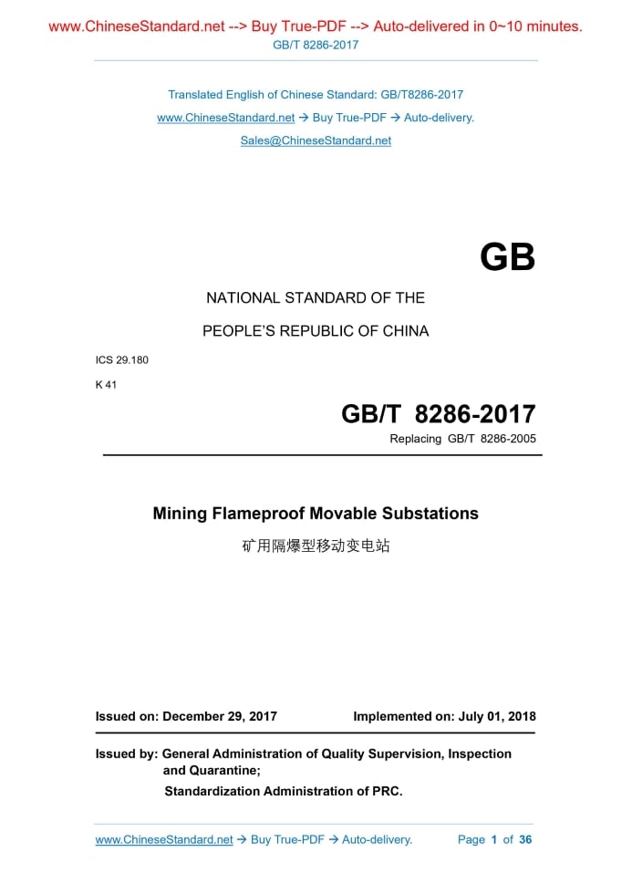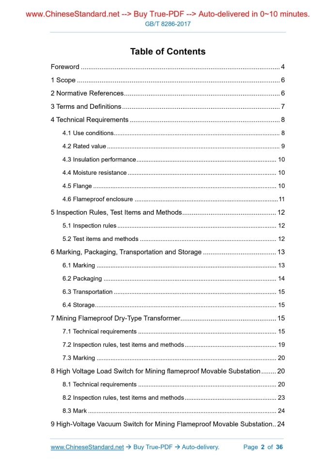 Similar standardsGB/T 8286-2017: Mining Flameproof Movable Substations---This is an excerpt. Full copy of true-PDF in English version (including equations, symbols, images, flow-chart, tables, and figures etc.), auto-downloaded/delivered in 9 seconds, can be purchased online: https://www.ChineseStandard.net/PDF.aspx/GBT8286-2017NATIONAL STANDARD OF THE PEOPLE’S REPUBLIC OF CHINA ICS 29.180 K 41 Replacing GB/T 8286-2005 Mining Flameproof Movable Substations ISSUED ON: DECEMBER 29, 2017 IMPLEMENTED ON: JULY 01, 2018 Issued by: General Administration of Quality Supervision, Inspection and Quarantine; Standardization Administration of PRC. Table of ContentsForeword ... 4 1 Scope ... 6 2 Normative References ... 6 3 Terms and Definitions ... 7 4 Technical Requirements ... 8 4.1 Use conditions ... 8 4.2 Rated value ... 9 4.3 Insulation performance ... 10 4.4 Moisture resistance ... 10 4.5 Flange ... 10 4.6 Flameproof enclosure ... 11 5 Inspection Rules, Test Items and Methods ... 12 5.1 Inspection rules ... 12 5.2 Test items and methods ... 12 6 Marking, Packaging, Transportation and Storage ... 13 6.1 Marking ... 13 6.2 Packaging ... 14 6.3 Transportation ... 15 6.4 Storage ... 15 7 Mining Flameproof Dry-Type Transformer ... 15 7.1 Technical requirements ... 15 7.2 Inspection rules, test items and methods ... 19 7.3 Marking ... 20 8 High Voltage Load Switch for Mining flameproof Movable Substation ... 20 8.1 Technical requirements ... 20 8.2 Inspection rules, test items and methods ... 23 8.3 Mark ... 24 9 High-Voltage Vacuum Switch for Mining Flameproof Movable Substation .. 24 9.1 Technical requirements ... 24 9.2 Inspection rules, test items and methods ... 29 9.3 Marks ... 30 10 Cable Connector for Mining flameproof Movable Substation ... 31 11 Low-Voltage Feed Switch for Mining flameproof Movable Substation ... 31 12 Low-Voltage Protect Box for Mining flameproof Movable Substation ... 31 12.1 Technical requirements ... 31 12.2 Inspection rules, test items and methods ... 34 12.3 Marks ... 35 Bibliography ... 36 Mining Flameproof Movable Substations1 ScopeThis Standard specifies the terms and definitions, technical requirements, inspection rules, test items and methods, marking, packaging, transport and storage of mining flameproof movable substation (hereinafter referred to as movable substation) and its components, namely the mining flameproof dry-type transformer (hereinafter referred to as dry-type transformer), high-voltage load switch for mining flameproof movable substation (hereinafter referred to as high-voltage load switch) or high-pressure vacuum switch for mining flameproof movable substation (hereinafter referred to as high-pressure vacuum switch), cable connector for mining flameproof movable substation (hereinafter referred to as cable connector), and low-voltage feed switch for mining flameproof movable substation (hereinafter referred to as low-voltage feed switch) or low-voltage protect box for mining flameproof movable substation (hereinafter referred to as low-voltage protective box). This Standard is applicable to movable substation and its dedicated dry-type transformer, high-voltage load switch or high-voltage vacuum switch, cable connector and low-voltage feed switch or low-voltage protect box.2 Normative ReferencesThe following documents are essential to the application of this document. For the dated documents, only the versions with the dates indicated are applicable to this document; for the undated documents, only the latest version (including all the amendments) are applicable to this document. GB/T 191 Packaging – Pictorial Marking for Handling of Goods GB/T 311.1 Insulation Coordination – Part 1: Definitions, Principles and Rules GB/T 1094.11 Power Transformers – Part 11: Dry-Type Transformers GB/T 1984 High-Voltage Alternating-Current Circuit-Breakers GB/T 1985 High-Voltage Alternating-Current Disconnector and Earthing Switches GB/T 2900.1 Electrotechnical Terminology – Fundamental Terms GB/T 2900.18 Electrotechnical Terminology – Low Voltage Apparatus GB/T 2900.19 Electrotechnical Terminology – High-Voltage Test Technique and Insulation Coordination GB/T 2900.20 Electrotechnical Terminology – High-Voltage Switchgear and Controlgear GB/T 2900.35 Electrotechnical Terminology – Electrical Apparatus for Explosive Atmosphere GB/T 2900.95 Electrotechnical Terminology – Transformers, Voltage Regulators and Reactors GB/T 3309 Mechanical Test at Ambient Temperature for High-Voltage Switchgear GB/T 3804 High-Voltage Alternating Current Switches for Rated Voltage above 3.6kv and less than 40.5kv GB 3836.1 Explosive Atmospheres - Part 1: Equipment - General Requirements GB 3836.2 Explosive Atmospheres - Part 2: Equipment Protection by Flameproof Enclosures “d” GB/T 11022 Common Specifications for High-Voltage Switchgear and Controlgear Standards GB/T 14048.1 Low-Voltage Switchgear and Controlgear - Part 1: General Rules GB/T 16927.1 High-Voltage Test Techniques - Part 1: General Definitions and Test Requirements AQ 1043-2007 Mining Products Safety Label JB/T 501 Test Guide for Power Transformers JB/T 8739 Mine Explosion-Proof High-Voltage Distribution Device MT 871 Mining Blast-Proof Switchgear with Vacuum Circuit Breaker for Low- voltage Alternate Circuit MT/T 947 Flameproof High-Voltage Cable Coupling Devices for Coal Mine3 Terms and DefinitionsFor the purpose of this document, the terms and definitions given in GB/T 2900.1, GB/T 2900.18, GB/T 2900.19, GB/T 2900.20, GB/T 2900.35 and GB/T 2900.95 and the following apply.5 Inspection Rules, Test Items and Methods5.1 Inspection rules Each component of the movable substation shall be respectively inspected in accordance with the provisions of the corresponding standards; the inspection procedures shall be in accordance with the relevant provisions of GB 3836.1. 5.2 Test items and methods 5.2.1 Routine test 5.2.1.1 Each movable substation shall withstand the following routine test items: a) Inspe