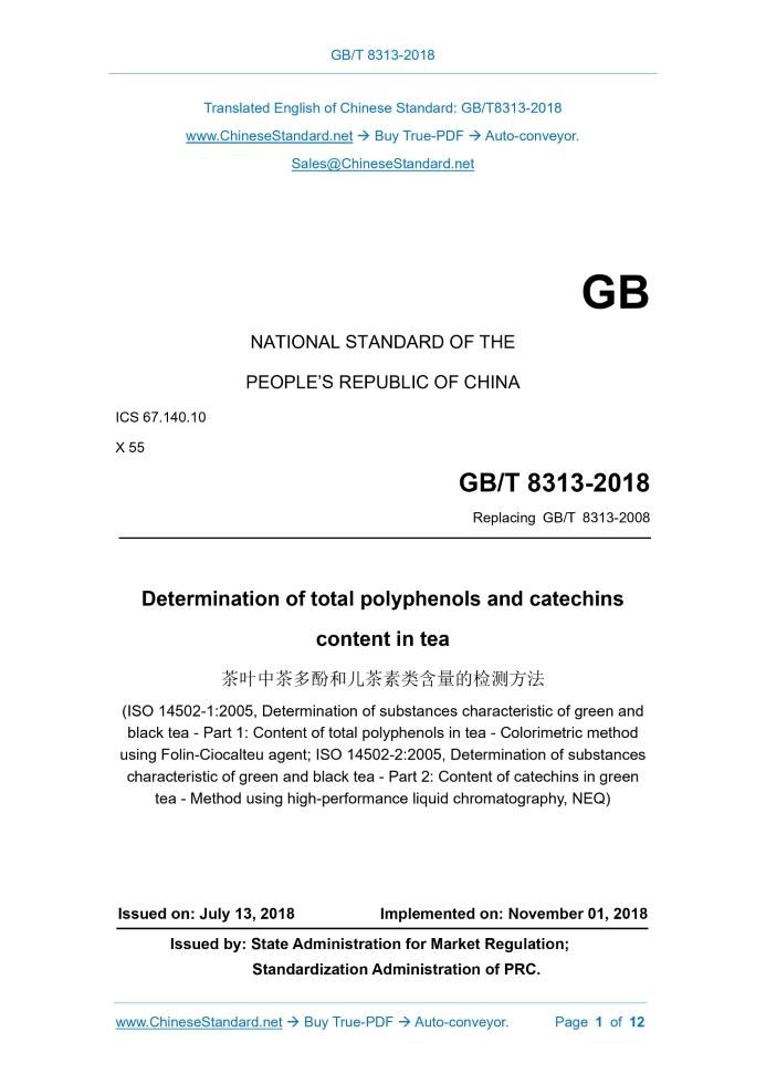GB/T 8313-2018: Determination of total polyphenols and catechins content in tea Delivery: 9 seconds. True-PDF full-copy in English & invoice will be downloaded + auto-delivered via email. See step-by-step procedure Status: Valid GB/T 8313: Historical versions