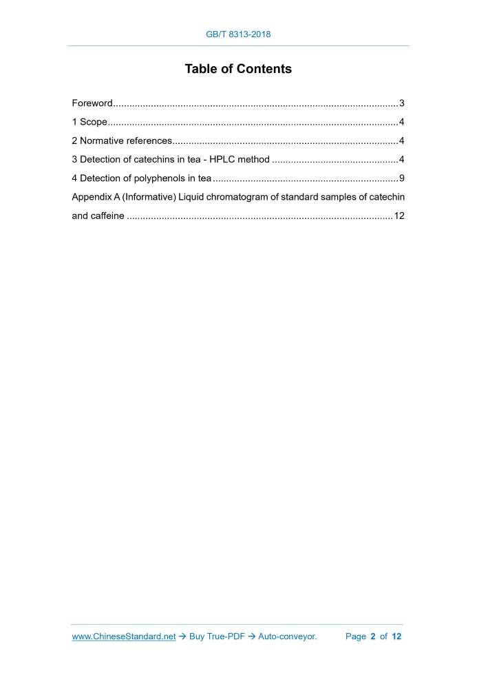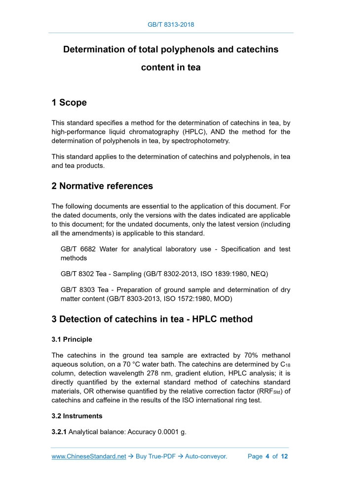 Similar standardsGB/T 8313-2018: Determination of total polyphenols and catechins content in tea---This is an excerpt. Full copy of true-PDF in English version (including equations, symbols, images, flow-chart, tables, and figures etc.), auto-downloaded/delivered in 9 seconds, can be purchased online: https://www.ChineseStandard.net/PDF.aspx/GBT8313-2018GB NATIONAL STANDARD OF THE PEOPLE’S REPUBLIC OF CHINA ICS 67.140.10 X 55 Replacing GB/T 8313-2008 Determination of total polyphenols and catechins content in tea (ISO 14502-1:2005, Determination of substances characteristic of green and black tea - Part 1: Content of total polyphenols in tea - Colorimetric method using Folin-Ciocalteu agent; ISO 14502-2:2005, Determination of substances characteristic of green and black tea - Part 2: Content of catechins in green tea - Method using high-performance liquid chromatography, NEQ) ISSUED ON: JULY 13, 2018 IMPLEMENTED ON: NOVEMBER 01, 2018 Issued by: State Administration for Market Regulation; Standardization Administration of PRC. Table of ContentsForeword ... 3 1 Scope ... 4 2 Normative references ... 4 3 Detection of catechins in tea - HPLC method ... 4 4 Detection of polyphenols in tea ... 9 Appendix A (Informative) Liquid chromatogram of standard samples of catechin and caffeine ... 12 Determination of total polyphenols and catechins content in tea1 ScopeThis standard specifies a method for the determination of catechins in tea, by high-performance liquid chromatography (HPLC), AND the method for the determination of polyphenols in tea, by spectrophotometry. This standard applies to the determination of catechins and polyphenols, in tea and tea products.2 Normative referencesThe following documents are essential to the application of this document. For the dated documents, only the versions with the dates indicated are applicable to this document; for the undated documents, only the latest version (including all the amendments) is applicable to this standard. GB/T 6682 Water for analytical laboratory use - Specification and test methods GB/T 8302 Tea - Sampling (GB/T 8302-2013, ISO 1839:1980, NEQ) GB/T 8303 Tea - Preparation of ground sample and determination of dry matter content (GB/T 8303-2013, ISO 1572:1980, MOD)3 Detection of catechins in tea - HPLC method3.1 Principle The catechins in the ground tea sample are extracted by 70% methanol aqueous solution, on a 70 °C water bath. The catechins are determined by C18 column, detection wavelength 278 nm, gradient elution, HPLC analysis; it is directly quantified by the external standard method of catechins standard materials, OR otherwise quantified by the relative correction factor (RRFStd) of catechins and caffeine in the results of the ISO international ring test. 3.2 Instruments 3.2.1 Analytical balance: Accuracy 0.0001 g. (EGCG) 2.00 mg/mL, epicatechin gallate (ECG) 2.00 mg/mL. 3.3.11 Standard working solution: Prepared by the stable solution (3.3.8). Standard working solution's concentration: Gallic acid 5 μg/mL ~ 25 μg/mL, caffeine 50 μg/mL ~ 150 μg/mL, +C 50 μg/mL ~ 150 μg/mL, EC 50 μg/mL ~ 150 μg/mL, EGC 100 μg/mL ~ 300 μg/mL, EGCG 100 μg/mL ~ 400 μg/mL, ECG 50 μg/mL ~ 200 μg/mL. 3.3.12 0.45 μm organic phase filter membrane. 3.4 Operation method 3.4.1 Sampling It is carried out according to the provisions of GB/T 8302. 3.4.2 Sample preparation It is carried out according to the provisions of GB/T 8303. 3.4.3 Determination procedure 3.4.3.1 Determination of dry matter content It is carried out according to the provisions of GB/T 8303. 3.4.3.2 Preparation of test solution 3.4.3.2.1 Mother liquor: Weigh 0.2 g (accurate to 0.0001 g) of uniformly ground sample (3.4.2), into a 10 mL centrifuge tube. Add 5 mL of 70% methanol aqueous solution (3.3.5), which was pre-heated at 70 °C. Use a glass rod to fully stir, to evenly moisten it. Immediately transfer it into a 70 °C water bath (3.2.2). Extract for 10 minutes (stir it once every 5 minutes). Cool to room temperature after extraction. Transfer it into a centrifuge at 3500 r/min. Centrifuge for 10 min. Transfer the supernatant to a 10 mL volumetric flask. Use 5 mL of 70% methanol aqueous solution, to extract the residue once again. Repeat the above operation. Combine the extracts. Make the volume reach to 10 mL. Shake well. Use a 0.45 μm membrane (3.3.12) to filter it. Prepare for use (the extract can be stored at 4 °C for up to 24 h). 3.4.3.2.2 Test solution: Use a pipette to transfer 2 mL of mother liquor (3.4.3.2.1), into a 10 mL volumetric flask. Use the stable solution (3.3.8) to make its volume reach to the mark. Shake well. Pass through a 0.45 μm membrane (3.3.12), to be tested. 3.4.3.3 Chromatographic conditions The relative error of the two measured values of the total amount of catechins, in the same sample, shall be ≤ 10%. If the relative error of the measured value is within this range, take the arithmetic mean of the two measured values as the result; keep two decimal places.4 Detection of polyphenols in tea4.1 Principle The polyphenols in the ground tea samples are extracted by 70% methanol aqueous solution, in a 70 °C water bath. The Folin phenol reagent oxidizes the -OH groups in the polyphenols and appears blue. The maximum absorption wavelength λ is 765 nm. Gallic acid is used as a calibration standard, to quantify the polyphenols. 4.2 Instruments 4.2.1 Analytical balance: Accuracy of 0.001 g. 4.2.2 Water bath: 70 °C ± 1 °C. 4.2.3 Centrifuge: Speed 3500 r/min. 4.2.4 Spectrophotometer. 4.3 Reagents 4.3.1 Methanol. 4.3.2 Sodium carbonate (Na2CO3). 4.3.3 70% methanol aqueous solution. 4.3.4 Folin-Ciocalteu: 1 mol/L. 4.3.5 10% Folin-Ciocalteu reagent (equipped before use): Transfer 20 mL of Folin-Ciocalteu reagent (4.3.4) into a 200 mL volumetric flask. Use water to make its volume reach to the mark. Shake well. 4.3.6 The 7.5% sodium carbonate (Na2CO3) solution: Weigh 37.50 g ± 0.01 g of sodium carbonate (Na2CO3) (4.3.2). Add an appropriate amo