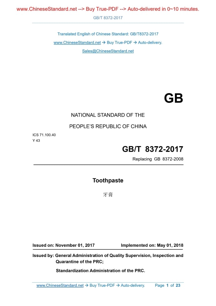 GB/T 8372-2017: Toothpaste Delivery: 9 seconds. True-PDF full-copy in English & invoice will be downloaded + auto-delivered via email. See step-by-step procedure Status: Valid GB/T 8372: Historical versions