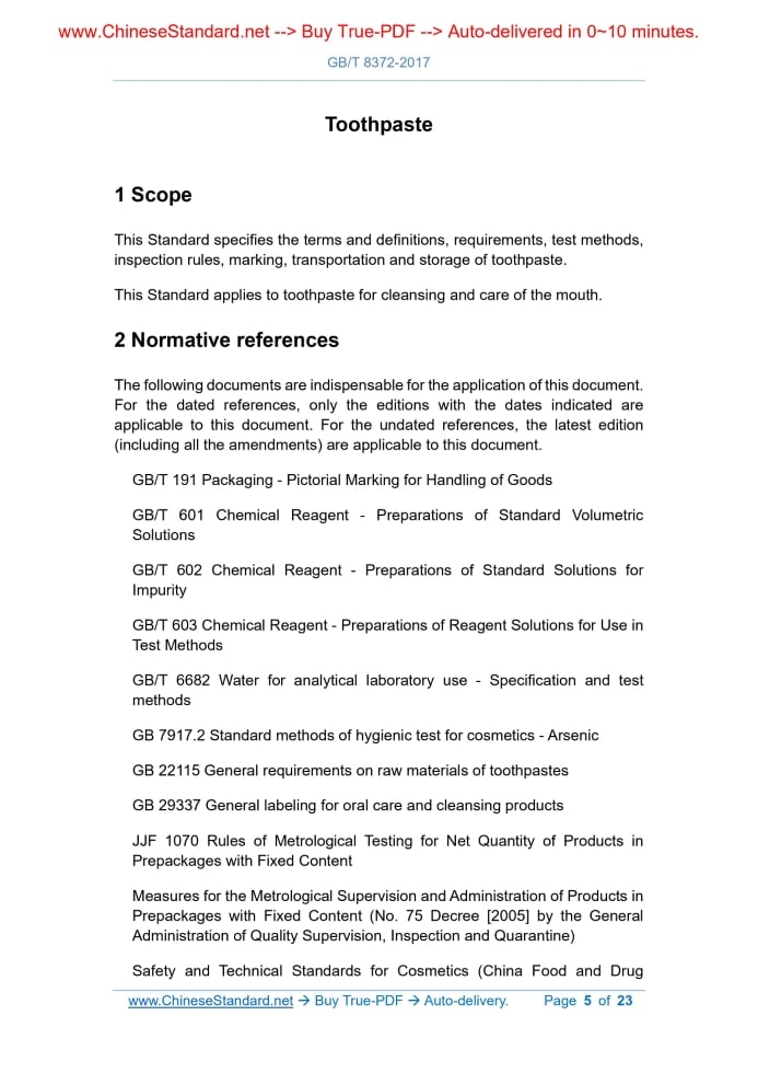 Similar standardsGB/T 8372-2017: Toothpaste---This is an excerpt. Full copy of true-PDF in English version (including equations, symbols, images, flow-chart, tables, and figures etc.), auto-downloaded/delivered in 9 seconds, can be purchased online: https://www.ChineseStandard.net/PDF.aspx/GBT8372-2017NATIONAL STANDARD OF THE PEOPLE’S REPUBLIC OF CHINA ICS 71.100.40 Y 43 Replacing GB 8372-2008 Toothpaste Issued on. NOVEMBER 01, 2017 Implemented on. MAY 01, 2018 Issued by. General Administration of Quality Supervision, Inspection and Quarantine of the PRC; Standardization Administration of the PRC. Table of ContentsForeword... 3 1 Scope... 5 2 Normative references... 5 3 Terms and definitions... 6 4 Requirements... 6 5 Test methods... 8 6 Inspection rules... 18 7 Marking... 20 8 Transportation and storage... 20 Appendix A (Normative) Determination of lead content by direct injection of graphite furnace... 21 Appendix B (Informative) Gas chromatogram of fluoride ion standard solution ... 231 ScopeThis Standard specifies the terms and definitions, requirements, test methods, inspection rules, marking, transportation and storage of toothpaste. This Standard applies to toothpaste for cleansing and care of the mouth.2 Normative referencesThe following documents are indispensable for the application of this document. For the dated references, only the editions with the dates indicated are applicable to this document. For the undated references, the latest edition (including all the amendments) are applicable to this document. GB/T 191 Packaging - Pictorial Marking for Handling of Goods GB/T 601 Chemical Reagent - Preparations of Standard Volumetric Solutions GB/T 602 Chemical Reagent - Preparations of Standard Solutions for Impurity GB/T 603 Chemical Reagent - Preparations of Reagent Solutions for Use in Test Methods GB/T 6682 Water for analytical laboratory use - Specification and test methods GB 7917.2 Standard methods of hygienic test for cosmetics - Arsenic GB 22115 General requirements on raw materials of toothpastes GB 29337 General labeling for oral care and cleansing products JJF 1070 Rules of Metrological Testing for Net Quantity of Products in Prepackages with Fixed Content3 Terms and definitionsThe following terms and definitions apply to this document. 3.1 Toothpaste A paste-like substance composed of a friction agent, a moisturizer, a thickener, a foaming agent, an aromatic, water, and other additives (including a functional composition for improving oral health) as the main raw materials.4 Requirements4.1 Safety requirements Under normal or reasonably foreseeable conditions of use, toothpaste shall not cause harm to human health. 4.2 Raw material requirements for toothpaste The raw materials used in the production of toothpaste shall meet the requirements of GB 22115. 4.4 Sensory, physical and chemical indicators The sensory and physical and chemical indicators of toothpaste products shall meet the requirements of Table 2. 4.5 Net quantity The net quantity of toothpaste products shall comply with the requirements of “Measures for the Metrological Supervision and Administration of Products in Prepackages with Fixed Content”. 4.6 Packaging appearance requirements5 Test methodsThe reagents and water used in this Standard, unless otherwise specified, are analytically pure reagents and water in accordance with GB/T 6682. 5.1 Microbiological indicators It shall be in accordance with Clause 5 Microbiological inspection methods of “Safety and Technical Standards for Cosmetics”. 5.2 Lead (Pb) content 5.2.1 General This method is an arbitration inspection method. Non-arbitration inspection may be carried out in accordance with the provisions of Appendix A. 5.2.2 Toothpaste with calcium carbonate or calcium hydrogen phosphate as friction agent 5.2.2.1.12 Trichloromethane. 5.2.2.1.13 Hg2+ solution. WEIGH 0.537 g of mercury oxide in a small beaker; ADD 1 mL of nitric acid to dissolve it; ADD about 50 mL of water and filter; WASH the beaker and funnel with a little water. ADD about 480 mL of water; USE 5 mol/L and 0.2 mol/L nitric acid solution to adjust the pH to 1.6; ADD water to 500 mL. The solution contains Hg2+ 1000 μg/mL. 5.2.2.2 Apparatus 5.2.2.2.1 pH meter. Accuracy is 0.02pH unit. USE pH=4.00 buffer solution to correct. 5.2.3 Toothpaste with silica or aluminum hydroxide as friction agent 5.2.3.1 Reagents Sulfuric acid. Other reagents are the same as 5.2.2.1. 5.2.3.2 Apparatus Same as 5.2.2.2. 5.2.3.3 Preparation and determination of sample 5.2.3.3.1 Silica toothpaste Randomly take 1 sample toothpaste, from which weigh 2 g of toothpaste, accurate to 0.01 g; PLACE it in a 250 mL conical flask; ADD 5 mL of water and 5 mL of nitric acid; USE a small fire to heat, until the paste dissolves. Slightly cool, add 1.5 mL of hydrogen peroxide solution and shake; USE a small fire to heat, until reddish brown nitrogen dioxide gas generates. Immediately add 2 mL of 10% ammonium sulfamate solution; REMOVE when slightly hot; ADD 20 mL of water; COOL to room temperature; USE two layers of filter paper to suction- filter. 5.2.3.3.2 Aluminum hydroxide toothpaste Randomly take 1 sample toothpaste, from which weigh 2 g of toothpaste, accurate to 0.01 g; PLACE it in a 250 mL conical flask; ADD 15 mL of nitric acid and 1 mL of sulfuric acid; HEAT until reddish brown nitrogen dioxide gas generates and remove. Slightly cool, add 2 mL of hydrogen peroxide solution and shake; 5.2.4 Allowable difference The allowable difference of the results of the two parallel determinations is ±5%. 5.3 Arsenic content It shall be in accordance with the arsenic stain method in GB 7917.2. 5.4 Paste Randomly take 2 sample toothpaste. After cutting the hose, visually test according to the sensory indicator requirements in Table 2. 5.5 pH value 5.5.1 Apparatus 5.5.2 Determination procedure Randomly take 1 sample toothpaste, from which weigh 5 g of toothpaste, accurate to 0.01 g. PLACE it in a 50 mL beaker; ADD 20 mL of 
