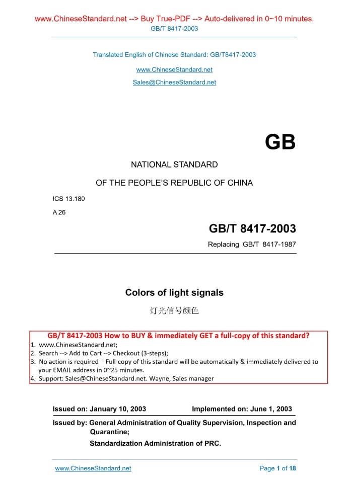 GB/T 8417-2003: Colours of light signals Delivery: 9 seconds. True-PDF full-copy in English & invoice will be downloaded + auto-delivered via email. See step-by-step procedure Status: Valid GB/T 8417: Historical versions