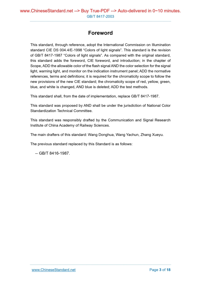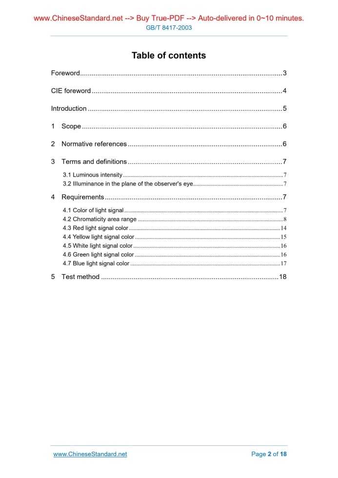 Similar standardsGB/T 8417-2003: Colours of light signals---This is an excerpt. Full copy of true-PDF in English version (including equations, symbols, images, flow-chart, tables, and figures etc.), auto-downloaded/delivered in 9 seconds, can be purchased online: https://www.ChineseStandard.net/PDF.aspx/GBT8417-2003GB NATIONAL STANDARD OF THE PEOPLE’S REPUBLIC OF CHINA ICS 13.180 A 26 Replacing GB/T 8417-1987 Colors of light signals Issued on: JANUARY 10, 2003 Implemented on: JUNE 1, 2003 Issued by. General Administration of Quality Supervision, Inspection and Quarantine; Standardization Administration of PRC. Table of ContentsForeword ... 3 CIE foreword ... 4 Introduction ... 5 1 Scope ... 6 2 Normative references ... 6 3 Terms and definitions ... 7 3.1 Luminous intensity ... 7 3.2 IIIuminance in the plane of the observer's eye ... 7 4 Requirements ... 7 4.1 Color of light signal ... 7 4.2 Chromaticity area range ... 8 4.3 Red light signal color ... 14 4.4 Yellow light signal color ... 15 4.5 White light signal color ... 16 4.6 Green light signal color ... 16 4.7 Blue light signal color ... 17 5 Test method ... 18ForewordThis standard, through reference, adopt the International Commission on Illumination standard CIE DS 004.4/E-1998 “Colors of light signals”. This standard is the revision of GB/T 8417-1987 “Colors of light signals”. As compared with the original standard, this standard adds the foreword, CIE foreword, and introduction; in the chapter of Scope, ADD the allowable color of the flash signal AND the color selection for the signal light, warning light, and monitor on the indication instrument panel; ADD the normative references, terms and definitions; it is required for the chromaticity scope to follow the new provisions of the new CIE standard; the chromaticity scope of red, yellow, green, blue, and white is changed, AND blue is deleted; ADD the test methods. This standard shall, from the date of implementation, replace GB/T 8417-1987. This standard was proposed by AND shall be under the jurisdiction of National Color Standardization Technical Committee. This standard was responsibly drafted by the Communication and Signal Research Institute of China Academy of Railway Sciences. The main drafters of this standard. Wang Donghua, Wang Yachun, Zhang Xueyu. The previous standard replaced by this Standard is as follows. -- GB/T 8416-1987. Colors of light signals1 ScopeThis standard specifies the chromaticity area range and test methods for the color of the light signal (including the flash signal). This standard applies to signal lights used in ocean, inland waterway, road, aviation, and railway transport system, including the signal lights used in ships, cars, aircraft and trains. The standard also applies to the signal lights and monitors on the industrial control monitoring instrument panel. This standard does apply neither to automotive headlamps and fog lamps, nor to the light source of very low color temperature which is used in maritime lights.2 Normative referencesThe following documents contain provisions which, through reference in this text, constitute provisions of this International Standard. For dated references, all subsequent amendments, including corrigenda or revisions, are applicable to this standard. However, parties to agreements based on this standard are encouraged to investigate the possibility of using the most recent versions of these documents. For undated references, the latest version applies to this standard. The provisions in following documents become the provisions of this standard through reference in this standard. For the dated references, the subsequent amendments (excluding corrections) or revisions do not apply to this standard; however, parties who reach an agreement based on this standard are encouraged to study if the latest versions of these documents are applicable. For undated references, the latest edition of the referenced document applies. GB/T 5697 Illuminated terminology for human engineering GB/T 5698 Glossary of color terms GB/T 3977 Specification of colors3 Terms and definitionsThe terms and definitions as determined in GB/T 5697 and GB/T 5698 AND below apply to this standard. 3.1 Luminous intensity It refers to, within the range of the solid angle (dΩ) along a given direction, the ratio between the emitted light flux (dφ) from the light source and this solid angle. I = dφ/dΩ Where. I - The luminous intensity of the light source along a given direction, cd; dφ - The emitted light flux of the light source along a given direction, lm; dΩ - The solid angle containing a given direction, sr. 3.2 IIIuminance in the plane of the observer's eye It refers to the illuminance in the plane of the observer’s eye. E = ITd/d2 Where. E - The illuminance in the plane of the observer’s eye, lx; I - The luminous intensity of the light source along the direction of the observer's eye, cd; d - The distance between the observer and the light source, m; T - The transmittance of light in air for the unit distance.4 Requirements4.1 Color of light signal The color of the light signal is red, yellow, white, green and blue; AND it is not allowed to use other colors. Figure 5 Chromaticity area the blue light signal colors drawn on the CIE 1931 chromaticity diagram (x, y) 4.5 White light signal color 4.5.1 Category A Except for the conditions as specified in 4.5.2, the white light signal color must be within the chromaticity range IJKL. 4.5.2 Category B When the following conditions occur, the white light signal color must be in the chromaticity area IJJ'K'KL. a) In the same signal system, there is no yellow signal; b) The signal does not need to be distinguished from extraneous background yellow light, such as sodium lamps and low-temperature incandescent lamps used in road lighting; c) The distance between the observer and the signal is less than 5 km; d) The signal will not be greatly attenuated by air pollution or bad weather. Note 1