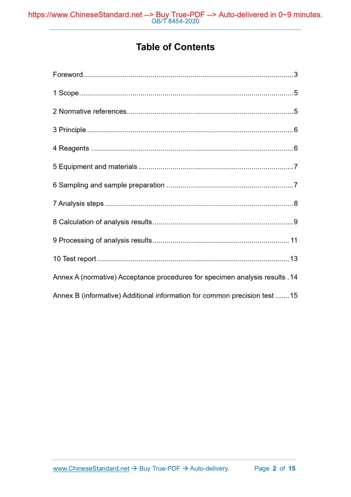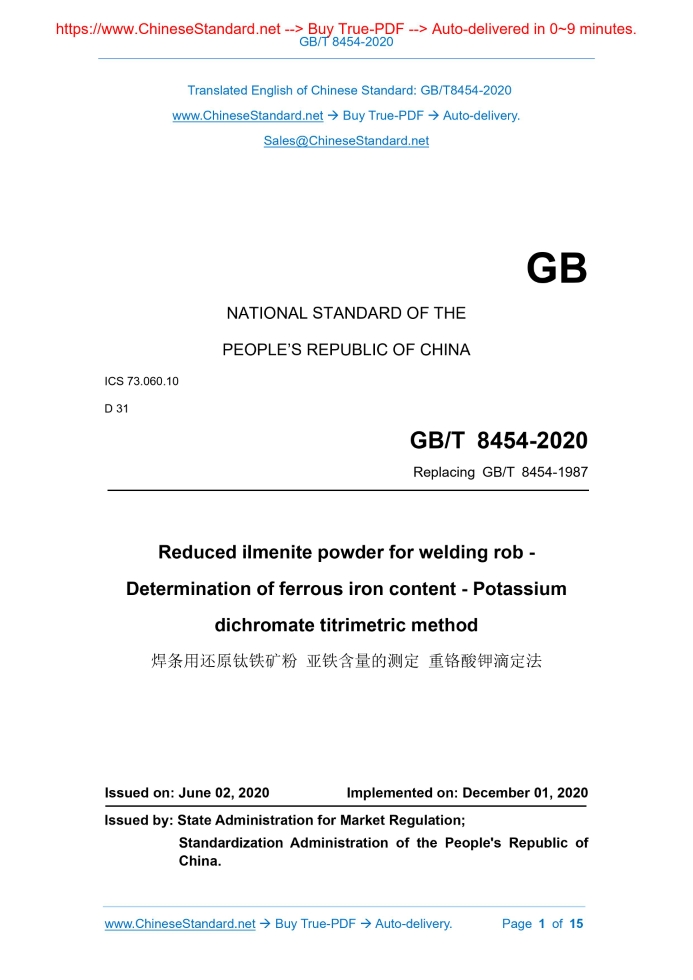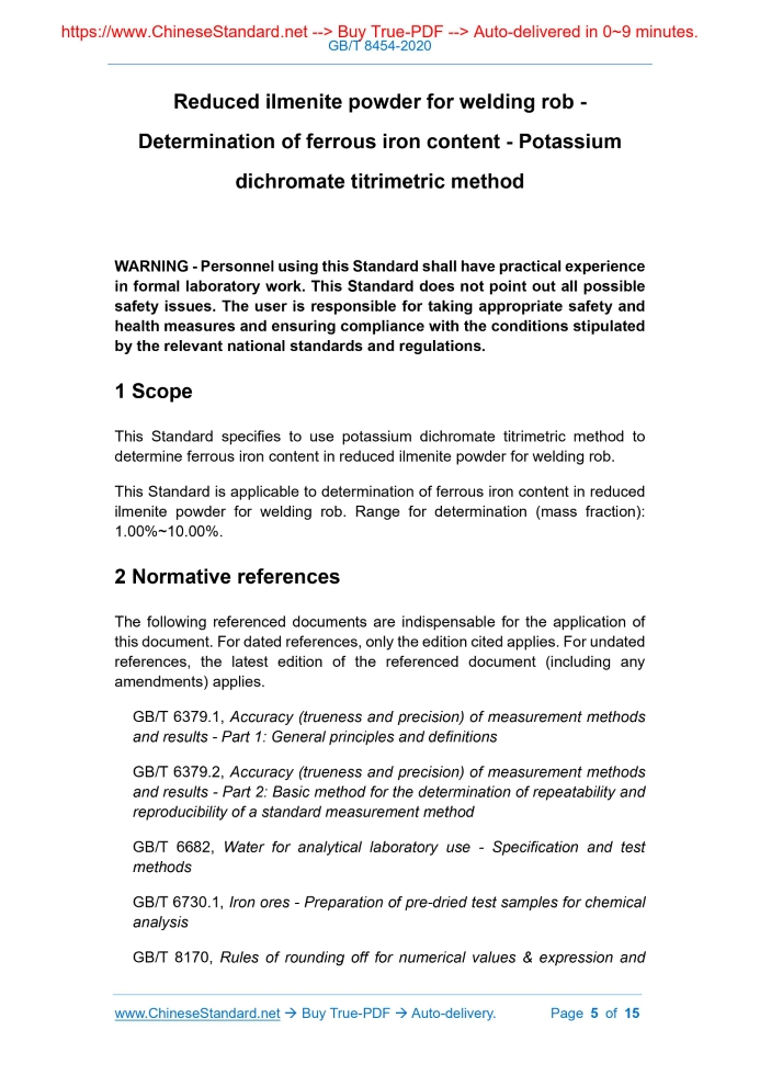 Similar standardsGB/T 8454-2020: Reduced ilmenite powder for welding rob - Determination of ferrous iron content - Potassium dichromate titrimetric method---This is an excerpt. Full copy of true-PDF in English version (including equations, symbols, images, flow-chart, tables, and figures etc.), auto-downloaded/delivered in 9 seconds, can be purchased online: https://www.ChineseStandard.net/PDF.aspx/GBT8454-2020 GB NATIONAL STANDARD OF THE PEOPLE’S REPUBLIC OF CHINA ICS 73.060.10 D 31 Replacing GB/T 8454-1987 Reduced ilmenite powder for welding rob - Determination of ferrous iron content - Potassium dichromate titrimetric method ISSUED ON: JUNE 02, 2020 IMPLEMENTED ON: DECEMBER 01, 2020 Issued by: State Administration for Market Regulation; Standardization Administration of the People's Republic of China. Table of ContentsForeword ... 3 1 Scope ... 5 2 Normative references ... 5 3 Principle ... 6 4 Reagents ... 6 5 Equipment and materials ... 7 6 Sampling and sample preparation ... 7 7 Analysis steps ... 8 8 Calculation of analysis results ... 9 9 Processing of analysis results ... 11 10 Test report ... 13 Annex A (normative) Acceptance procedures for specimen analysis results . 14 Annex B (informative) Additional information for common precision test ... 15 Reduced ilmenite powder for welding rob - Determination of ferrous iron content - Potassium dichromate titrimetric method WARNING - Personnel using this Standard shall have practical experience in formal laboratory work. This Standard does not point out all possible safety issues. The user is responsible for taking appropriate safety and health measures and ensuring compliance with the conditions stipulated by the relevant national standards and regulations.1 ScopeThis Standard specifies to use potassium dichromate titrimetric method to determine ferrous iron content in reduced ilmenite powder for welding rob. This Standard is applicable to determination of ferrous iron content in reduced ilmenite powder for welding rob. Range for determination (mass fraction): 1.00%~10.00%.2 Normative referencesThe following referenced documents are indispensable for the application of this document. For dated references, only the edition cited applies. For undated references, the latest edition of the referenced document (including any amendments) applies. GB/T 6379.1, Accuracy (trueness and precision) of measurement methods and results - Part 1: General principles and definitions GB/T 6379.2, Accuracy (trueness and precision) of measurement methods and results - Part 2: Basic method for the determination of repeatability and reproducibility of a standard measurement method GB/T 6682, Water for analytical laboratory use - Specification and test methods GB/T 6730.1, Iron ores - Preparation of pre-dried test samples for chemical analysis GB/T 8170, Rules of rounding off for numerical values & expression and 4.10 Sulfuric acid-phosphoric acid mixed acid, 2+3+5. 4.11 Saturated boric acid solution. 4.12 Ferric chloride solution, 100g/L. Weigh 100.0g of iron trichloride (FeCl3 • 6H2O) to dissolve in 1000mL of water. Mix well. If the solution is turbid, it shall be filtered before use. 4.13 Ferrous ammonium sulfate solution, about 0.03mol/L. Weigh 11.8g of ferrous ammonium sulfate [(NH3)2Fe(SO4)2 • 6H2O] to dissolve in 500mL of sulfuric acid (5+95). Use sulfuric acid (5+95) to transfer and dilute to 1000mL. Mix well. 4.14 Potassium dichromate standard titration solution, c(1/6K2Cr2O7) = 0.05000mol/L. Weigh 2.4518g of the reference reagent potassium dichromate, which has been dried at 150°C for 1h and cooled to room temperature in a desiccator. Dissolve in 500mL of water. Transfer to a 1000mL volumetric flask. Use water to dilute to the scale. Mix well. 4.15 Sodium diphenylamine sulfonate indicator solution, 2g/L. Weigh 0.20g of sodium diphenylamine sulfonate to dissolve in 100mLof water. Mix well. If the solution is turbid, it shall be filtered before use.5 Equipment and materialsUnless otherwise specified, use normal laboratory equipment. Burettes, single- marked volumetric flasks and single-marked pipettes shall meet the requirements of GB/T 12805, GB/T 12806 and GB/T 12808 respectively. 5.1 Metal iron core stirrer (non-magnetic), covered with PTFE plastic. 5.2 Adjustable speed magnetic stirrer. 5.3 Non-magnetic sample spoon.6 Sampling and sample preparation6.1 Laboratory specimen Conduct sampling and sample preparation according to GB/T 10322.1. The particle size of the laboratory specimen for analysis shall be less than 74μm. standard titration solution consumed, V2. Add 10.00mL of ferrous ammonium sulfate solution to the solution again (see 4.13). Use potassium dichromate standard titration solution (see 4.14) to titrate till stable purple. Write down the titrated volume V3. (V2-V3) is the blank of the total amount of ferrous iron and metallic iron. 7.4 Determination of metallic iron 7.4.1 Weigh 0.50g of sample, to the nearest of 0.0001g. Place in a dry 150mL Erlenmeyer flask. Add 30mL of ferric chloride solution (see 4.12). Add the magnetic core. Plug the rubber stopper. Stir on the electromagnetic stirrer for 60min. 7.4.2 Remove. Use medium speed filter paper to filter into a 250mL volumetric flask. Wash the conical flask 5 times and filter paper 5 times. Dilute to the scale. Mix well. Pipette 50.00mL of solution into a 300mL Erlenmeyer flask. 7.4.3 Add 15mL of sulfuric acid-phosphoric acid mixed acid (see 4.10) to the solution obtained in 7.4.2. Add 3 drops of sodium diphenylamine sulfonate indicator solution (see 4.15). Use potassium dichromate standard titration solution (see 4.14) to titrate till stable purple as the end point. Write down the volume of potassium dichromate standard titration solution consumed V4. 7.4.4 Into the blank solution accompanying with the sample, accurately add 10.00mL of ferrous ammonium sulfate solution (see 4.13), 15mL of sulfuric acid- phosphoric acid mixed acid (see 4.10), and 3 drops of sodium diphenylamin