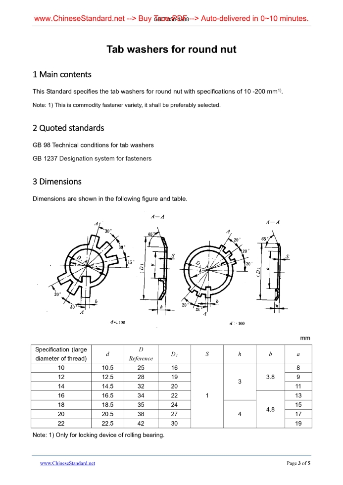 Similar standardsGB/T 858-1988: Tab washers for round nut---This is an excerpt. Full copy of true-PDF in English version (including equations, symbols, images, flow-chart, tables, and figures etc.), auto-downloaded/delivered in 9 seconds, can be purchased online: https://www.ChineseStandard.net/PDF.aspx/GBT858-1988GB National Standard of the People’s Republic of China Replacing GB/T 858-1976 Tab washers for round nut APPROVED ON. JANUARY 26, 1988 Implemented on: JANUARY 1, 1989 Approved by. the State Mechanical Industry Committee Table of Contents1 Main contents... 3 2 Quoted standards... 3 3 Dimensions... 3 4 Technical conditions... 5 5 Marking... 5 Tab washers for round nut1 Main contentsThis Standard specifies the tab washers for round nut with specifications of 10 -200 mm1). Note. 1) This is commodity fastener variety, it shall be preferably selected.2 Quoted standardsGB 98 Technical conditions for tab washers GB 1237 Designation system for fasteners3 DimensionsDimensions are shown in the following figure and table. mm Specification (large diameter of thread) Reference D1 S h b a 10 10.5 25 16 3.8 12 12.5 28 19 9 14 14.5 32 20 11 16 16.5 34 22 4.8 18 18.5 35 24 20 20.5 38 27 17 22 22.5 42 30 19 Note. 1) Only for locking device of rolling bearing.4 Technical conditionsIt shall be according to GB 98.5 Marking5.1 Marking method shall be according to the provisions of GB 1237. 5.2 Marking example. Marking example of tab washer for round nut with specification of 16mm, material of A3, after annealing, and surface oxidation. Washer GB 858 16 Additional explanation. This Standard was proposed by the National Fastener Standardization Technical Committee. This Standard shall be administered by Standardization Institute of State Mechanical Industry Committee. This Standard was drafted by Standardization Institute of State Mechanical Industry Committee. ......Source: Above contents are excerpted from the full-copy PDF -- translated/reviewed by: www.ChineseStandard.net / Wayne Zheng et al. Tips & Frequently Asked Questions:Question 1: How long will the true-PDF of English version of GB/T 858-1988 be delivered?Answer: The full copy PDF of English version of GB/T 858-1988 can be downloaded in 9 seconds, and it will also be emailed to you in 9 seconds (double mechanisms to ensure the delivery reliably), with PDF-invoice.Question 2: Can I share the purchased PDF of GB/T 858-1988_English with my colleagues?Answer: Yes. The purchased PDF of GB/T 858-1988_English will be deemed to be sold to your employer/organization who actually paid for it, including your colleagues and your employer's intranet.Question 3: Does the price include tax/VAT?Answer: Yes. Our tax invoice, downloaded/delivered in 9 seconds, includes all tax/VAT and complies with 100+ countries' tax regulations (tax exempted in 100+ countries) -- See Avoidance of Double Taxation Agreements (DTAs): List of DTAs signed between Singapore and 100+ countriesQuestion 4: Do you accept my currency other than USD?Answer: Yes. www.ChineseStandard.us -- GB/T 858-1988 -- Click this link and select your country/currency to pay, the exact amount in your currency will be printed on the invoice. Full PDF will also be downloaded/emailed in 9 seconds.How to buy and download a true PDF of English version of GB/T 858-1988?A step-by-step guide to download PDF of GB/T 858-1988_EnglishStep 1: Visit website https://www.ChineseStandard.net (Pay in USD), or https://www.ChineseStandard.us (Pay in any currencies such as Euro, KRW, JPY, AUD).Step 2: Search keyword "GB/T 858-1988". Step 3: Click "Add to Cart". If multiple PDFs are required, repeat steps 2 and 3 to add up to 12 PDFs to cart. Step 4: Select payment option (Via payment agents Stripe or PayPal). Step 5: Customize Tax Invoice -- Fill up your email etc. Step 6: Click "Checkout". Step 7: Make payment by credit card, PayPal, Google Pay etc. After the payment is completed and in 9 seconds, you will receive 2 emails attached with the purchased PDFs and PDF-invoice, respectively. Step 8: Optional -- Go to download PDF. Step 9: Optional -- Click Open/Download PDF to download PDFs and invoice. See screenshots for above steps: Steps 1~3 Steps 4~6 Step 7 Step 8 Step 9 |