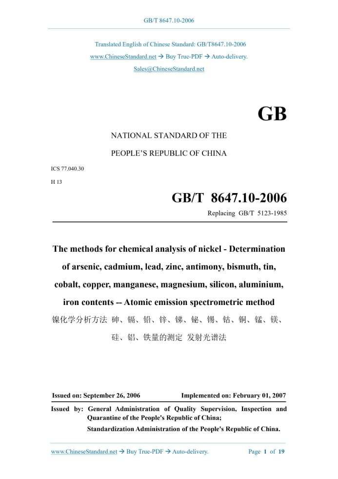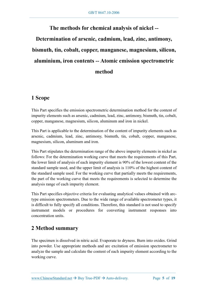 GB/T 8647.10-2006: The methods for chemical analysis of nickel -- Determination of arsenic cadmium lead zinc antimony bismuth tin cobalt copper manganese magnesium silicon aluminium iron contents -- Atomic emission spectrometric method Delivery: 9 seconds. True-PDF full-copy in English & invoice will be downloaded + auto-delivered via email. See step-by-step procedure Status: Valid GB/T 8647.10: Historical versions