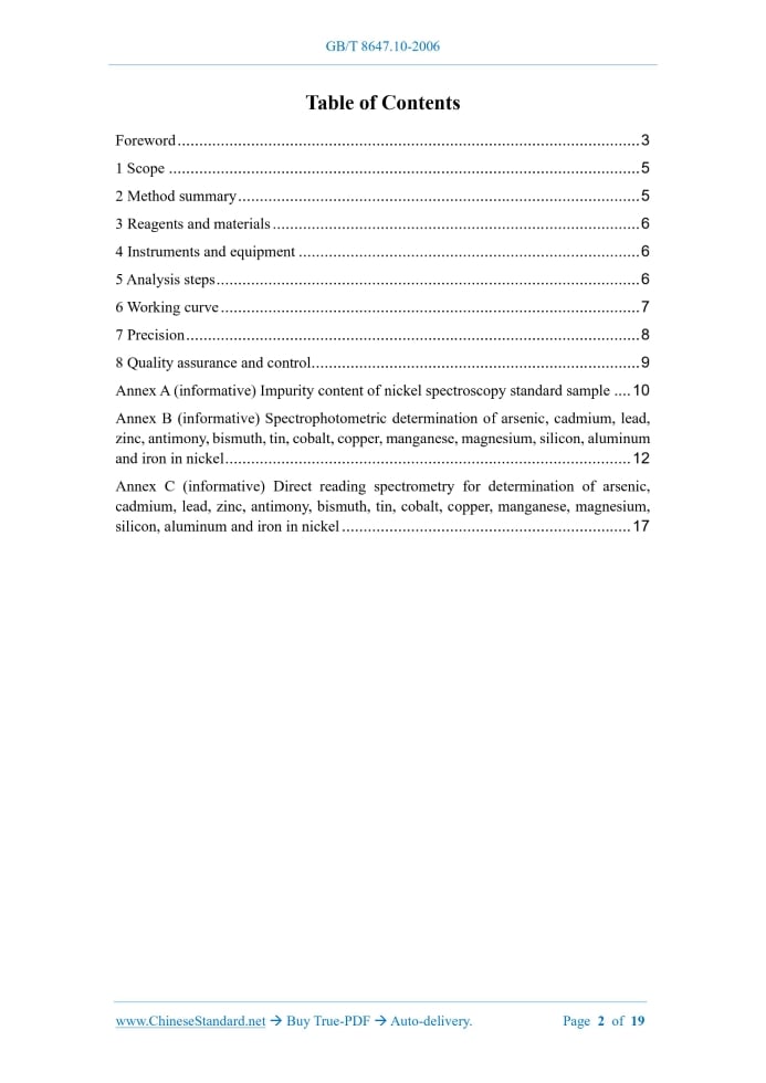 Similar standardsGB/T 8647.10-2006: The methods for chemical analysis of nickel -- Determination of arsenic cadmium lead zinc antimony bismuth tin cobalt copper manganese magnesium silicon aluminium iron contents -- Atomic emission spectrometric method---This is an excerpt. Full copy of true-PDF in English version (including equations, symbols, images, flow-chart, tables, and figures etc.), auto-downloaded/delivered in 9 seconds, can be purchased online: https://www.ChineseStandard.net/PDF.aspx/GBT8647.10-2006 GB NATIONAL STANDARD OF THE PEOPLE’S REPUBLIC OF CHINA ICS 77.040.30 H 13 Replacing GB/T 5123-1985 The methods for chemical analysis of nickel - Determination of arsenic, cadmium, lead, zinc, antimony, bismuth, tin, cobalt, copper, manganese, magnesium, silicon, aluminium, iron contents -- Atomic emission spectrometric method ISSUED ON: SEPTEMBER 26, 2006 IMPLEMENTED ON: FEBRUARY 01, 2007 Issued by: General Administration of Quality Supervision, Inspection and Quarantine of the People's Republic of China; Standardization Administration of the People's Republic of China. Table of ContentsForeword ... 3 1 Scope ... 5 2 Method summary ... 5 3 Reagents and materials ... 6 4 Instruments and equipment ... 6 5 Analysis steps ... 6 6 Working curve ... 7 7 Precision ... 8 8 Quality assurance and control ... 9 Annex A (informative) Impurity content of nickel spectroscopy standard sample ... 10 Annex B (informative) Spectrophotometric determination of arsenic, cadmium, lead, zinc, antimony, bismuth, tin, cobalt, copper, manganese, magnesium, silicon, aluminum and iron in nickel ... 12 Annex C (informative) Direct reading spectrometry for determination of arsenic, cadmium, lead, zinc, antimony, bismuth, tin, cobalt, copper, manganese, magnesium, silicon, aluminum and iron in nickel ... 17 The methods for chemical analysis of nickel -- Determination of arsenic, cadmium, lead, zinc, antimony, bismuth, tin, cobalt, copper, manganese, magnesium, silicon, aluminium, iron contents -- Atomic emission spectrometric method1 ScopeThis Part specifies the emission spectrometric determination method for the content of impurity elements such as arsenic, cadmium, lead, zinc, antimony, bismuth, tin, cobalt, copper, manganese, magnesium, silicon, aluminum and iron in nickel. This Part is applicable to the determination of the content of impurity elements such as arsenic, cadmium, lead, zinc, antimony, bismuth, tin, cobalt, copper, manganese, magnesium, silicon, aluminum and iron. This Part stipulates the determination range of the above impurity elements in nickel as follows: For the determination working curve that meets the requirements of this Part, the lower limit of analysis of each impurity element is 90% of the lowest content of the standard sample used, and the upper limit of analysis is 110% of the highest content of the standard sample used. For the working curve that partially meets the requirements, the part of the working curve that meets the requirements is selected to determine the analysis range of each impurity element. This Part specifies objective criteria for evaluating analytical values obtained with arc- type emission spectrometers. Due to the wide range of available spectrometer types, it is difficult to fully specify all conditions. Therefore, this standard is not used to specify instrument models or procedures for converting instrument responses into concentration units.2 Method summaryThe specimen is dissolved in nitric acid. Evaporate to dryness. Burn into oxides. Grind into powder. Use appropriate methods and arc excitation of emission spectrometer to analyze the sample and calculate the content of each impurity element according to the working curve.3 Reagents and materialsThe water used in this method is grade two water or laboratory water of equivalent purity. 3.1 Nickel spectral standard samples: must be standard samples approved by the legal institution or standard samples approved by both parties (metallic standard samples shall be pre-processed into oxides according to 5.2.1). Please refer to Annex A for some nickel spectral standard samples. 3.2 Graphite electrode (spectrally pure). 3.3 Nitric acid (p1.42 g/mL), guaranteed reagent. 3.4 Nitric acid (3+2). 3.5 Nitric acid (1+9).4 Instruments and equipment4.1 Emission spectrometers (arc type) may be used as long as they are available and meet the accuracy requirements of this standard. They may be spectrographs with associated equipment or direct reading spectrometers with any detector. 4.2 Box type resistance furnace. 4.3 Agate mortar.5 Analysis steps5.1 Test material Weigh two specimens in parallel. Each specimen is about 5%. 5.2 Determination 5.2.1 Place two test materials in appropriate beakers. Wash with 30 mL nitric acid (3.5). Pour off the washing solution and rinse with water three times. Add 50 mL of nitric acid (3.4). Cover with a watch glass. After the violent reaction stops, heat and evaporate until it is almost viscous. Transfer to a 50 mL porcelain crucible and evaporate to dryness. Place the porcelain crucible in a box-type resistance furnace. Burn at 750°C~800°C for 20 min. Take out. Cool to room temperature. Grind the generated oxide in an agate mortar (4.3). 5.2.2 Perform sample analysis according to the laboratory selected conditions. EachAnnex B(informative) Spectrophotometric determination of arsenic, cadmium, lead, zinc, antimony, bismuth, tin, cobalt, copper, manganese, magnesium, silicon, aluminum and iron in nickel B.1 Method summary The specimen is dissolved in nitric acid. Evaporate to dryness. Burn into oxide. Grind into powder. Press into pellets. Use the three-standard specimen method, DC arc excitation, and photosensitive plate to record the spectrum. Use a microphotometer to measure the conversion blackness difference between the selected analytical line and the internal standard line. Then find the content of the corresponding element on the analytical curve of the conversion blackness diffe