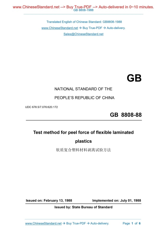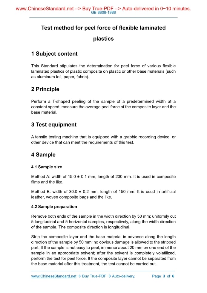 GB/T 8808-1988: Test method for peel force of flexible laminated plastics Delivery: 9 seconds. True-PDF full-copy in English & invoice will be downloaded + auto-delivered via email. See step-by-step procedure