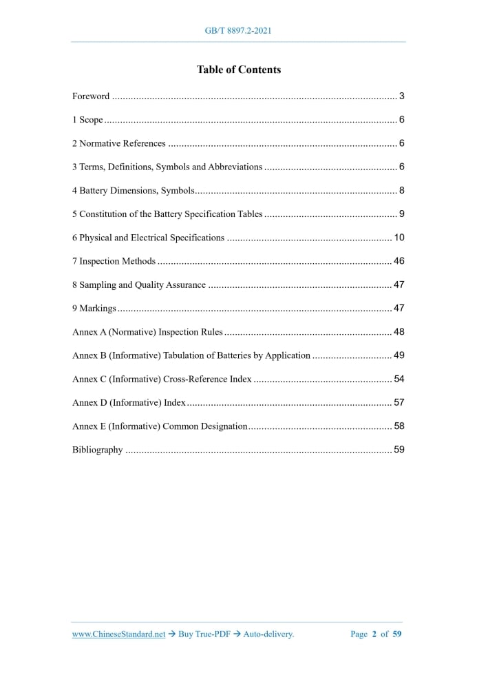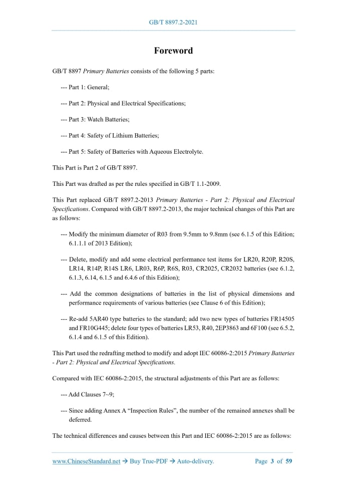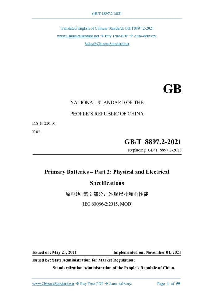 Similar standardsGB/T 8897.2-2021: Primary batteries - Part 2: Physical and electrical specifications---This is an excerpt. Full copy of true-PDF in English version (including equations, symbols, images, flow-chart, tables, and figures etc.), auto-downloaded/delivered in 9 seconds, can be purchased online: https://www.ChineseStandard.net/PDF.aspx/GBT8897.2-2021NATIONAL STANDARD OF THE PEOPLE’S REPUBLIC OF CHINA ICS 29.220.10 K 82 Replacing GB/T 8897.2-2013 Primary Batteries – Part 2.Physical and Electrical Specifications (IEC 60086-2.2015, MOD) Issued on. MAY 21, 2021 Implemented on. NOVEMBER 01, 2021 Issued by. State Administration for Market Regulation; Standardization Administration of the People’s Republic of China. Table of ContentsForeword... 3 1 Scope... 6 2 Normative References... 6 3 Terms, Definitions, Symbols and Abbreviations... 6 4 Battery Dimensions, Symbols... 8 5 Constitution of the Battery Specification Tables... 9 6 Physical and Electrical Specifications... 10 7 Inspection Methods... 46 8 Sampling and Quality Assurance... 47 9 Markings... 47 Annex A (Normative) Inspection Rules... 48 Annex B (Informative) Tabulation of Batteries by Application... 49 Annex C (Informative) Cross-Reference Index... 54 Annex D (Informative) Index... 57 Annex E (Informative) Common Designation... 58 Bibliography... 59ForewordGB/T 8897 Primary Batteries consists of the following 5 parts. --- Part 1.General; --- Part 2.Physical and Electrical Specifications; --- Part 3.Watch Batteries; --- Part 4.Safety of Lithium Batteries; --- Part 5.Safety of Batteries with Aqueous Electrolyte. This Part is Part 2 of GB/T 8897. This Part was drafted as per the rules specified in GB/T 1.1-2009. This Part replaced GB/T 8897.2-2013 Primary Batteries - Part 2.Physical and Electrical Specifications. Compared with GB/T 8897.2-2013, the major technical changes of this Part are as follows. --- Modify the minimum diameter of R03 from 9.5mm to 9.8mm (see 6.1.5 of this Edition; 6.1.1.1 of 2013 Edition); --- Delete, modify and add some electrical performance test items for LR20, R20P, R20S, LR14, R14P, R14S LR6, LR03, R6P, R6S, R03, CR2025, CR2032 batteries (see 6.1.2, 6.1.3, 6.14, 6.1.5 and 6.4.6 of this Edition); --- Add the common designations of batteries in the list of physical dimensions and performance requirements of various batteries (see Clause 6 of this Edition); --- Re-add 5AR40 type batteries to the standard; add two new types of batteries FR14505 and FR10G445; delete four types of batteries LR53, R40, 2EP3863 and 6F100 (see 6.5.2, 6.1.4 and 6.1.5 of this Edition). This Part used the redrafting method to modify and adopt IEC 60086-2.2015 Primary Batteries - Part 2.Physical and Electrical Specifications. Compared with IEC 60086-2.2015, the structural adjustments of this Part are as follows. --- Add Clauses 7~9; --- Since adding Annex A “Inspection Rules”, the number of the remained annexes shall be deferred. The technical differences and causes between this Part and IEC 60086-2.2015 are as follows. --- Regarding normative references, this Part has made adjustments with technical differences to adapt to the technical conditions of China. The adjustments are concentrated in Clause 2 "Normative References". The specific adjustments are as follows. Use GB/T 1182 that modifies and adopts the international standard to replace ISO 1101; Use GB/T 8897.1-2021 that modifies and adopts the international standard to replace IEC 60086-1.2015. --- Delete the term "closed-circuit voltage". --- Modify the partial discharge index of R20S, LR03, R1 and 6F22 (see 6.1.2, 6.1.5, 6.1.6 and 6.6.8 of this Edition). --- Modify the minimum diameter of R6P and R6S (see 6.1.4 of this Edition). --- Increase inspection methods (see Clause 7 of this Edition), sampling and quality assurance (see Clause 8 of this Edition) and markings (see Clause 9 of this Edition). --- Add the normative annex "Inspection Rules" (see Annex A). This Part was proposed by China National Light Industry Council. This Part shall be under the jurisdiction of National Technical Committee on Primary Battery of Standardization Administration of China (SAC/TC 176). Drafting organizations of this Part. Fujian Nanping Nanfu Battery Co., Ltd.; Zhejiang Mustang Battery Co., Ltd.; Guangzhou Tiger Head Battery Group Co., Ltd.; Zhongyin (Ningbo) Battery Co., Ltd.; Institute of Chemical Power Sources for Light Industry; Hangzhou Eternal Battery Co., Ltd.; Sichuan Changhong New Energy Technology Co., Ltd.; Guangdong Liwang New Energy Co., Ltd.; Zhengzhou University of Light Industry; Suzhou Product Quality Supervision and Inspection Institute; Xiamen 3-Circles Battery Co., Ltd.; Chung Pak (Guang Dong) Battery Industrial Co., Ltd.; Zhejiang Yonggao Battery Co., Ltd.; Chengdu Jianzhong Lithium Battery Co., Ltd.; Zhejiang Hengwei Battery Co., Ltd.; Jiaxing Minimoon Battery Co, Ltd.; Shandong Huatai New Energy Battery Co., Ltd.; Zhejiang Yunbang Battery Co., Ltd.; Jiaxing Reach Top Battery Power Technology Co., Ltd.; Jiaxing Kaili Battery Co., Ltd.; Yichang Power Glory Technology Co., Ltd.; Wuhan Fanso Technology Co., Ltd.; and Shenzhen National Engineering Research Center of Advanced Energy Storage Materials Co., Ltd. Chief drafting staffs of this Part. Xiao Qicong, Chen Shuibiao, Liu Xu, Chen Guobiao, Wang Haibo, Guo Long, Wang Lizhen, Xu Zengfu, Wu Zhen, Wang Hongqi, Lu Yanfang, Ye Manhui, Wang Li, Cheng Hong, Ding Cheng, Wu Minji, Zhuang Biao, Wang Jiajun, Fu Jiqing, Wang Jian, Wen Qingan, Yang Hui, Liu Hongbing, and Ma Kouxiang. The historical editions replaced by this Part are as follows. --- GB/T 7112-1986, GB/T 7112-1994, GB/T 7112-1998; --- GB/T 8897.2-2005, GB/T 8897.2-2008, GB/T 8897.2-2013. Primary Batteries – Part 2.Physical and Electrical Specifications1 ScopeThis Part of GB/T 8897 specifies the battery size symbols, the description of the composition of the battery technical requirements classification table, the physical dimensions and electrical perfo