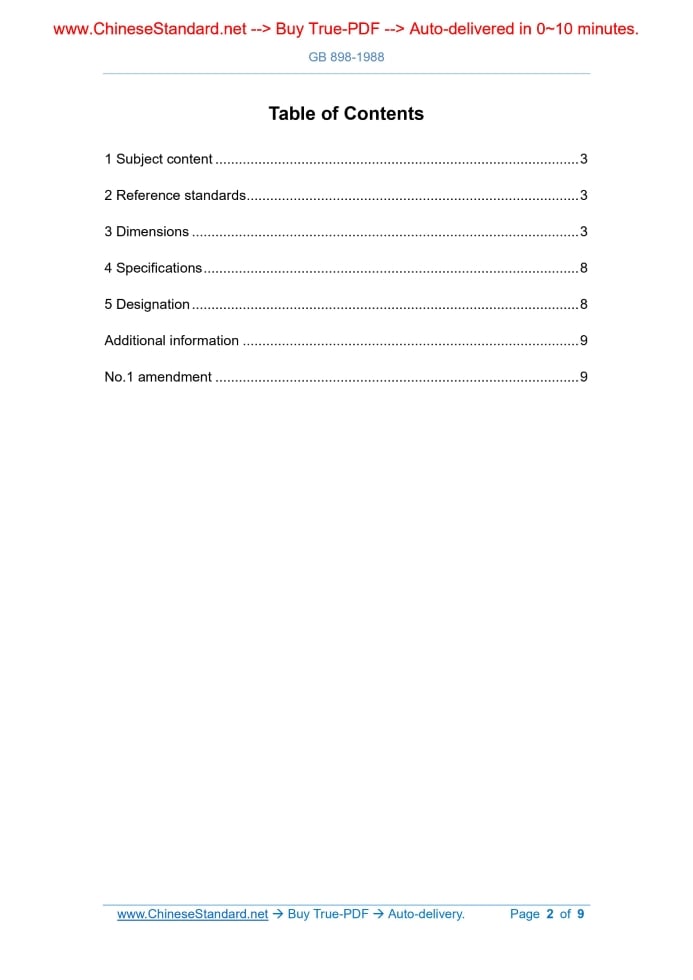 Similar standardsGB/T 898-1988: Double end studs. bm=1.25d---This is an excerpt. Full copy of true-PDF in English version (including equations, symbols, images, flow-chart, tables, and figures etc.), auto-downloaded/delivered in 9 seconds, can be purchased online: https://www.ChineseStandard.net/PDF.aspx/GBT898-1988GB NATIONAL STANDARD OF THE PEOPLE’S REPUBLIC OF CHINA UDC 621.882 GB 898-88 Replacing GB 898-76 Double end studs - bm=1.25d Issued on. JANUARY 26, 1988 Implemented on. JANUARY 01, 1989 Issued by. Ministry of Industry and Information Technology of the PRC Table of Contents1 Subject content... 3 2 Reference standards... 3 3 Dimensions... 3 4 Specifications... 8 5 Designation... 8 Additional information... 9 No.1 amendment... 9 Double end studs - bm=1.25d1 Subject contentThis Standard specifies double end studs with thread diameters of M5~M48 and bm=1.25d. Note. Commodity fastener varieties shall be preferred.2 Reference standardsGB 2 Fasteners - Ends of parts with external thread GB 196 General Purpose Metric Screw Threads - Basic Dimensions GB 197 General purpose metric screw threads - Tolerances GB 1167 The threads for transition fit GB 3098.1 Mechanical properties of fasteners - Bolts, screws and studs GB 3098.6 Mechanical properties of fasteners - Stainless steel bolts, screws, studs and nuts GB 3103.1 Tolerances for fasteners - Bolts, screws and nuts GB 5267 Fasteners - Electroplated Coatings GB 5779.1 Fasteners - Surface discontinuities - Bolts, screws and studs for general requirements GB 5779.3 Fasteners - Surface discontinuities - Bolts, screws and studs for special requirements GB 90 Acceptance inspection, marking and packaging of fasteners GB 1237 Designation system for fasteners3 DimensionsThe dimensions are shown in the figure below and Table 1, Table 2, and Table 3. 3.1 Commodity sizes shall be in accordance with the figure and Table 1. 3.2 General sizes shall be in accordance with the figure and Table 2.4 SpecificationsSpecifications are shown in Table 4.5 Designation5.1 The designation system shall be in accordance with GB/T 1237. ......Source: Above contents are excerpted from the full-copy PDF -- translated/reviewed by: www.ChineseStandard.net / Wayne Zheng et al. Tips & Frequently Asked Questions:Question 1: How long will the true-PDF of English version of GB/T 898-1988 be delivered?Answer: The full copy PDF of English version of GB/T 898-1988 can be downloaded in 9 seconds, and it will also be emailed to you in 9 seconds (double mechanisms to ensure the delivery reliably), with PDF-invoice.Question 2: Can I share the purchased PDF of GB/T 898-1988_English with my colleagues?Answer: Yes. The purchased PDF of GB/T 898-1988_English will be deemed to be sold to your employer/organization who actually paid for it, including your colleagues and your employer's intranet.Question 3: Does the price include tax/VAT?Answer: Yes. Our tax invoice, downloaded/delivered in 9 seconds, includes all tax/VAT and complies with 100+ countries' tax regulations (tax exempted in 100+ countries) -- See Avoidance of Double Taxation Agreements (DTAs): List of DTAs signed between Singapore and 100+ countriesQuestion 4: Do you accept my currency other than USD?Answer: Yes. www.ChineseStandard.us -- GB/T 898-1988 -- Click this link and select your country/currency to pay, the exact amount in your currency will be printed on the invoice. Full PDF will also be downloaded/emailed in 9 seconds.How to buy and download a true PDF of English version of GB/T 898-1988?A step-by-step guide to download PDF of GB/T 898-1988_EnglishStep 1: Visit website https://www.ChineseStandard.net (Pay in USD), or https://www.ChineseStandard.us (Pay in any currencies such as Euro, KRW, JPY, AUD).Step 2: Search keyword "GB/T 898-1988". Step 3: Click "Add to Cart". If multiple PDFs are required, repeat steps 2 and 3 to add up to 12 PDFs to cart. Step 4: Select payment option (Via payment agents Stripe or PayPal). Step 5: Customize Tax Invoice -- Fill up your email etc. Step 6: Click "Checkout". Step 7: Make payment by credit card, PayPal, Google Pay etc. After the payment is completed and in 9 seconds, you will receive 2 emails attached with the purchased PDFs and PDF-invoice, respectively. Step 8: Optional -- Go to download PDF. Step 9: Optional -- Click Open/Download PDF to download PDFs and invoice. See screenshots for above steps: Steps 1~3 Steps 4~6 Step 7 Step 8 Step 9 |