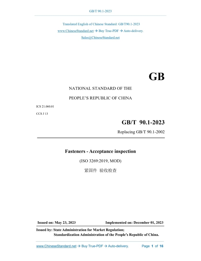 GB/T 90.1-2023: Fasteners - Acceptance inspection Delivery: 9 seconds. True-PDF full-copy in English & invoice will be downloaded + auto-delivered via email. See step-by-step procedure Status: Valid GB/T 90.1: Historical versions