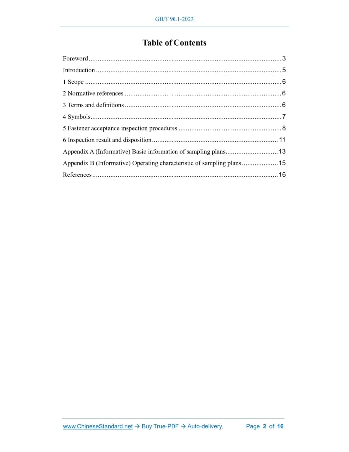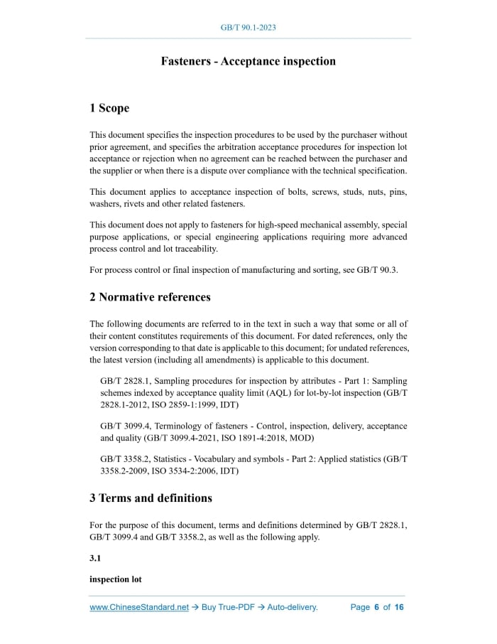 GB/T 90.1-2023: Fasteners - Acceptance inspection---This is an excerpt. Full copy of true-PDF in English version (including equations, symbols, images, flow-chart, tables, and figures etc.), auto-downloaded/delivered in 9 seconds, can be purchased online: https://www.ChineseStandard.net/PDF.aspx/GBT90.1-2023GB NATIONAL STANDARD OF THE PEOPLE’S REPUBLIC OF CHINA ICS 21.060.01 CCS J 13 Replacing GB/T 90.1-2002 Fasteners - Acceptance inspection (ISO 3269:2019, MOD) ISSUED ON: MAY 23, 2023 IMPLEMENTED ON: DECEMBER 01, 2023 Issued by: State Administration for Market Regulation; Standardization Administration of the People’s Republic of China. Table of ContentsForeword ... 3 Introduction ... 5 1 Scope ... 6 2 Normative references ... 6 3 Terms and definitions ... 6 4 Symbols ... 7 5 Fastener acceptance inspection procedures ... 8 6 Inspection result and disposition ... 11 Appendix A (Informative) Basic information of sampling plans ... 13 Appendix B (Informative) Operating characteristic of sampling plans ... 15 References ... 16 Fasteners - Acceptance inspection1 ScopeThis document specifies the inspection procedures to be used by the purchaser without prior agreement, and specifies the arbitration acceptance procedures for inspection lot acceptance or rejection when no agreement can be reached between the purchaser and the supplier or when there is a dispute over compliance with the technical specification. This document applies to acceptance inspection of bolts, screws, studs, nuts, pins, washers, rivets and other related fasteners. This document does not apply to fasteners for high-speed mechanical assembly, special purpose applications, or special engineering applications requiring more advanced process control and lot traceability. For process control or final inspection of manufacturing and sorting, see GB/T 90.3.2 Normative referencesThe following documents are referred to in the text in such a way that some or all of their content constitutes requirements of this document. For dated references, only the version corresponding to that date is applicable to this document; for undated references, the latest version (including all amendments) is applicable to this document. GB/T 2828.1, Sampling procedures for inspection by attributes - Part 1: Sampling schemes indexed by acceptance quality limit (AQL) for lot-by-lot inspection (GB/T 2828.1-2012, ISO 2859-1:1999, IDT) GB/T 3099.4, Terminology of fasteners - Control, inspection, delivery, acceptance and quality (GB/T 3099.4-2021, ISO 1891-4:2018, MOD) GB/T 3358.2, Statistics - Vocabulary and symbols - Part 2: Applied statistics (GB/T 3358.2-2009, ISO 3534-2:2006, IDT)3 Terms and definitionsFor the purpose of this document, terms and definitions determined by GB/T 2828.1, GB/T 3099.4 and GB/T 3358.2, as well as the following apply. 3.1 inspection lot Re Rejection number LQ10 Limiting quality at 10% probability of acceptance, % AQL95 Acceptance quality limit at 95% probability of acceptance, % N Lot size Pa Probability of acceptance, %5 Fastener acceptance inspection procedures5.1 General requirements The requirements of this document apply to the fasteners in the delivery state of the supplier, that is, the delivery state of the fasteners has not been changed. If the purchaser changes the delivery state of the fastener or reprocesses it, the purchaser shall bear the responsibility for changes in the consistency of characteristics caused by such processing. The acceptance inspections specified in this document apply after receiving the fasteners and before releasing the lot to any subsequent processing. Inspections carried out in accordance with this document shall be as specified in Tables 1 and 2. Any non-conforming, once found during the inspection, shall be dealt with according to the requirements of 6.2 and/or 6.3. Before any disposition, the purchaser shall give the supplier the opportunity to verify any unverified nonconformity. 5.2 Inspection procedures 5.2.1 General The purchaser may choose this document to verify whether the fastener meets the technical requirements of the product standard or other specified requirements. 5.2.2 Sample size The sample size shall be based on the number of inspection lots specified in Table 1. If the sample size is larger than the number of inspection lots, non-destructive testing requires 100% inspection. The sample size n, the acceptance number Ac and the rejection number Re shall be determined separately for each selected characteristic.Appendix A(Informative) Basic information of sampling plans Acceptance inspection is generally carried out by the purchaser to confirm whether the production of the delivered fasteners meets the technical specifications. Table 1 provides the acceptance inspection sampling plans for the three categories of characteristics based on different statistical methods. Different statistical methods have different risk results for the purchaser and the supplier. The party conducting the acceptance inspection is responsible for selecting the sampling plan and appropriate tests. Category 1 characteristics are mechanical properties that are critical to the function of the fastener. It is assumed that a deviation in process parameters during lot production will result in a substantial proportion of non-conformity of the lot and is expected to be detected in a small sample. Based on the above assumptions, the acceptance inspection sampling plans for Category 1 characteristics require acceptance number Ac=0, and do not provide statistical information. When non-conformity is found, verification is required to reach agreement on the disposition of the lot (see Chapter 6). Category 2 characteristics are dimensional characteristics that affect the usability of the fastener. It is assumed that the properties due to normal variation of the production process satisfy a statistical distribution. The sampling plans for Category 2 characteristics are based on the acceptance number Ac=0; h