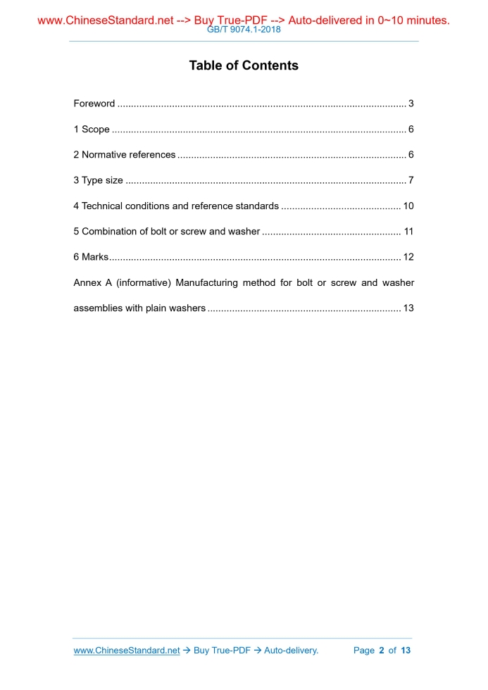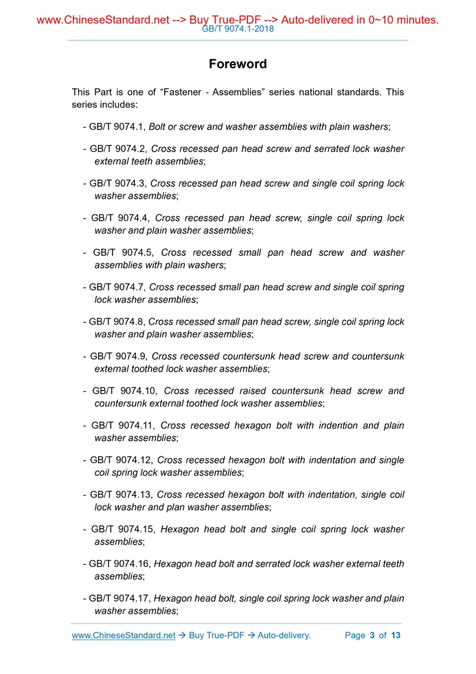 Similar standardsGB/T 9074.1-2018: Bolt or screw and washer assemblies with plain washers---This is an excerpt. Full copy of true-PDF in English version (including equations, symbols, images, flow-chart, tables, and figures etc.), auto-downloaded/delivered in 9 seconds, can be purchased online: https://www.ChineseStandard.net/PDF.aspx/GBT9074.1-2018Bolt or screw and washer assemblies with plain washers ICS 21.060.10 J13 National Standards of People's Republic of China Replace GB/T 9074.1-2002 Bolt or screw and flat washer assembly (ISO 10644.2009, Screwandwasherassembliesmadeofsteelwithplain washers-Washerhardnessclasses200HVand300HV, MOD) Published on.2018-12-28 2019-07-01 implementation State market supervision and administration China National Standardization Administration issued ForewordThis part is one of the national standards for the “fastener assembly” series. The series includes. ---GB/T 9074.1 bolt or screw and flat washer assembly; ---GB/T 9074.2 cross recessed pan head screw and outer serrated lock washer assembly; ---GB/T 9074.3 cross recessed pan head screw and spring washer assembly; ---GB/T 9074.4 cross recessed pan head screw, spring washer and flat washer assembly; ---GB/T 9074.5 cross recessed small pan head screw and flat washer assembly; ---GB/T 9074.7 cross recessed small pan head screw and spring washer assembly; ---GB/T 9074.8 cross recessed small pan head screw, spring washer and flat washer assembly; ---GB/T 9074.9 cross recessed countersunk head screw and tapered lock washer assembly; ---GB/T 9074.10 cross recessed countersunk head screw and tapered lock washer assembly; ---GB/T 9074.11 Cross recessed hex head bolt and flat washer assembly; ---GB/T 9074.12 cross recessed hex head bolt and spring washer assembly; ---GB/T 9074.13 Cross recessed hex head bolts, spring washers and flat washer assemblies; ---GB/T 9074.15 Hex head bolt and spring washer assembly; ---GB/T 9074.16 Hex head bolt and outer serrated lock washer assembly; ---GB/T 9074.17 Hex head bolts, spring washers and flat washer assemblies; ---GB/T 9074.18 self-tapping screws and flat washer assemblies; ---GB/T 9074.20 cross recessed hex head self-tapping screws and flat washer assembly; ---GB/T 9074.26 assembly spring washer; ---GB/T 9074.27 External sawtooth lock washer for assembly; ---GB/T 9074.28 Conical locking washer for assembly; ---GB/T 9074.31 Conical elastic washers for assemblies; ---GB/T 9074.32 Bolt or screw and tapered elastic washer assembly. This part is the first part of GB/T 9074. This part is drafted in accordance with the rules given in GB/T 1.1-2009. This part replaces GB/T 9074.1-2002 "Bolt or Screw and Flat Washer Assembly". This part is related to GB/T 9074.1-2002 The main technical changes are as follows. --- When the bolt or screw is ≤ 8.8, the hardness level of the washer is changed to.200HV or 300HV (see Table 3, Chapter 4 of the.2002 edition); --- Increase the technical requirements for non-electrolytic zinc sheet coating and phosphating (see Table 3); --- Add "If other technical requirements or surface treatment are required, the supply and demand agreement should be provided" (see Table 3); --- Increase the standardized combination of bolts or screws and washers (see Table 4); --- Mark the content to increase the hardness level of the gasket (see Chapter 6); --- Added informative Appendix A "Methods for producing bolts or screws and flat washer assemblies" (see Appendix A). This section uses the redrafting method to modify the ISO 10644.2009 "screw and washer assembly washer hardness class.200HV And 300HV. The technical differences between this part and ISO 10644.2009 and their reasons are as follows. --- In the normative reference documents, replace the international standards with Chinese standards (see Chapter 2), increase the reference to GB/T 90.1 (see Table 2), GB/T 90.2 (see Table 2) and GB/T 1237 (see 5.1) to comply with China's fastener basic standards; --- Increase packaging technical requirements (Table 2) to meet the basic standards of fasteners in China. This section also made the following editorial changes. --- Modified the standard name. This part was proposed by the China Machinery Industry Federation. This part is under the jurisdiction of the National Fastener Standardization Technical Committee (SAC/TC85). This section is responsible for drafting the unit. China Machine Productivity Promotion Center. Participated in the drafting of this section. 7412 Factory in Zhoushan City, Zhejiang Haili Co., Ltd., Shanghai Shenguang High Strength Bolt Co., Ltd. Jinyi Industrial Co., Ltd., Qifeng Precision Technology Co., Ltd., Hunan Feiwo New Energy Technology Co., Ltd., Zhejiang Jingyi Standard Zhunquan Co., Ltd., Yuhuan Wanquan Machinery Manufacturing Co., Ltd., Zhejiang Gree Machinery Co., Ltd. Product Quality Supervision and Inspection Center. This part is explained by the National Fastener Standardization Technical Committee. The previous versions of the standards replaced by this section are. ---GB/T 9074.1-1988, GB/T 9074.1-2002; ---GB/T 9074.14-1988. Bolt or screw and flat washer assembly1 ScopeThis part of GB/T 9074 specifies the type dimensions, technical conditions and markings for bolts or screws and flat washer assemblies. This section applies to thread sizes M2~M12, flat bearing surfaces, bolts or screws with performance grades of 8.8, 9.8 and 10.9, flat washers Bolts or screws and flat washer assemblies with a ring hardness rating of.200 HV or 300 HV.2 Normative referencesThe following documents are indispensable for the application of this document. For dated references, only dated versions apply to this article. Pieces. For undated references, the latest edition (including all amendments) applies to this document. GB/T 65 slotted cylindrical head screw (GB/T 65-2016, ISO 1207.2011, MOD) GB/T 67 slotted pan head screw (GB/T 67-2016, ISO 1580.2011, MOD) GB/T 70.1 hexagon socket head cap screws (GB/T 70.1-2008, ISO 4762.2004, MOD) GB/T 90.1 f