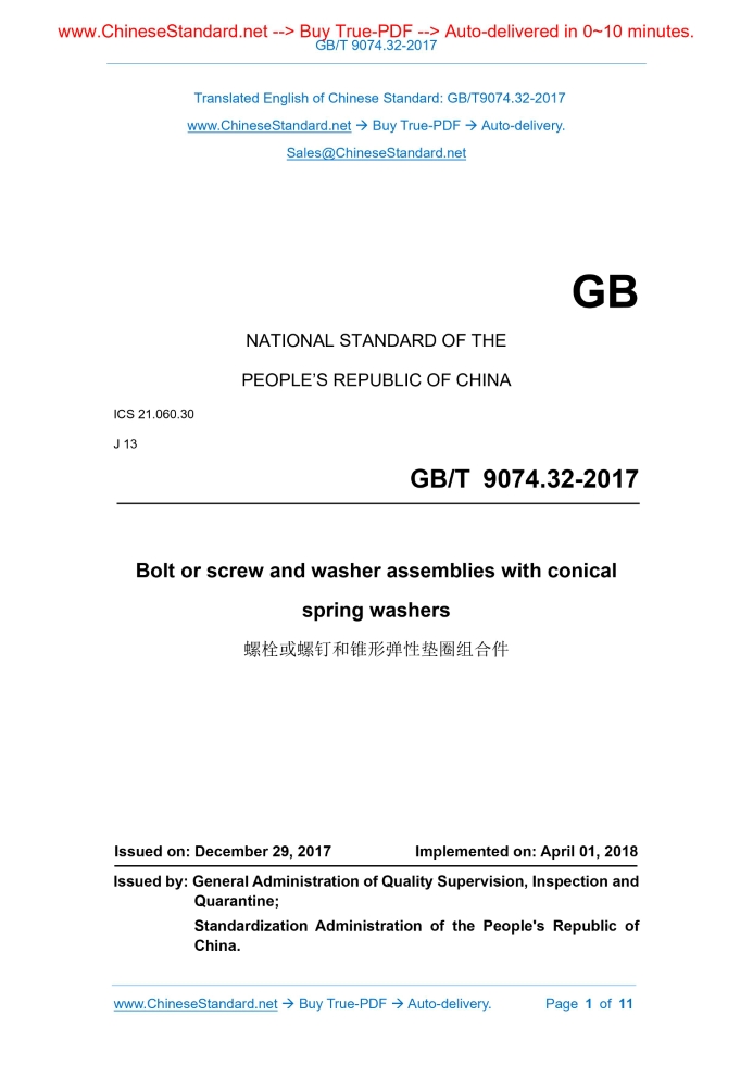 GB/T 9074.32-2017: Bolt or screw and washer assemblies with conical spring washers Delivery: 9 seconds. True-PDF full-copy in English & invoice will be downloaded + auto-delivered via email. See step-by-step procedure Status: Valid