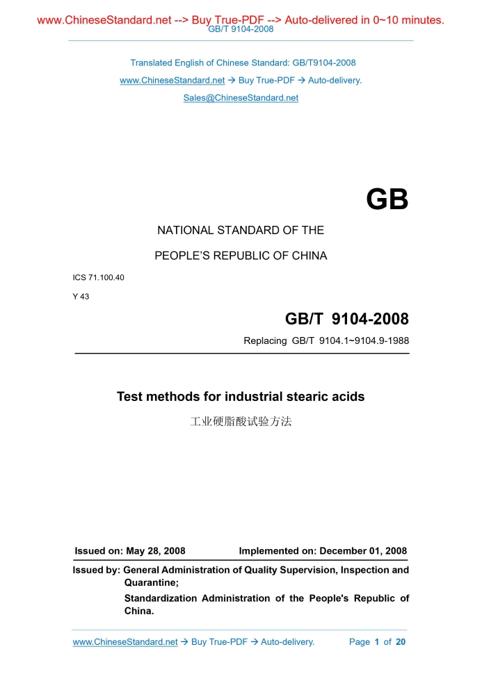 GB/T 9104-2008: Test methods for industrial stearic acids Delivery: 9 seconds. True-PDF full-copy in English & invoice will be downloaded + auto-delivered via email. See step-by-step procedure Status: Obsolete GB/T 9104: Historical versions