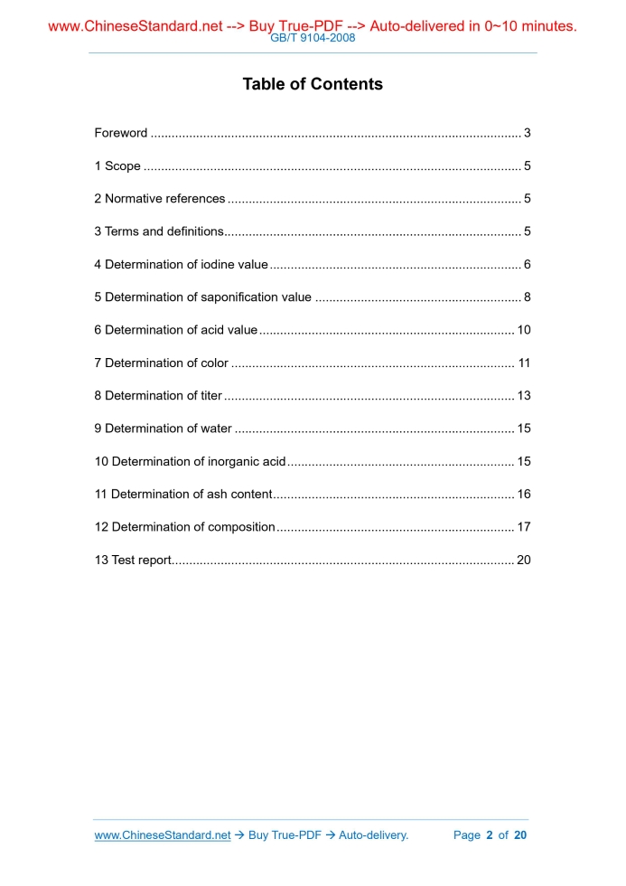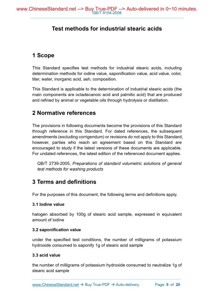 Similar standardsGB/T 9104-2008: Test methods for industrial stearic acids---This is an excerpt. Full copy of true-PDF in English version (including equations, symbols, images, flow-chart, tables, and figures etc.), auto-downloaded/delivered in 9 seconds, can be purchased online: https://www.ChineseStandard.net/PDF.aspx/GBT9104-2008NATIONAL STANDARD OF THE PEOPLE’S REPUBLIC OF CHINA ICS 71.100.40 Y 43 Replacing GB/T 9104.1~9104.9-1988 Test methods for industrial stearic acids Issued on: MAY 28, 2008 Implemented on: DECEMBER 01, 2008 Issued by. General Administration of Quality Supervision, Inspection and Quarantine; Standardization Administration of the People's Republic of China. Table of ContentsForeword... 3 1 Scope... 5 2 Normative references... 5 3 Terms and definitions... 5 4 Determination of iodine value... 6 5 Determination of saponification value... 8 6 Determination of acid value... 10 7 Determination of color... 11 8 Determination of titer... 13 9 Determination of water... 15 10 Determination of inorganic acid... 15 11 Determination of ash content... 16 12 Determination of composition... 17 13 Test report... 20 Test methods for industrial stearic acids1 ScopeThis Standard specifies test methods for industrial stearic acids, including determination methods for iodine value, saponification value, acid value, color, titer, water, inorganic acid, ash, composition. This Standard is applicable to the determination of industrial stearic acids (the main components are octadecanoic acid and palmitic acid) that are produced and refined by animal or vegetable oils through hydrolysis or distillation.2 Normative referencesThe provisions in following documents become the provisions of this Standard through reference in this Standard. For dated references, the subsequent amendments (excluding corrigendum) or revisions do not apply to this Standard, however, parties who reach an agreement based on this Standard are encouraged to study if the latest versions of these documents are applicable. For undated references, the latest edition of the referenced document applies. QB/T 2739-2005, Preparations of standard volumetric solutions of general test methods for washing products3 Terms and definitionsFor the purposes of this document, the following terms and definitions apply. 3.1 Iodine value halogen absorbed by 100g of stearic acid sample, expressed in equivalent amount of iodine 3.2 saponification value under the specified test conditions, the number of milligrams of potassium hydroxide consumed to saponify 1g of stearic acid sample 3.3 acid value the number of milligrams of potassium hydroxide consumed to neutralize 1g of stearic acid sample 4.2.8 Starch indicator solution (10g/L). is prepared according to 5.3 in QB/T 2739-2005. 4.2.9 Sodium thiosulfate (GB/T 601), c(Na2S2O3) = 0.1mol/L standard titration solution, is prepared and calibrated according to 4.12 in QB/T 2739-2005. 4.2.10 Iodine chloride solution (Wijs solution). dissolve 13g of iodine (4.2.6) in 1000mL of acetic acid (4.2.1) (slightly heat while dissolving). Then place in a 1000mL brown bottle. After cooling, pour 100mL~200mL into another brown bottle. Place in a dark place for adjustment use. Make chlorine (4.2.7) access to the remaining 800mL~900mL of iodine solution until the solution gradually fades from a dark color till it appears orange and transparent. After the access amount of chlorine is corrected according to the correction method, use the preserved iodine solution to adjust. Correction method. Respectively take 25.0mL of iodine solution and the freshly- prepared Wijs solution. Respectively add 20mL of potassium iodide solution (4.2.2). Then respectively add 100mL of distilled water. Use 0.1mol/L sodium thiosulfate standard titration solution (4.2.9) to titrate the solution. When it appears light yellow, add 1mL of starch indicator (4.2.8) to continue titrating until blue disappears. The volume of sodium thiosulfate standard titration solution consumed by freshly-prepared Wijs solution shall be close to twice iodine solution’s volume. 4.3 Apparatus Common laboratory apparatus and 4.3.1 Iodometric flask. 250mL. 4.3.2 Plugged burette. 25mL, brown. 4.3.3 Volumetric flask. 1000mL, brown. 4.3.4 Pipette. 10mL, 25mL. 4.4 Test procedures Weigh 2g~3g of dry sample (to the nearest of 0.001g; according to the level of iodine price, the weighing can be increased or decreased) in the iodometric flask (4.3.1). Add 20mL of cyclohexane-acetic acid solution (4.2.4). After the sample is dissolved, use pipette (4.3.4) to add 25.0mL of Wijs solution (4.2.10). Completely shake well and place at a dark place around 25°C to store for 30min. Then take the iodometric flask out from the dark place. Add 20mLof potassium iodide solution (4.2.2). Then add 100mL of distilled water. Use sodium thiosulfate standard titration solution (4.2.9) to titrate. Perform titration while shaking till the solution appears light yellow. Add 1mL of starch indicator solution 5.2 Apparatus Common laboratory apparatus and 5.2.1 Erlenmeyer flask. 250mL. 5.2.2 Plugged burette. 50mL. 5.2.3 Constant-temperature water bath or hot plate. 5.3 Test procedures Weigh 2g of specimen (to the nearest of 0.001g) in the Erlenmeyer flask (5.2.1). Use pipette to add 50.0mL of potassium hydroxide ethanol solution (5.1.1). Then install a reflux condenser. Place in water bath or hot plate (5.2.3) to maintain the slight boiling state for 1h. Do not allow vapor to escape from the condenser. After removing, add 6 drops of phenolphthalein indicator solution (5.1.3). While it is still hot, use hydrochloric acid standard titration solution (5.1.2) to titrate till red just disappears. Conduct the blank test at the same time. 5.4 Result calculation 5.4.1 The saponification value of stearic acid (SV) is expressed in milligrams per gram (mg/g). It is calculated according to formula (2). Where, V2 - Volume of hydrochloric acid standard titration solution consumed by blank test, in milliliter