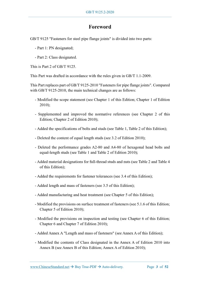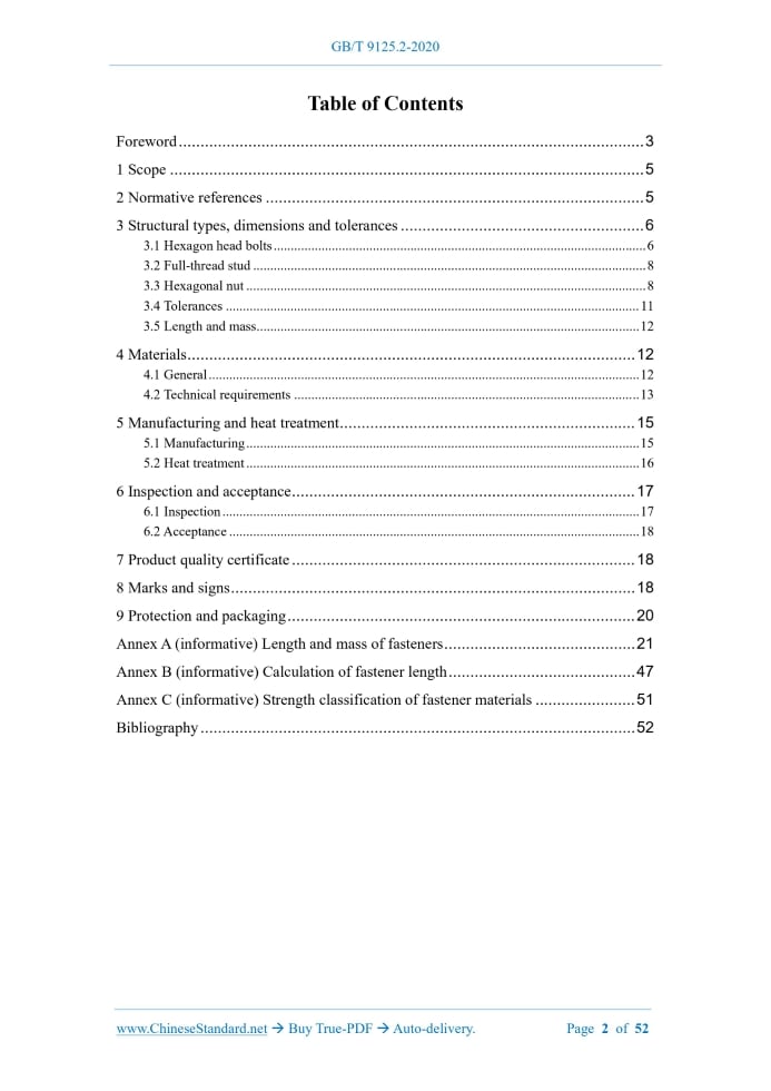Similar standardsGB/T 9125.2-2020: Fasteners for steel pipe flange joints - Part 2: Class designated---This is an excerpt. Full copy of true-PDF in English version (including equations, symbols, images, flow-chart, tables, and figures etc.), auto-downloaded/delivered in 9 seconds, can be purchased online: https://www.ChineseStandard.net/PDF.aspx/GBT9125.2-2020GB NATIONAL STANDARD OF THE PEOPLE’S REPUBLIC OF CHINA ICS 23.040.60 J 15 Replacing GB/T 9125-2010 Fasteners for steel pipe flange joints - Part 2: Class designated ISSUED ON: JULY 21, 2020 IMPLEMENTED ON: FEBRUARY 01, 2021 Issued by: State Administration for Market Regulation; Standardization Administration of the People's Republic of China. Table of ContentsForeword ... 3 1 Scope ... 5 2 Normative references ... 5 3 Structural types, dimensions and tolerances ... 6 3.1 Hexagon head bolts ... 6 3.2 Full-thread stud ... 8 3.3 Hexagonal nut ... 8 3.4 Tolerances ... 11 3.5 Length and mass ... 12 4 Materials ... 12 4.1 General ... 12 4.2 Technical requirements ... 13 5 Manufacturing and heat treatment ... 15 5.1 Manufacturing ... 15 5.2 Heat treatment ... 16 6 Inspection and acceptance ... 17 6.1 Inspection ... 17 6.2 Acceptance ... 18 7 Product quality certificate ... 18 8 Marks and signs ... 18 9 Protection and packaging ... 20 Annex A (informative) Length and mass of fasteners ... 21 Annex B (informative) Calculation of fastener length ... 47 Annex C (informative) Strength classification of fastener materials ... 51 Bibliography ... 52ForewordGB/T 9125 "Fasteners for steel pipe flange joints" is divided into two parts: - Part 1: PN designated; - Part 2: Class designated. This is Part 2 of GB/T 9125. This Part was drafted in accordance with the rules given in GB/T 1.1-2009. This Part replaces part of GB/T 9125-2010 "Fasteners for pipe flange joints". Compared with GB/T 9125-2010, the main technical changes are as follows: - Modified the scope statement (see Chapter 1 of this Edition; Chapter 1 of Edition 2010); - Supplemented and improved the normative references (see Chapter 2 of this Edition; Chapter 2 of Edition 2010); - Added the specifications of bolts and studs (see Table 1, Table 2 of this Edition); - Deleted the content of equal length studs (see 3.2 of Edition 2010); - Deleted the performance grades A2-80 and A4-80 of hexagonal head bolts and equal-length studs (see Table 1 and Table 2 of Edition 2010); - Added material designations for full-thread studs and nuts (see Table 2 and Table 4 of this Edition); - Added the requirements for fastener tolerances (see 3.4 of this Edition); - Added length and mass of fasteners (see 3.5 of this Edition); - Added manufacturing and heat treatment (see Chapter 5 of this Edition); - Modified the provisions on surface treatment of fasteners (see 5.1.6 of this Edition; Chapter 5 of Edition 2010); - Modified the provisions on inspection and testing (see Chapter 6 of this Edition; Chapter 6 and Chapter 7 of Edition 2010); - Added Annex A "Length and mass of fasteners" (see Annex A of this Edition); - Modified the contents of Class designated in the Annex A of Edition 2010 into Annex B (see Annex B of this Edition; Annex A of Edition 2010); Fasteners for steel pipe flange joints - Part 2: Class designated1 ScopeThis Part of GB/T 9125 specifies the structural types, dimensions and tolerances, materials, manufacturing and heat treatment, inspection and acceptance, product quality certificates, marks and signs, protection and packaging requirements for Class designated fasteners for steel pipe flange joints. This Part applies to fasteners for steel pipe flange connections (including hexagon head bolts, full-thread studs and nuts) specified in GB/T 9124.2 and GB/T 13402.2 Normative referencesThe following referenced documents are indispensable for the application of this document. For dated references, only the edition cited applies. For undated references, the latest edition of the referenced document (including any amendments) applies. GB/T 2, Fasteners -- Ends of parts with external thread GB/T 90.1, Fasteners -- Acceptance inspection GB/T 196, General purpose metric screw threads -- Basic dimensions GB/T 197, General purpose metric screw threads -- Tolerances GB/T 228.1, Metallic materials -- Tensile testing -- Part 1: Method of test at room temperature GB/T 699, Quality carbon structure steels GB/T 700, Carbon structural steels GB/T 1220, Stainless steel rod GB/T 1221, Heat-resistant steel bars GB/T 3077, Alloy structure steels GB/T 3098.1, Mechanical properties of fasteners -- Bolts, screws and studs GB/T 3098.2, Mechanical properties of fasteners -- Nuts nominal length meets the smaller value of the following items a) and b), their unmarked dimensional tolerances and geometric tolerances shall comply with the provisions for Class B products in GB/T 3103.1: a) greater than 10 d; b) greater than 150 mm. 3.4.3 The dimensional tolerance and geometric tolerance of nuts with thread size less than or equal to M16 shall comply with the provisions for Class A products in GB/T 3103.1. The dimensional tolerance and geometric tolerance of nuts with thread size greater than M16 shall comply with the provisions for Class B products in GB/T 3103.1. 3.4.4 The thread tolerance of bolts and studs shall comply with 6 g of GB/T 197. The thread tolerance of nuts shall comply with 6H of GB/T 197. 3.4.5 Unspecified fastener tolerances shall comply with the requirements of GB/T 3103.1. 3.5 Length and mass 3.5.1 For the length and mass of fasteners, refer to Annex A. 3.5.2 For the calculation of fastener length, refer to Annex B.4 Materials4.1 General 4.1.1 Fastener raw materials shall have quality certificates. Chemical composition analysis shall be conducted. For fastener raw materials with the same steel grade, the same smelting furnace number, the same cross-sectional dimensions, and the same heat treatment conditions, the sampling quantity shall be 1% of each batch and shall not be less than 1 piece. 4.1.2 The
