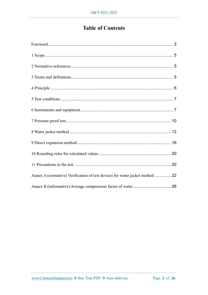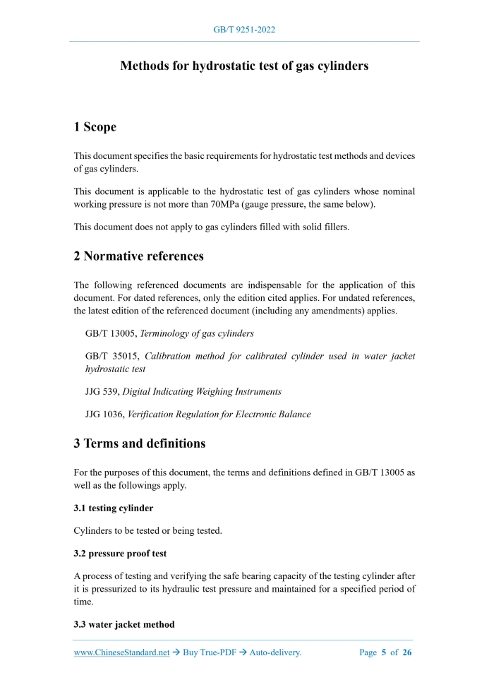Similar standardsGB/T 9251-2022: Methods for hydrostatic test of gas cylinders---This is an excerpt. Full copy of true-PDF in English version (including equations, symbols, images, flow-chart, tables, and figures etc.), auto-downloaded/delivered in 9 seconds, can be purchased online: https://www.ChineseStandard.net/PDF.aspx/GBT9251-2022NATIONAL STANDARD OF THE PEOPLE’S REPUBLIC OF CHINA ICS 23.020.30 CCS J 74 Replacing GB/T 9251-2011 Methods for hydrostatic test of gas cylinders Issued on. MARCH 09, 2022 Implemented on. OCTOBER 01, 2022 Issued by. State Administration for Market Regulation; Standardization Administration of the People's Republic of China. Table of ContentsForeword... 3 1 Scope... 5 2 Normative references... 5 3 Terms and definitions... 5 4 Principle... 6 5 Test conditions... 7 6 Instruments and equipment... 7 7 Pressure proof test... 10 8 Water jacket method... 12 9 Direct expansion method... 16 10 Rounding rules for calculated values... 20 11 Precautions in the test... 20 Annex A (normative) Verification of test devices for water jacket method... 22 Annex B (informative) Average compression factor of water... 261 ScopeThis document specifies the basic requirements for hydrostatic test methods and devices of gas cylinders. This document is applicable to the hydrostatic test of gas cylinders whose nominal working pressure is not more than 70MPa (gauge pressure, the same below). This document does not apply to gas cylinders filled with solid fillers.2 Normative referencesThe following referenced documents are indispensable for the application of this document. For dated references, only the edition cited applies. For undated references, the latest edition of the referenced document (including any amendments) applies. GB/T 13005, Terminology of gas cylinders GB/T 35015, Calibration method for calibrated cylinder used in water jacket hydrostatic test JJG 539, Digital Indicating Weighing Instruments JJG 1036, Verification Regulation for Electronic Balance3 Terms and definitionsFor the purposes of this document, the terms and definitions defined in GB/T 13005 as well as the followings apply. 3.1 testing cylinder Cylinders to be tested or being tested. 3.2 pressure proof test A process of testing and verifying the safe bearing capacity of the testing cylinder after it is pressurized to its hydraulic test pressure and maintained for a specified period of time. 3.5 special water jacket A special equipment for measuring the volumetric deformation of the testing cylinder during the hydrostatic test by water jacket method. 3.6 calibrated cylinder A bottle equipment that if the corresponding relationship between the calibration pressure and the expansion value has been determined, the expansion value shall have the characteristics of repeatability and linearity, and there will be no permanent deformation under the calibration pressure. It is used to verify the accuracy of the hydrostatic test device of gas cylinders. 3.7 calibrated gauge A pressure measuring instrument for verifying the pressure value of the test system. Its accuracy level shall not be less than that of other pressure measuring instruments. 3.8 reference zero point Zero reading on water volume measuring instrument. The error shall be the larger value of ±0.1% of the total volumetric deformation value and ±0.1mL.4 PrincipleThe hydrostatic test of gas cylinders uses water as the pressurized medium. Gradually increase the pressure in the testing cylinder to its hydrostatic test pressure according to the specified pressurization rate.5 Test conditions5.1 The test water shall be clean fresh water. When the testing cylinder is a chromium- containing alloy steel gas bottle, the chloride ion content in the test water shall not exceed 25mg/L. 5.2 The temperature of the test water shall not be lower than 5℃. The difference between it and the ambient temperature shall not be greater than 2℃.6 Instruments and equipment6.1 Basic requirements for test device 6.1.1 The testing cylinder shall be pressurized by a plunger pump, a pneumatic pump or other pressurizing device with stable pressure output. Use water as the pressurized medium. 6.1.3 Metal pipes shall generally be used for pressure-bearing pipeline. They shall be fixed. The connection with the test device and the measuring instrument shall have a good seal. The pressure-bearing capacity of the pressure-bearing pipeline shall meet the requirements of the hydrostatic test's pressure of the testing cylinder. 6.1.4 The special water jacket shall be made of stainless steel or other corrosion- resistant metal materials, with a certain rigidity. Make sure that it does not change in volume during the hydrostatic test. 6.1.5 The dimensions and materials of all associated piping of the hydrostatic test devices for water jacket method and direct expansion method shall be such that they do not deform under the weight of water. 6.1.6 The calibration of the calibrated cylinder shall comply with the provisions of GB/T 35015.The calibration data of the calibrated cylinder shall be able to meet the test requirements of the testing cylinder (at least three pressure levels). A clearly identifiable calibration certificate and label shall be attached. 6.2 Measuring instruments 6.2.1 Pressure measuring instrument 6.2.1.1 A pressure gauge and a calibrated gauge for calibration shall be installed on the 6.2.1.3 The range of the pressure measuring instrument shall be 1.5 times to 3 times the pressure of the hydrostatic test of the testing cylinder. The accuracy level of the pressure gauge shall not be lower than level 1.0. 6.2.2 Water volume measuring instrument 6.2.2.1 Electronic balances, measuring tubes or other suitable measuring instruments can be used as water volume measuring instruments. They are used to measure the total volumetric deformation value, volumetric residual deformation of the testing cylinder in the water jacket method and the total pressurized water volume in the direc