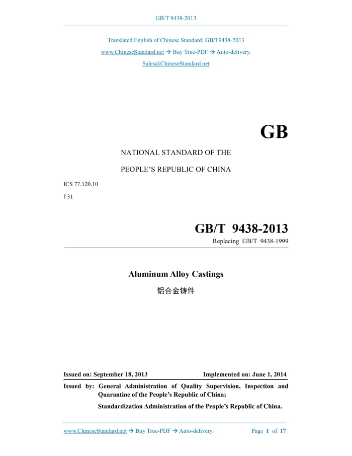 GB/T 9438-2013: Aluminum alloy castings Delivery: 9 seconds. True-PDF full-copy in English & invoice will be downloaded + auto-delivered via email. See step-by-step procedure Status: Valid GB/T 9438: Historical versions