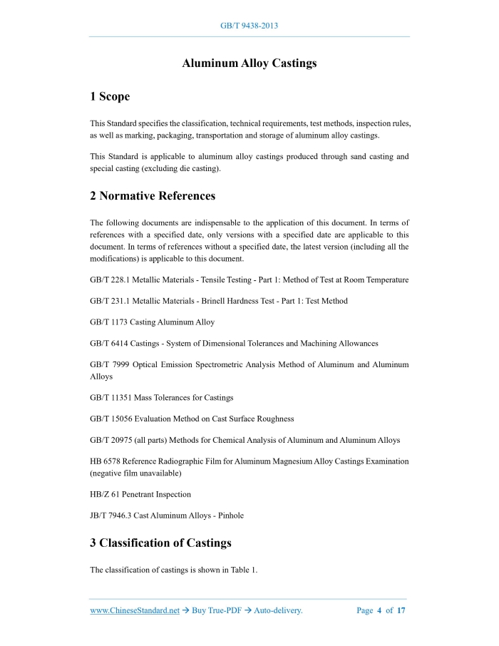 GB/T 9438-2013: Aluminum alloy castings---This is an excerpt. Full copy of true-PDF in English version (including equations, symbols, images, flow-chart, tables, and figures etc.), auto-downloaded/delivered in 9 seconds, can be purchased online: https://www.ChineseStandard.net/PDF.aspx/GBT9438-2013GB NATIONAL STANDARD OF THE PEOPLE’S REPUBLIC OF CHINA ICS 77.120.10 J 31 Replacing GB/T 9438-1999 Aluminum Alloy Castings ISSUED ON: SEPTEMBER 18, 2013 IMPLEMENTED ON: JUNE 1, 2014 Issued by: General Administration of Quality Supervision, Inspection and Quarantine of the People’s Republic of China; Standardization Administration of the People’s Republic of China. Table of ContentsForeword ... 3 1 Scope ... 4 2 Normative References ... 4 3 Classification of Castings ... 4 4 Technical Requirements ... 5 5 Test Methods ... 11 6 Inspection Rules ... 12 7 Marking, Packaging, Transportation and Storage ... 16 Aluminum Alloy Castings1 ScopeThis Standard specifies the classification, technical requirements, test methods, inspection rules, as well as marking, packaging, transportation and storage of aluminum alloy castings. This Standard is applicable to aluminum alloy castings produced through sand casting and special casting (excluding die casting).2 Normative ReferencesThe following documents are indispensable to the application of this document. In terms of references with a specified date, only versions with a specified date are applicable to this document. In terms of references without a specified date, the latest version (including all the modifications) is applicable to this document. GB/T 228.1 Metallic Materials - Tensile Testing - Part 1: Method of Test at Room Temperature GB/T 231.1 Metallic Materials - Brinell Hardness Test - Part 1: Test Method GB/T 1173 Casting Aluminum Alloy GB/T 6414 Castings - System of Dimensional Tolerances and Machining Allowances GB/T 7999 Optical Emission Spectrometric Analysis Method of Aluminum and Aluminum Alloys GB/T 11351 Mass Tolerances for Castings GB/T 15056 Evaluation Method on Cast Surface Roughness GB/T 20975 (all parts) Methods for Chemical Analysis of Aluminum and Aluminum Alloys HB 6578 Reference Radiographic Film for Aluminum Magnesium Alloy Castings Examination (negative film unavailable) HB/Z 61 Penetrant Inspection JB/T 7946.3 Cast Aluminum Alloys - Pinhole3 Classification of CastingsThe classification of castings is shown in Table 1. lower than the provisions of GB/T 1173. 4.3.3 When there are other requirements for the mechanical properties of castings, the technical requirements and inspection methods shall be stipulated in the drawings or technical agreements after negotiation between the supply-side and the demand-side. 4.4 Geometrical Shapes, Dimensions and Weight Tolerances 4.4.1 The geometrical shapes and dimensions of the castings shall comply with the requirements of the drawings, and the dimensional tolerances of the castings shall comply with the provisions of GB/T 6414. 4.4.2 The weight of the castings shall comply with the requirements of the drawings or technical agreements, and the weight tolerances of the castings shall comply with the provisions of GB/T 11351. 4.5 Surface Quality 4.5.1 The surface roughness of the castings shall comply with the requirements of the drawings or technical agreements. 4.5.2 The castings shall be clean and free of burrs and trimmings. The pouring and casting heads on the non-machined surface shall be cleaned to be flush with the surface of the castings. The remaining amount of the pouring and casting heads on the surface to be machined shall be within the margin range specified in the drawings. If there is no special provision, it shall generally not be 5 mm higher than the surface of the castings, but it shall not affect the radiographic inspection. 4.5.3 No cold shuts, cracks, shrinkage cavities, penetrating defects and serious defects (such as: insufficient pouring and mechanical damage, etc.) are not allowed on the surface of the castings. 4.5.4 Any defects that can be removed by machining are allowed on the surface of the castings to be machined. 4.5.5 The area on the castings used as a machining reference shall be flat. 4.5.6 Unless otherwise specified, on the non-machined surface of metal castings, traces, such as: mold parting, misaligned boxes, ejector pins and exhaust plugs, are allowed, but the protrusions shall not exceed the surface by 1 mm, or the recesses shall not be 0.5 mm lower than the surface. 4.5.7 The non-machined surface and machined surface of sand mold and metal mold castings are generally allowed to have: a) Single holes On the non-machined surface, the maximum diameter of single holes shall be not greater than 3 mm, and the depth shall not exceed 1/3 of the wall thickness. On the installation 4.7.7 The castings shall be repaired by welding in the as-cast state. The castings that require welding repair after heat treatment shall be heat treated in their original state after welding repair. Castings after heat treatment shall be re-inspected for mechanical properties of single cast or attached cast specimens. When the area of the argon arc welding zone is less than 2 cm2, the distance between welding zones shall be not less than 100 mm. With the consent of the demand-side, heat treatment may not be performed after welding repairs, but there shall be no more than 5 spots on the same casting. ZL301 and ZL305 alloy castings must be heat treated in their original state after welding repair. 4.7.8 The welding repair of the castings shall be carried out in accordance with the provisions of the welding repair process. There must be no defects, such as: cracks, incomplete penetration or incomplete fusion in the welding repair area. After welding repairs, Category-I and Category- II castings must be inspected by X-ray photography (or other methods). The inspection area shall be not less than twice the welding repair area. The internal quality of the welding repair area shall c