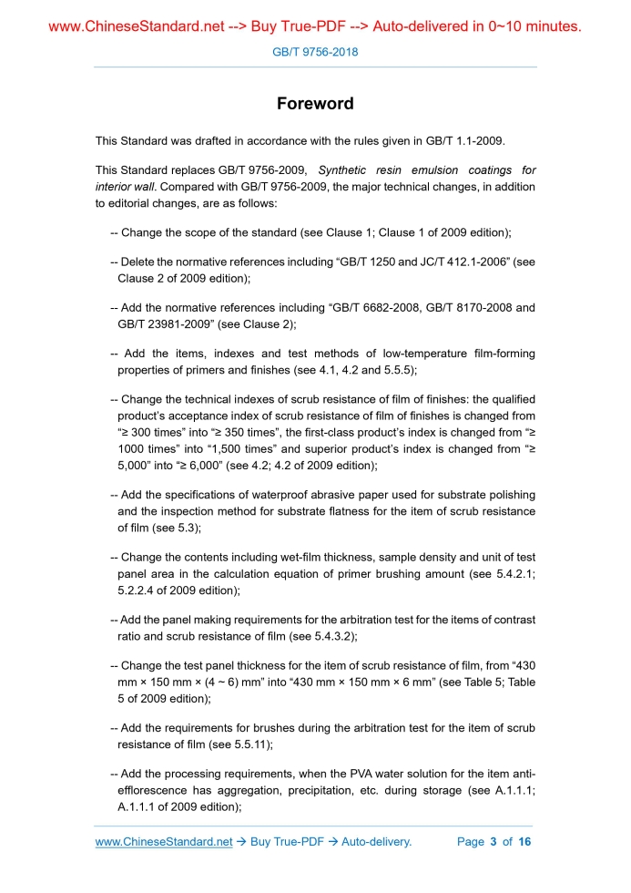 GB/T 9756-2018: Synthetic resin emulsion coatings for interior wall---This is an excerpt. Full copy of true-PDF in English version (including equations, symbols, images, flow-chart, tables, and figures etc.), auto-downloaded/delivered in 9 seconds, can be purchased online: https://www.ChineseStandard.net/PDF.aspx/GBT9756-2018GB NATIONAL STANDARD OF THE PEOPLE’S REPUBLIC OF CHINA ICS 87.040 G 51 Replacing GB/T 9756-2009 Synthetic resin emulsion coatings for interior wall Issued on. JUNE 7, 2018 Implemented on. JANUARY 1, 2019 Issued by. State Administration for Market Regulation; Standardization Administration of the People's Republic of China. Table of ContentsForeword... 3 1 Scope... 5 2 Normative references... 5 3 Classification and grading... 6 4 Requirements... 6 5 General requirements... 7 6 Inspection rules... 12 7 Marking, packaging and storage... 13 Annex A (Normative) Method for testing anti-efflorescence... 14ForewordThis Standard was drafted in accordance with the rules given in GB/T 1.1-2009. This Standard replaces GB/T 9756-2009, Synthetic resin emulsion coatings for interior wall. Compared with GB/T 9756-2009, the major technical changes, in addition to editorial changes, are as follows. -- Change the scope of the standard (see Clause 1; Clause 1 of 2009 edition); -- Delete the normative references including “GB/T 1250 and JC/T 412.1-2006” (see Clause 2 of 2009 edition); -- Add the normative references including “GB/T 6682-2008, GB/T 8170-2008 and GB/T 23981-2009” (see Clause 2); -- Add the items, indexes and test methods of low-temperature film-forming properties of primers and finishes (see 4.1, 4.2 and 5.5.5); -- Change the technical indexes of scrub resistance of film of finishes. the qualified product’s acceptance index of scrub resistance of film of finishes is changed from “≥ 300 times” into “≥ 350 times”, the first-class product’s index is changed from “≥ 1000 times” into “1,500 times” and superior product’s index is changed from “≥ 5,000” into “≥ 6,000” (see 4.2; 4.2 of 2009 edition); -- Add the specifications of waterproof abrasive paper used for substrate polishing and the inspection method for substrate flatness for the item of scrub resistance of film (see 5.3); -- Change the contents including wet-film thickness, sample density and unit of test panel area in the calculation equation of primer brushing amount (see 5.4.2.1; 5.2.2.4 of 2009 edition); -- Add the panel making requirements for the arbitration test for the items of contrast ratio and scrub resistance of film (see 5.4.3.2); -- Change the test panel thickness for the item of scrub resistance of film, from “430 mm × 150 mm × (4 ~ 6) mm” into “430 mm × 150 mm × 6 mm” (see Table 5; Table 5 of 2009 edition); -- Add the requirements for brushes during the arbitration test for the item of scrub resistance of film (see 5.5.11); -- Add the processing requirements, when the PVA water solution for the item anti- efflorescence has aggregation, precipitation, etc. during storage (see A.1.1.1; A.1.1.1 of 2009 edition); -- Change the storage period of the PVA-iron blue water dispersion liquid, from “not exceeding 1 month” into “not exceeding 15 d” (see A.1.1.2; A.1.1.2 of 2009 edition); -- Change the height of the test solution immersion test panels for the item of anti- efflorescence, from “greater than 1/2 of the test panel thickness” into “greater than 2/3 of the test panel thickness” (see A.3.2; A.3.2 of 2009 edition). This Standard was proposed by the China Petroleum and Chemical Industry Association. This Standard shall be under the jurisdiction of National Technical Committee 5 on Paints and Pigments of Standardization Administration of China (SAC/TC 5). The drafting organizations of this Standard. CNOOC Changzhou Paint Chemical Research Institute, Dow Chemical Company (China) Investment Co., Ltd., ICI Swire Paints (Shanghai) Co., Ltd., Nippon Paint (China) Co., Ltd., Shanghai Research Institute of Paint and Coatings Co., Ltd., Guangdong Carpoly Technological Materials Co., Ltd., Foshan Shunde District BATF Industrial Co., Ltd., Guangdong Huarun Paints Co., Ltd., 3trees Paint Co., Ltd., Guangdong Bardese Chemical Co., Ltd., Zhejiang Huade New Materials Co., Ltd., Shenzhen Grandland Environmental Protection Paint Co., Ltd., Caparol (China) Co., Ltd., Hebei Tianxin Construction Group Co., Ltd., First New Material Technology Development Co., Ltd., Zhanchen New Material Group Co., Ltd., Zhejiang Transfar Paint Co., Ltd., China Paint MFG (Shenzhen) Co., Ltd., Hebei Chenyang Industry and Trade Group Co., Ltd., Ningbo Xinan Coating Co., Ltd., Shandong Lehua Paint Industry Co., Ltd., Alligator Paint (Shanghai) Co., Ltd., Northwest Yongxin Paint Co., Ltd., DMT Production (Beijing) Co., Ltd., Bauhinia Coatings (Shanghai) Co., Ltd., BASF New Materials Co., Ltd., Jiangsu Elephant Coating Co., Ltd., Maco Group Co., Ltd., Kansai Paint (China) Investment Co., Ltd., Antext Chemical (Zhongshan) Co., Ltd., Xiang Jiang Paint Technology Co., Ltd., Shanghai Jianke Technical Assessment of Construction Co., Ltd. The main drafters of this Standard. Liu Lin, Tang Ying, Nan Xuan, Wang Yan, Gao Jidong, Zhang Weiqun, Luo Zhiqing, Liang Piaojian, Kou Hui, Lin Changqing, Li Jinming, Wang Weidong, Xu Xinxiang, Xiong Jun, Feng Xijie, Zhan Mingjia, Ye Shuqing, Wu Yong, Lin Qingwen, Hu Zhongyuan, Hu Jinping, Shen Xiaozhong, Xu Haifeng, Li Huaming, Yang Guoping, Xing Jun, Wang Fei, Yang Shaowu, Liu Fengxian, Meng Xianfeng, Yang Liwen, Zheng Daming, Hu Xiaozhen, Han Chaozheng. The previous editions of the standard replaced by this Standard are as follows. -- GB/T 9756-1988, GB/T 9756-1995, GB/T 9756-2001, GB/T 9756-2009. Synthetic resin emulsion coatings for interior wall1 ScopeThis Standard specifies the classification and grading, requirements, test methods, inspection rules and marking, packaging and storage, etc. for synthetic resin emulsion coatings for interior 