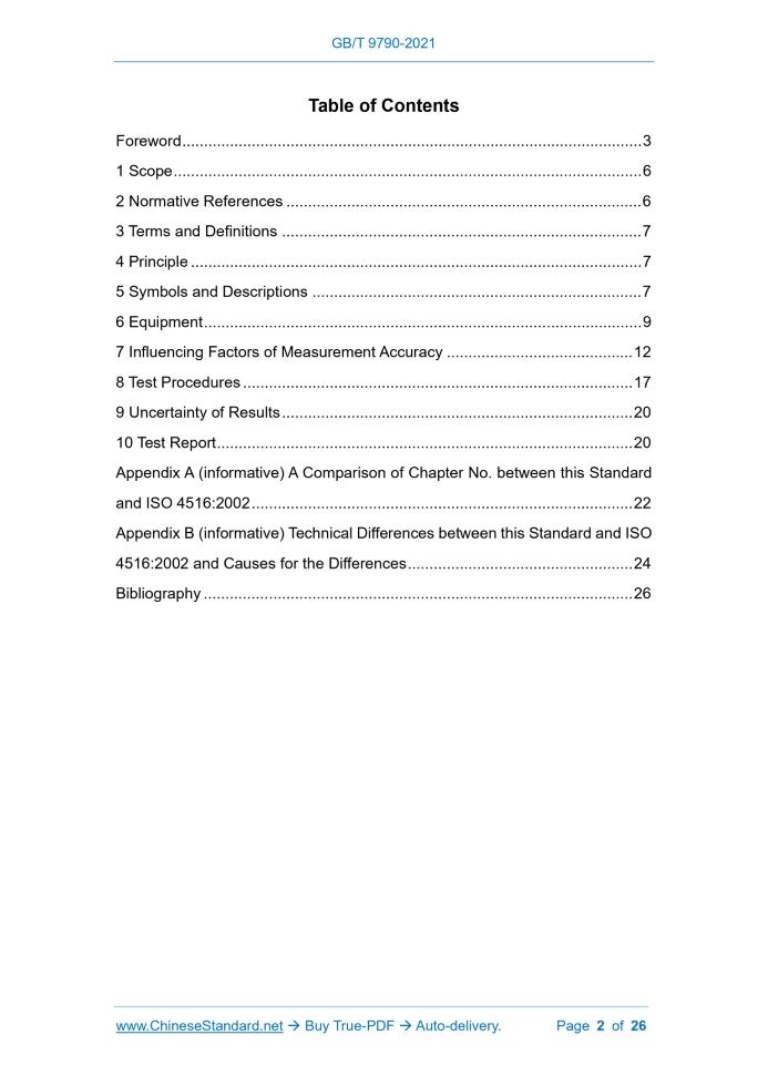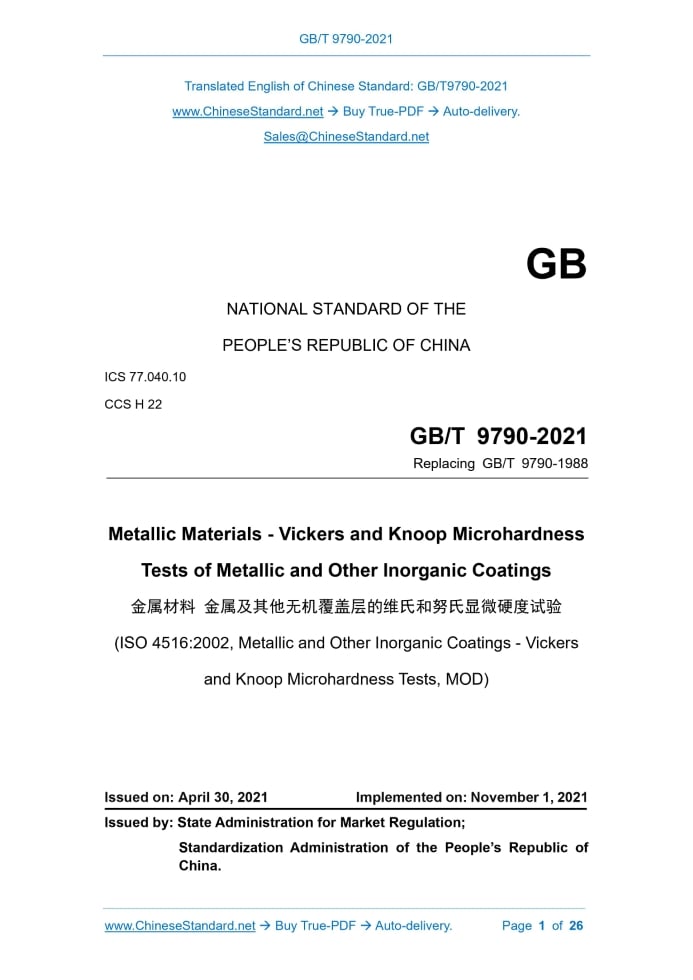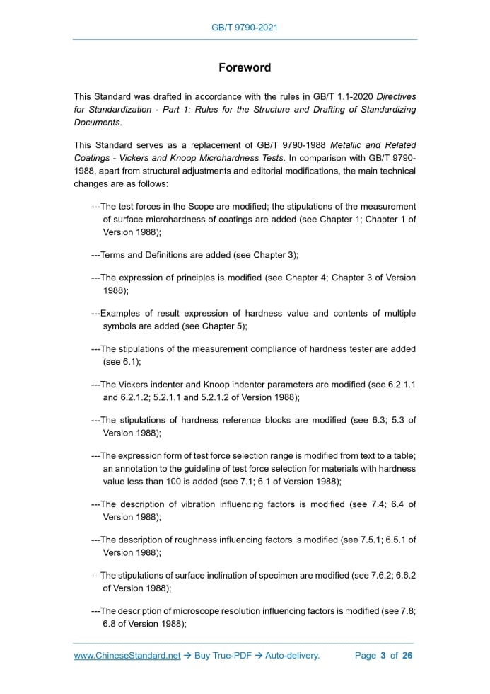 Similar standardsGB/T 9790-2021: Metallic materials - Vickers and Knoop microhardness tests of metallic and other inorganic coatings---This is an excerpt. Full copy of true-PDF in English version (including equations, symbols, images, flow-chart, tables, and figures etc.), auto-downloaded/delivered in 9 seconds, can be purchased online: https://www.ChineseStandard.net/PDF.aspx/GBT9790-2021 GB NATIONAL STANDARD OF THE PEOPLE’S REPUBLIC OF CHINA ICS 77.040.10 CCS H 22 Replacing GB/T 9790-1988 Metallic Materials - Vickers and Knoop Microhardness Tests of Metallic and Other Inorganic Coatings (ISO 4516:2002, Metallic and Other Inorganic Coatings - Vickers and Knoop Microhardness Tests, MOD) ISSUED ON: APRIL 30, 2021 IMPLEMENTED ON: NOVEMBER 1, 2021 Issued by: State Administration for Market Regulation; Standardization Administration of the People’s Republic of China. Table of ContentsForeword ... 3 1 Scope ... 6 2 Normative References ... 6 3 Terms and Definitions ... 7 4 Principle ... 7 5 Symbols and Descriptions ... 7 6 Equipment ... 9 7 Influencing Factors of Measurement Accuracy ... 12 8 Test Procedures ... 17 9 Uncertainty of Results ... 20 10 Test Report ... 20 Appendix A (informative) A Comparison of Chapter No. between this Standard and ISO 4516:2002 ... 22 Appendix B (informative) Technical Differences between this Standard and ISO 4516:2002 and Causes for the Differences ... 24 Bibliography ... 26ForewordThis Standard was drafted in accordance with the rules in GB/T 1.1-2020 Directives for Standardization - Part 1: Rules for the Structure and Drafting of Standardizing Documents. This Standard serves as a replacement of GB/T 9790-1988 Metallic and Related Coatings - Vickers and Knoop Microhardness Tests. In comparison with GB/T 9790- 1988, apart from structural adjustments and editorial modifications, the main technical changes are as follows: ---The test forces in the Scope are modified; the stipulations of the measurement of surface microhardness of coatings are added (see Chapter 1; Chapter 1 of Version 1988); ---Terms and Definitions are added (see Chapter 3); ---The expression of principles is modified (see Chapter 4; Chapter 3 of Version 1988); ---Examples of result expression of hardness value and contents of multiple symbols are added (see Chapter 5); ---The stipulations of the measurement compliance of hardness tester are added (see 6.1); ---The Vickers indenter and Knoop indenter parameters are modified (see 6.2.1.1 and 6.2.1.2; 5.2.1.1 and 5.2.1.2 of Version 1988); ---The stipulations of hardness reference blocks are modified (see 6.3; 5.3 of Version 1988); ---The expression form of test force selection range is modified from text to a table; an annotation to the guideline of test force selection for materials with hardness value less than 100 is added (see 7.1; 6.1 of Version 1988); ---The description of vibration influencing factors is modified (see 7.4; 6.4 of Version 1988); ---The description of roughness influencing factors is modified (see 7.5.1; 6.5.1 of Version 1988); ---The stipulations of surface inclination of specimen are modified (see 7.6.2; 6.6.2 of Version 1988); ---The description of microscope resolution influencing factors is modified (see 7.8; 6.8 of Version 1988); ---The influence of the microstructure of coatings on the indentation location is added (see 7.9); ---The description of a summary of the measurement process is added (see 8.1); ---The content of coating thickness when Vickers indenter is used is modified (see 8.3.1; 7.2.1 of Version 1988); ---The content of specimen preparation is modified (see 8.3.2; 7.2.2 of Version 1988); ---The content of indentation is modified (see 8.3.3; 7.2.3 of Version 1988); ---The content of the measurement of coating surface is modified (see 8.4; 7.3 of Version 1988); ---The content of optical measurement is modified (see 8.6; 7.5 of Version 1988); ---The stipulations of length difference of two diagonals are modified (see 8.7; 8.6 of Version 1988); ---The content of alternative specimen is modified (see 8.8; 7.7 of Version 1988); ---The uncertainty of results is added (see Chapter 9). This Standard adopts the re-drafting method in the modification and adoption of ISO 4516:2002 Metallic and Other Inorganic Coatings - Vickers and Knoop Microhardness Tests. In comparison with ISO 4516:2002, this Standard has many structural adjustments. Appendix A lists a table of comparison of chapter No. between this Standard and ISO 4516:2002. There are technical differences between this Standard and ISO 4516:2002. The clauses involved in these differences have been marked by a vertical single line () on the outer margins. Appendix B provides a table of technical differences between this Standard and ISO 4516:2002 and the causes for the differences for reference. This Standard makes the following editorial modifications: ---The title of the Standard is modified into Metallic Materials - Vickers and Knoop Microhardness Tests of Metallic and Other Inorganic Coatings; ---The bibliography of ISO 4516:2002 is deleted. Please be noted that certain content of this document might involve patents. The institution issuing this document does not undertake the responsibility of identifying these patents. Metallic Materials - Vickers and Knoop Microhardness Tests of Metallic and Other Inorganic Coatings1 ScopeThis Standard specifies the principles, symbols and descriptions, equipment, influencing factors of measurement accuracy, test procedures, uncertainty of results and test reports of Vickers and Knoop microhardness tests of metallic and other inorganic coatings. This Standard is applicable to the determination of multiple coatings, such as: electrodeposited coatings, autocatalytic coatings, sprayed aluminum coatings and aluminum anodized coatings, etc. During the determination, the test force is generally not greater than 9.807 N (1 kgf). 8.3 of this Standard is applicable to the determination of microhardness of coating cross-sectio