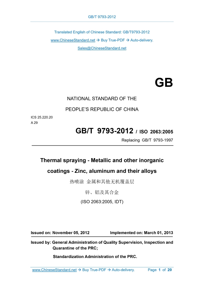 GB/T 9793-2012: Thermal spraying -- Metallic and other inorganic coatings -- Zinc, aluminium and their alloys Delivery: 9 seconds. True-PDF full-copy in English & invoice will be downloaded + auto-delivered via email. See step-by-step procedure Status: Valid GB/T 9793: Historical versions