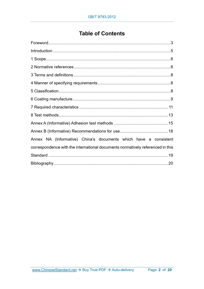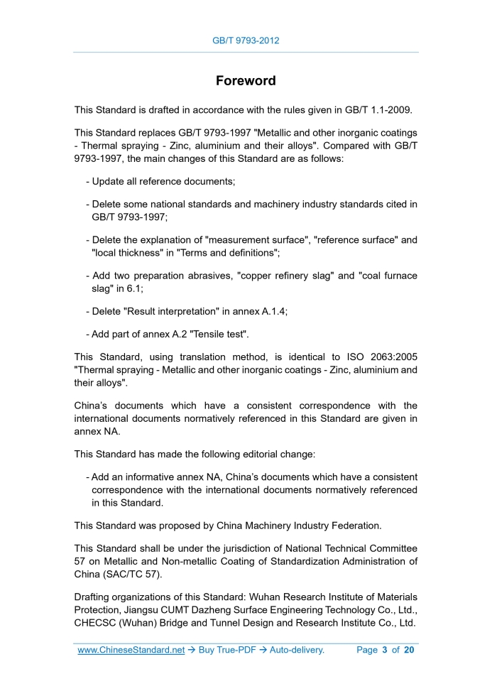 Similar standardsGB/T 9793-2012: Thermal spraying -- Metallic and other inorganic coatings -- Zinc, aluminium and their alloys---This is an excerpt. Full copy of true-PDF in English version (including equations, symbols, images, flow-chart, tables, and figures etc.), auto-downloaded/delivered in 9 seconds, can be purchased online: https://www.ChineseStandard.net/PDF.aspx/GBT9793-2012 GB NATIONAL STANDARD OF THE PEOPLE’S REPUBLIC OF CHINA ICS 25.220.20 A 29 GB/T 9793-2012 / ISO 2063:2005 Replacing GB/T 9793-1997 Thermal spraying - Metallic and other inorganic coatings - Zinc, aluminum and their alloys (ISO 2063:2005, IDT) ISSUED ON: NOVEMBER 05, 2012 IMPLEMENTED ON: MARCH 01, 2013 Issued by: General Administration of Quality Supervision, Inspection and Quarantine of the PRC; Standardization Administration of the PRC. Table of ContentsForeword ... 3 Introduction ... 5 1 Scope ... 6 2 Normative references ... 6 3 Terms and definitions ... 8 4 Manner of specifying requirements ... 8 5 Classification ... 8 6 Coating manufacture ... 9 7 Required characteristics ... 11 8 Test methods ... 13 Annex A (Informative) Adhesion test methods ... 15 Annex B (Informative) Recommendations for use... 18 Annex NA (Informative) China’s documents which have a consistent correspondence with the international documents normatively referenced in this Standard ... 19 Bibliography ... 20ForewordThis Standard is drafted in accordance with the rules given in GB/T 1.1-2009. This Standard replaces GB/T 9793-1997 "Metallic and other inorganic coatings - Thermal spraying - Zinc, aluminium and their alloys". Compared with GB/T 9793-1997, the main changes of this Standard are as follows: - Update all reference documents; - Delete some national standards and machinery industry standards cited in GB/T 9793-1997; - Delete the explanation of "measurement surface", "reference surface" and "local thickness" in "Terms and definitions"; - Add two preparation abrasives, "copper refinery slag" and "coal furnace slag" in 6.1; - Delete "Result interpretation" in annex A.1.4; - Add part of annex A.2 "Tensile test". This Standard, using translation method, is identical to ISO 2063:2005 "Thermal spraying - Metallic and other inorganic coatings - Zinc, aluminium and their alloys". China’s documents which have a consistent correspondence with the international documents normatively referenced in this Standard are given in annex NA. This Standard has made the following editorial change: - Add an informative annex NA, China’s documents which have a consistent correspondence with the international documents normatively referenced in this Standard. This Standard was proposed by China Machinery Industry Federation. This Standard shall be under the jurisdiction of National Technical Committee 57 on Metallic and Non-metallic Coating of Standardization Administration of China (SAC/TC 57). Drafting organizations of this Standard: Wuhan Research Institute of Materials Protection, Jiangsu CUMT Dazheng Surface Engineering Technology Co., Ltd., CHECSC (Wuhan) Bridge and Tunnel Design and Research Institute Co., Ltd. Thermal spraying - Metallic and other inorganic coatings - Zinc, aluminum and their alloys1 ScopeThis Standard applies to thermal-sprayed metallic coatings for the protection of iron and steel against corrosion by applying zinc or aluminium or their alloys to uncoated surface to be protected. This Standard deals with characteristic properties and gives test methods for coatings obtained by the spraying of zinc and aluminium and their alloys for the general purpose of corrosion protection. This Standard gives firstly the definition, classification and symbols for these coatings in relation to their thickness. It then deals with the preparation of surfaces, application of coatings and their characteristic properties: namely, thickness, appearance and adhesion. Finally it gives test methods for checking these properties. For other metals some of the provisions are valid and can be adopted by agreement between the interested parties.2 Normative referencesThe following documents are indispensable for the application of this document. For the dated references, only the editions with the dates indicated are applicable to this document. For the undated references, the latest edition (including all the amendments) are applicable to this document. ISO 1463 Metallic and oxide coatings - Measurement of coating thickness - Microscopical method ISO 2064:1996 Metallic and other inorganic coatings - Definitions and conventions concerning the measurement of thickness ISO 2178 Non-magnetic coatings on magnetic substrates - Measurement of coating thickness - Magnetic method ISO 8501-1 Preparation of steel substrates before application of paints and related products - Visual assessment of surface cleanliness - Part 1: Rust grades and preparation grades of uncoated steel substrates and of steel ......Source: Above contents are excerpted from the full-copy PDF -- translated/reviewed by: www.ChineseStandard.net / Wayne Zheng et al. Tips & Frequently Asked Questions:Question 1: How long will the true-PDF of English version of GB/T 9793-2012 be delivered?Answer: The full copy PDF of English version of GB/T 9793-2012 can be downloaded in 9 seconds, and it will also be emailed to you in 9 seconds (double mechanisms to ensure the delivery reliably), with PDF-invoice.Question 2: Can I share the purchased PDF of GB/T 9793-2012_English with my colleagues?Answer: Yes. The purchased PDF of GB/T 9793-2012_English will be deemed to be sold to your employer/organization who actually paid for it, including your colleagues and your employer's intranet.Question 3: Does the price include tax/VAT?Answer: Yes. Our tax invoice, downloaded/delivered in 9 seconds, includes all tax/VAT and complies with 100+ countries' tax regulations (tax exempted in 100+ countries) -- See Avoidance of Double Taxation Agreements (DTAs): List of DTAs signed between Singapore and 100+ countries