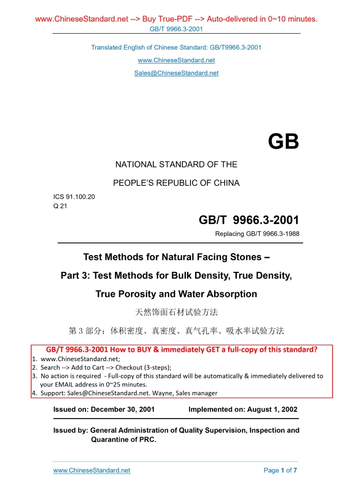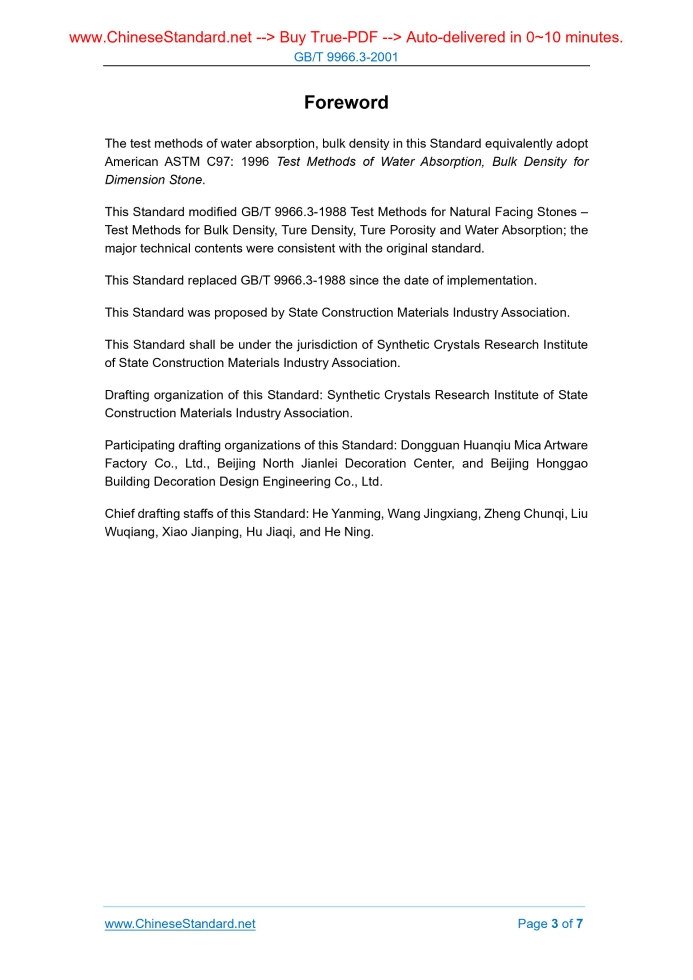 GB/T 9966.3-2001: Test methods for natural facing stones -- Part 3: Test methods for bulk density, true density, true porosity and water absorption Delivery: 9 seconds. True-PDF full-copy in English & invoice will be downloaded + auto-delivered via email. See step-by-step procedure Status: Obsolete GB/T 9966.3: Historical versions