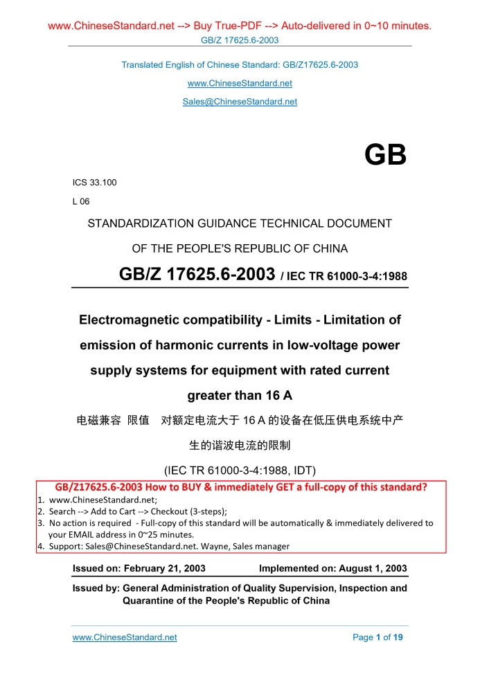 GBZ17625.6-2003: Electromagnetic compatibility -- Limits -- Limitation of emission of harmonic currents in low-voltage power supply systems for equipment with rated current greater than 16A Delivery: 9 seconds. True-PDF full-copy in English & invoice will be downloaded + auto-delivered via email. See step-by-step procedure Status: Valid