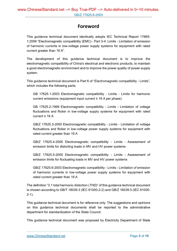 Similar standardsGB/Z 17625.6-2003: Electromagnetic compatibility -- Limits -- Limitation of emission of harmonic currents in low-voltage power supply systems for equipment with rated current greater than 16A---This is an excerpt. Full copy of true-PDF in English version (including equations, symbols, images, flow-chart, tables, and figures etc.), auto-downloaded/delivered in 9 seconds, can be purchased online: https://www.ChineseStandard.net/PDF.aspx/GBZ17625.6-2003 GB ICS 33.100 L 06 STANDARDIZATION GUIDANCE TECHNICAL DOCUMENT OF THE PEOPLE'S REPUBLIC OF CHINA GB/Z 17625.6-2003 / IEC TR 61000-3-4.1988 Electromagnetic compatibility - Limits - Limitation of emission of harmonic currents in low-voltage power supply systems for equipment with rated current greater than 16 A (IEC TR 61000-3-4.1988, IDT) Issued on: FEBRUARY 21, 2003 Implemented on: AUGUST 1, 2003 Issued by. General Administration of Quality Supervision, Inspection and Quarantine of the People's Republic of China Table of ContentsForeword... 3 IEC Introduction... 5 1 Scope... 7 2 Normative references... 8 3 Terms and definitions... 9 4 General requirements... 11 5 Connection procedures for equipment... 12 6 Product documentation... 14 7 Methods for type tests... 15ForewordThis guidance technical document identically adopts IEC Technical Report 17665- 1.2006 “Electromagnetic compatibility (EMC) - Part 3-4.Limits - Limitation of emission of harmonic currents in low-voltage power supply systems for equipment with rated current greater than 16 A”. The development of this guidance technical document is to improve the electromagnetic compatibility of China's electrical and electronic products, to maintain a good electromagnetic environment and to improve the power quality of power supply system. This guidance technical document is Part 6 of “Electromagnetic compatibility - Limits”, which includes the following parts. GB 17625.1-2003 Electromagnetic compatibility - Limits - Limits for harmonic current emissions (equipment input current ≤ 16 A per phase) GB 17625.2-1999 Electromagnetic compatibility - Limits - Limitation of voltage fluctuations and flicker in low-voltage supply systems for equipment with rated current ≤ 16 A GB/Z 17625.3-2000 Electromagnetic compatibility - Limits - Limitation of voltage fluctuations and flicker in low-voltage power supply systems for equipment with rated current greater than 16 A GB/Z 17625.4-2000 Electromagnetic compatibility - Limits - Assessment of emission limits for distorting loads in MV and HV power systems GB/Z 17625.5-2000 Electromagnetic compatibility - Limits - Assessment of emission limits for fluctuating loads in MV and HV power systems GB/Z 17625.6-2003 Electromagnetic compatibility - Limits - Limitation of emission of harmonic currents in low-voltage power supply systems for equipment with rated current greater than 16 A The definition “3.1 total harmonic distortion (THD)” of this guidance technical document is chosen according to GB/T 18039.3 (IEC 61000-2-2) and GB/Z 18039.5 (IEC 61000- 2-1). This guidance technical document is for reference only. The suggestions and opinions on this guidance technical documents shall be reported to the administrative department for standardization of the State Council. This guidance technical document was proposed by Electricity Department of State Electromagnetic compatibility - Limits - Limitation of emission of harmonic currents in low-voltage power supply systems for equipment with rated current greater than 16 A1 ScopeThis guidance technical document deals with the emission of disturbances due to harmonics. This guidance technical document is applicable to electrical and electronic equipment with a rated input current exceeding 16 A per phase and intended to be connected to public low-voltage a.c. distribution systems of the following types. - nominal voltage up to 240 V, single-phase, two or three wires; - nominal voltage up to 600 V, three-phase, three or four wires; - nominal frequency 50 Hz. Other distribution systems are excluded. Tests according to this guidance technical document are type tests of complete pieces of equipment, for example a speed variable fan, and not of components, for example a converter. Connection of this equipment to the supply generally requires special agreement between the supply authority and the consumer. This consent will depend upon several factors including the expected levels of disturbance caused by the equipment and the actual situation at the connection point to the power supply system. These recommendations specify the information required to enable a supply authority to assess equipment regarding harmonic disturbance and to decide whether or not the equipment is acceptable for connection with regard to the harmonic distortion aspect. NOTE 1.For these types of equipment only general recommendations on assessment of disturbances can be given. There is no guarantee that the connection of equipment complying with these recommendations will be allowed in all cases, as the consent to connect equipment to the supply depends on the level of disturbance caused by the equipment and the load conditions in the network. NOTE 2.This guidance technical document can also be applied to equipment with a lower rated ......Source: Above contents are excerpted from the full-copy PDF -- translated/reviewed by: www.ChineseStandard.net / Wayne Zheng et al. Tips & Frequently Asked Questions:Question 1: How long will the true-PDF of English version of GBZ17625.6-2003 be delivered?Answer: The full copy PDF of English version of GBZ17625.6-2003 can be downloaded in 9 seconds, and it will also be emailed to you in 9 seconds (double mechanisms to ensure the delivery reliably), with PDF-invoice.Question 2: Can I share the purchased PDF of GBZ17625.6-2003_English with my colleagues?Answer: Yes. The purchased PDF of GBZ17625.6-2003_English will be deemed to be sold to your employer/organization who actually paid for it